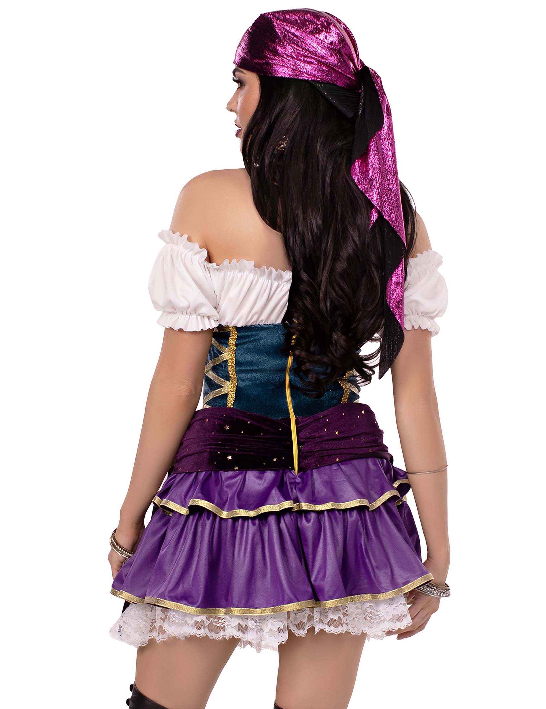 Ce déguisement de bohémienne sexy luxe pour femme se compose d’une robe courte et cintrée, dotée d’un zip discret dans le dos pour un enfilage facile. Le bustier imite un corsage lacé, tandis que la jupe à volants violette s’anime de reflets satinés. Une ceinture décorée de piécettes métalliques est cousue à l’ensemble pour souligner les hanches avec éclat. Le bandeau brillant assorti, porté sur la tête, apporte la touche finale à ce look ensorcelant. Parfait pour incarner une bohémienne mystérieuse et séduisante lors de vos soirées à thème.