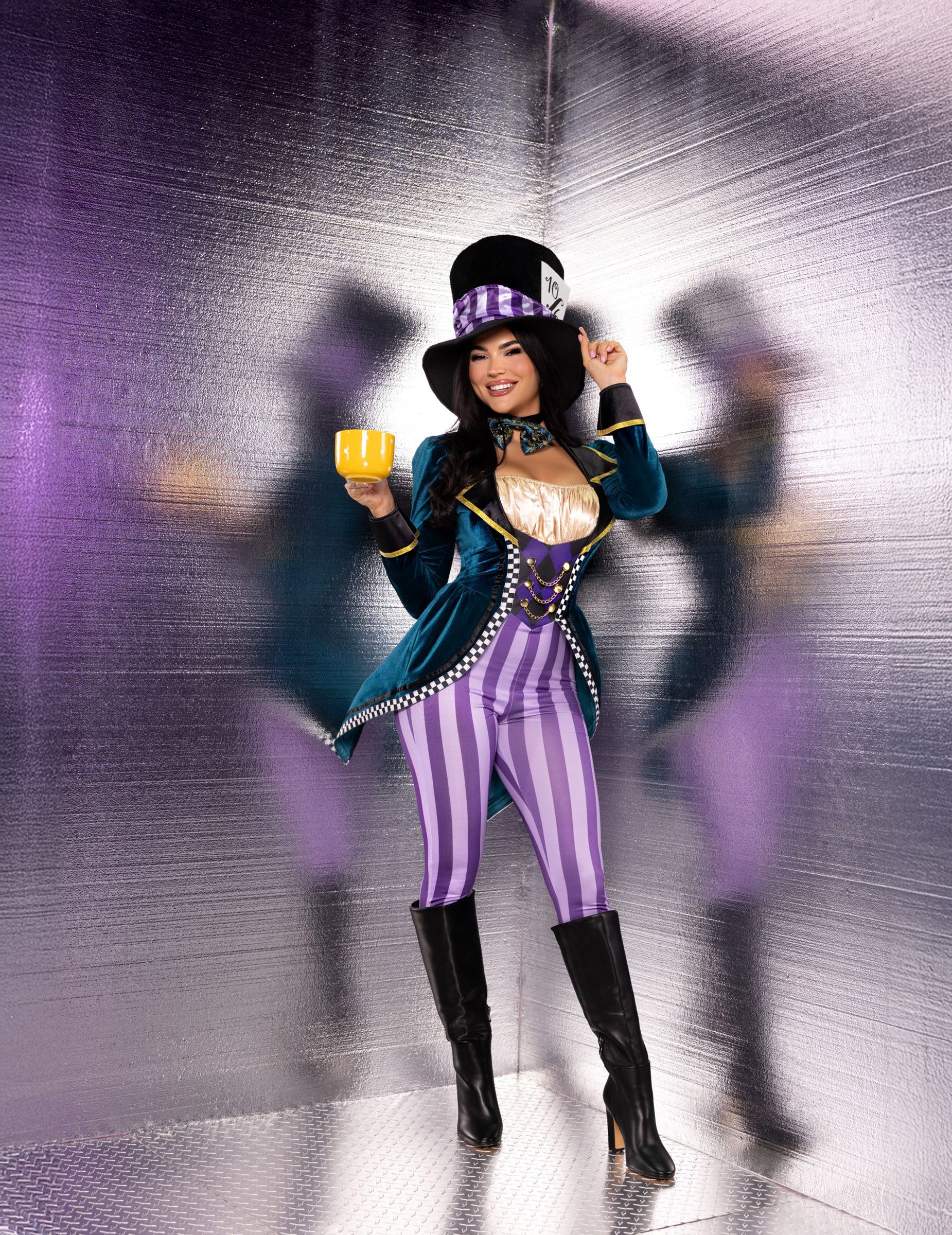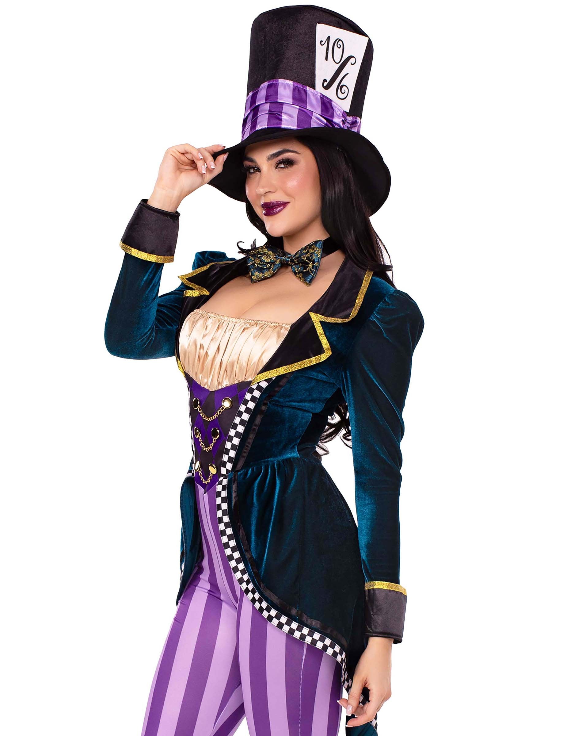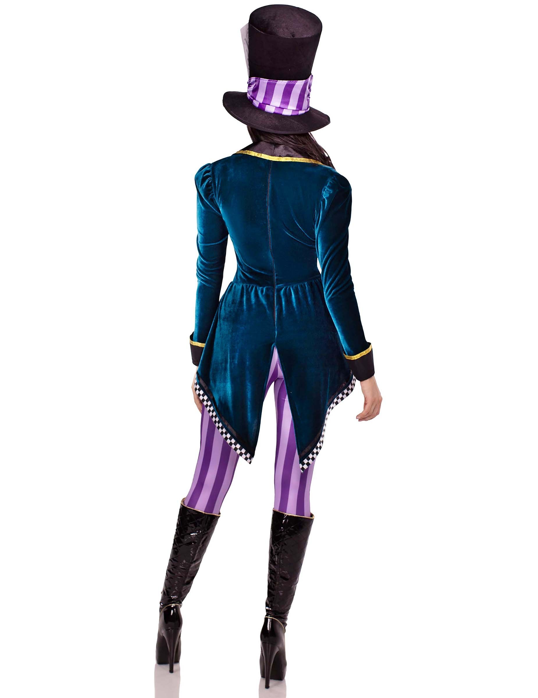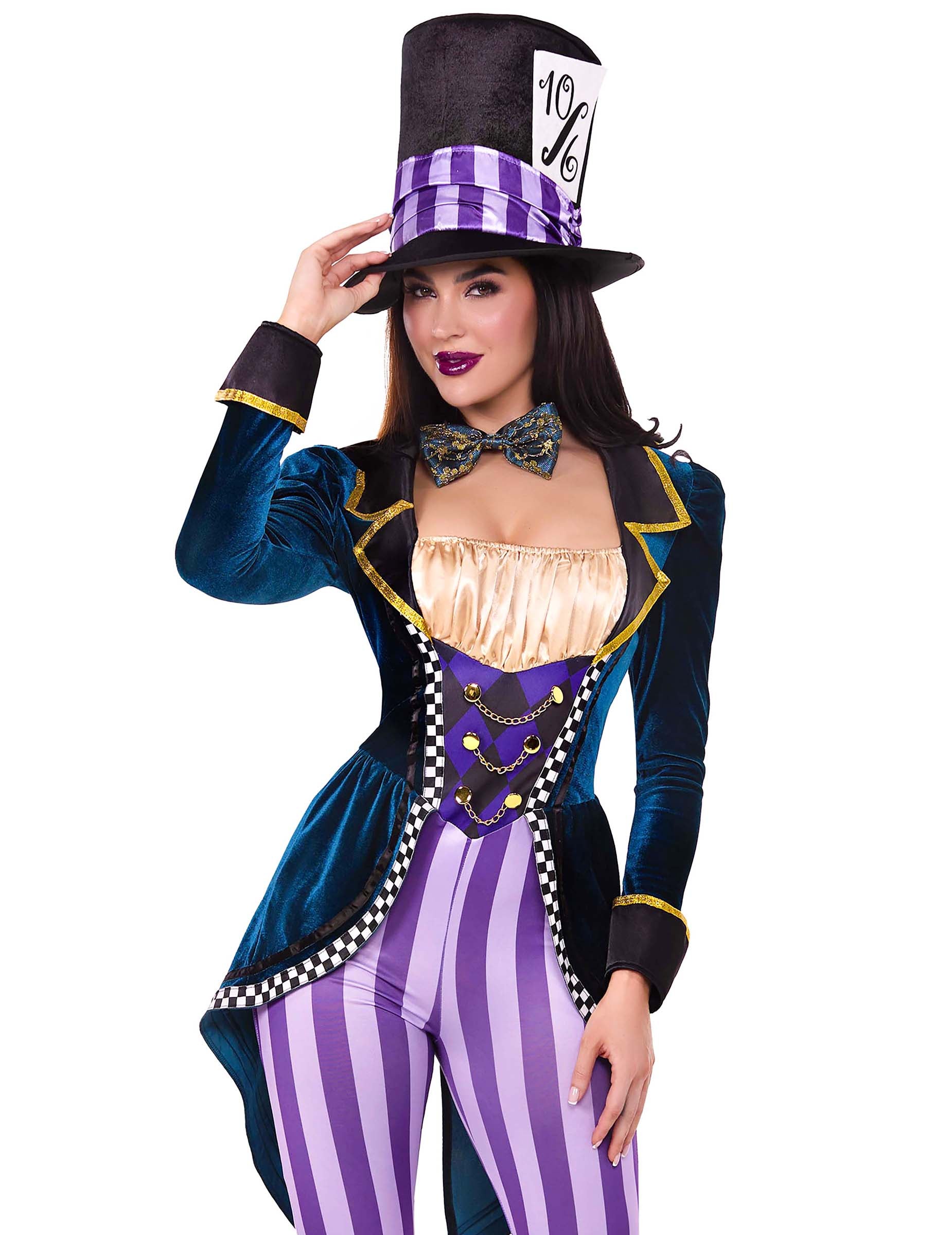 Този секси костюм на Лудия Шапкар за жени е проектиран като гащеризон „всичко в едно“, съчетаващ текстури и контрасти за поразителен ефект. Интегрираното кадифено яке в синьо-зелен цвят, със златни ревери и дълги ръкави, добавя обем и театрален щрих. Малки декоративни верижки на корсажа подчертават причудливия стил на героя. Полата, с лилави и бели райета, обгръща извивките благодарение на удобна, еластична материя. Целият ансамбъл е завършен с черно-лилав цилиндър, украсен с етикет 10/6, емблематичния символ на Шапкаря. Идеален тоалет за въплъщение на ексцентричен и завладяващ герой на тематично парти.