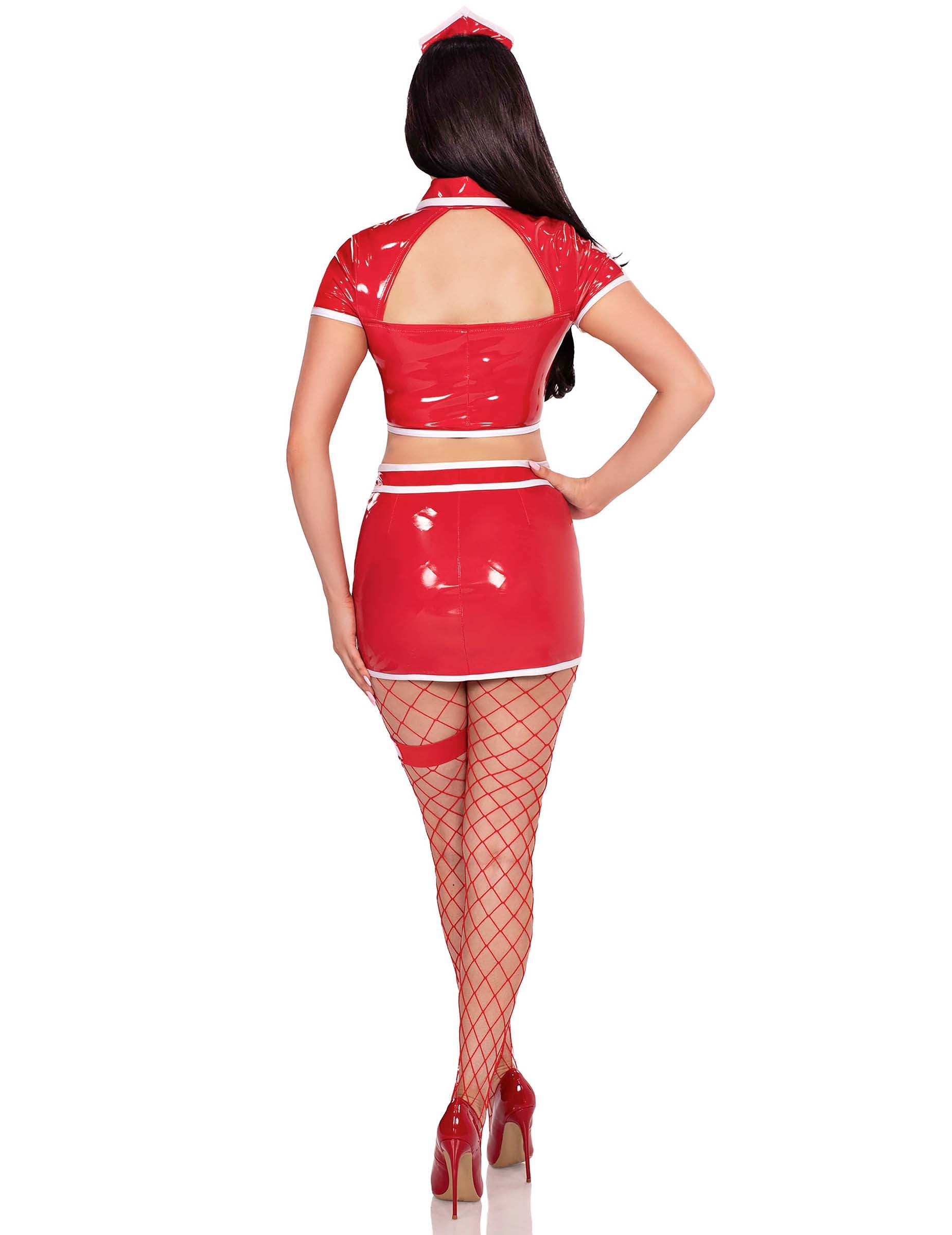Този секси костюм на червената медицинска сестра за жени разполага с лъскав винилов плот с цип отпред, съчетан с къса мини пола с централно закрепване на цип. Контрастните бели граници структурират цялото с прецизност. Червена лента за глава с бял кръст, съответстваща на тоалета, завършва този стилен ансамбъл. И накрая, червена жартиера с бял кръст допълва това секси облекло. Силен силует, идеален за открояване по време на парти за униформа.