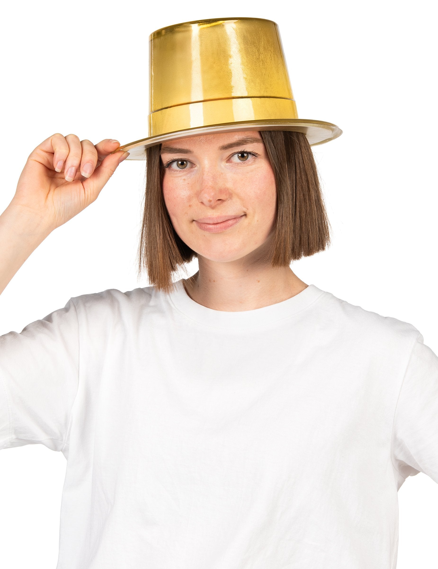 Добавете нотка блясък към облеклото си с тази златна шапка с ослепителен метален ефект. Изработена от фина пластмаса, тя отразява интензивно светлината за сияйна и празнична визия. Формата ѝ елегантно допълва парти костюм, кабаре визия или шикозен вечерен ансамбъл. Идеална е за да се откроите на костюмирано парти, празнично представление или за Новогодишна нощ.