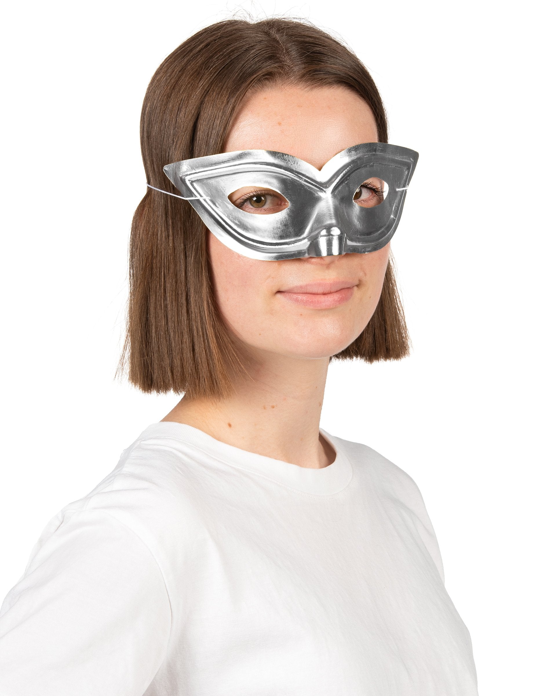 Тази блестяща сребърна маска за възрастни пленява с искрящото си покритие, което улавя светлината и привлича погледа. Лека и удобна за носене, тя е изработена от тънка пластмаса, която перфектно следва контурите на лицето. Идеална е за аксесоариране на маскараден бал или за добавяне на елегантен и мистериозен щрих към изискан костюм.