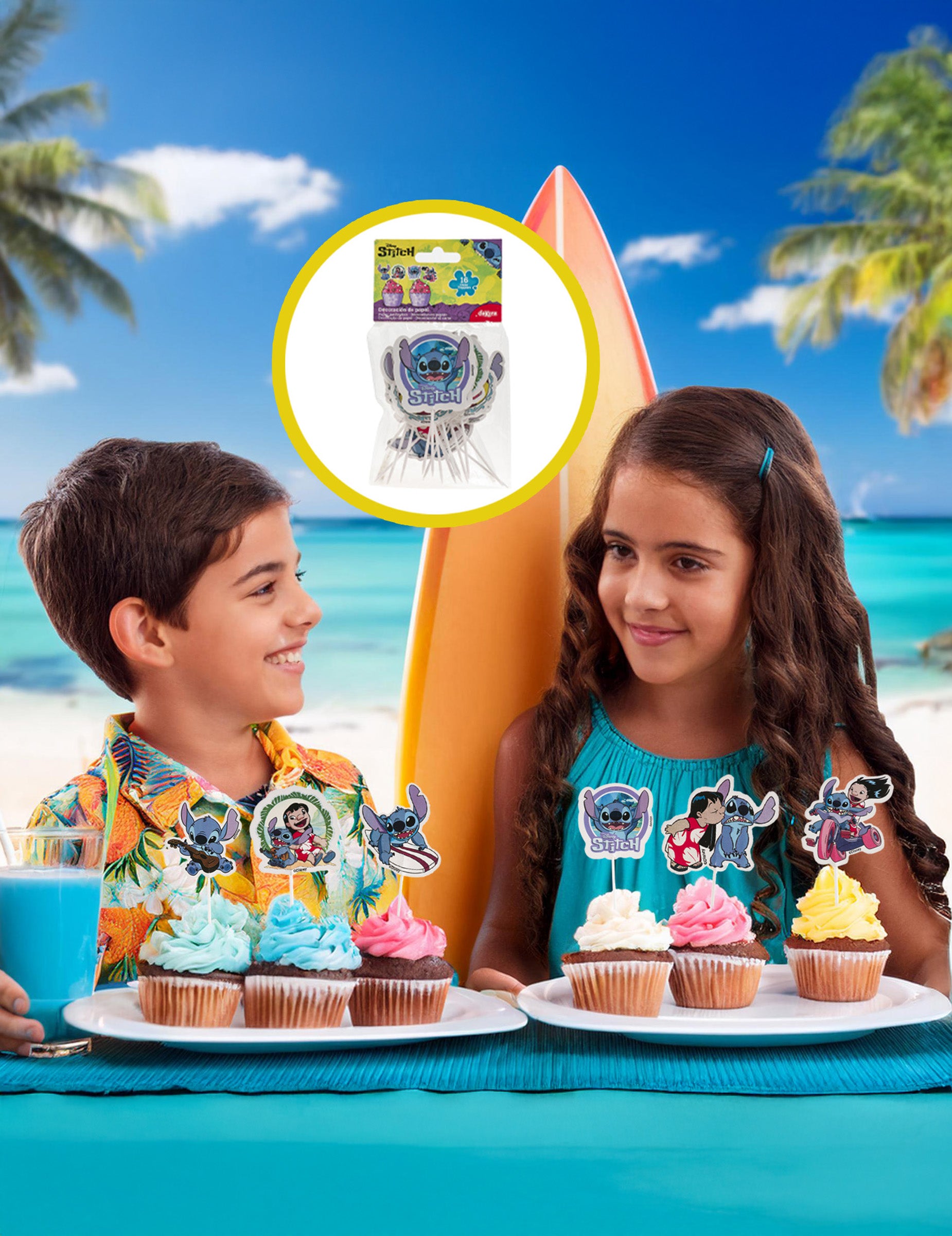 Avec ce lot de 16 cake toppers en papier, retrouvez Stitch dans des scènes pleines de bonne humeur, parfois aux côtés de Lilo. Parfaits pour décorer cupcakes, parts de gâteau ou autres gourmandises, ils apportent une note tropicale et festive à votre table. Grâce à leur support facile à planter, ces toppers ajoutent en un instant une ambiance ludique inspirée de l’univers Stitch.