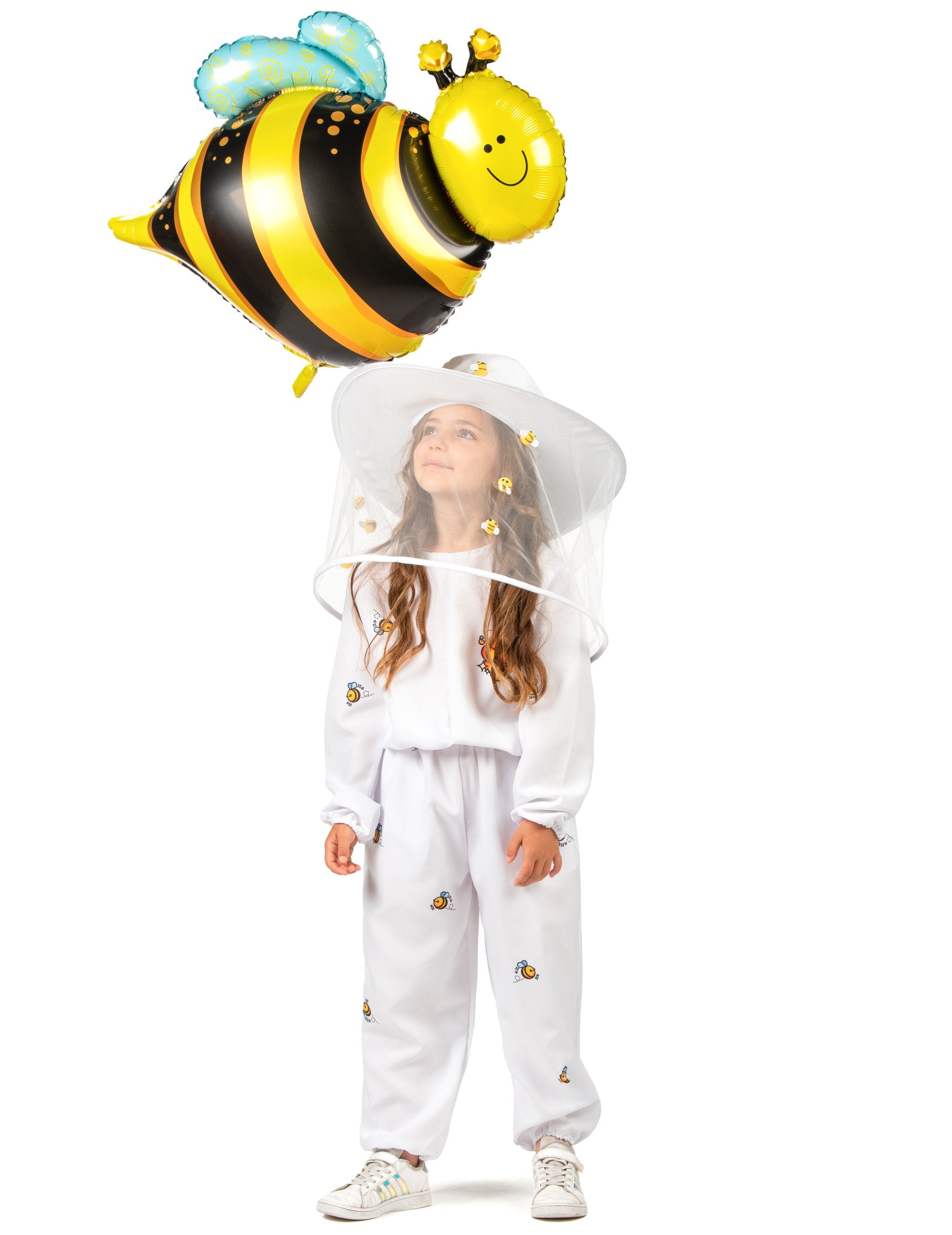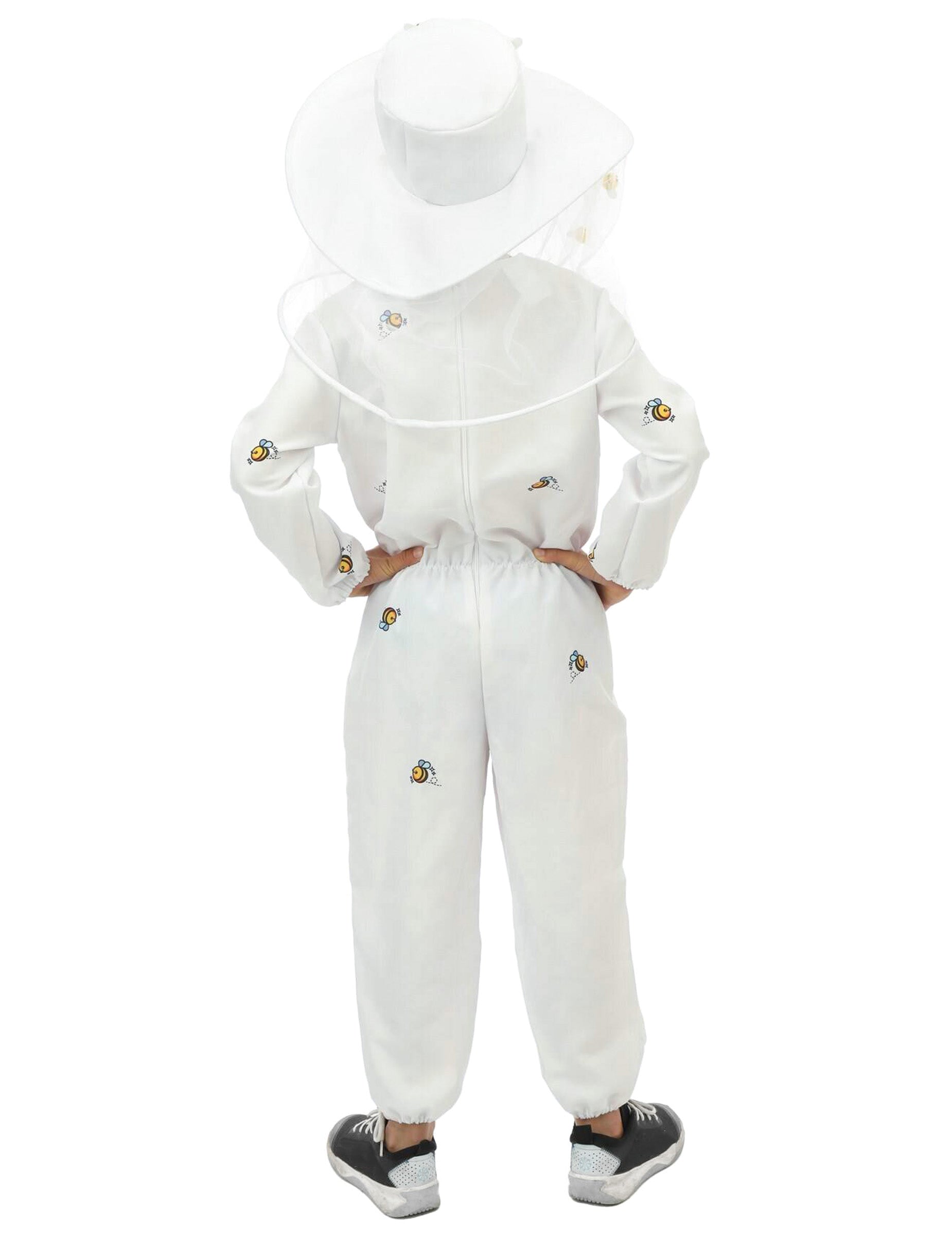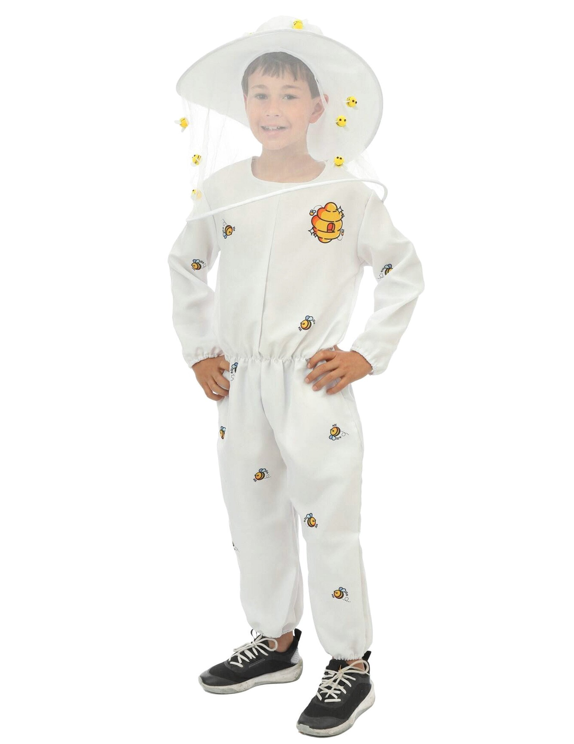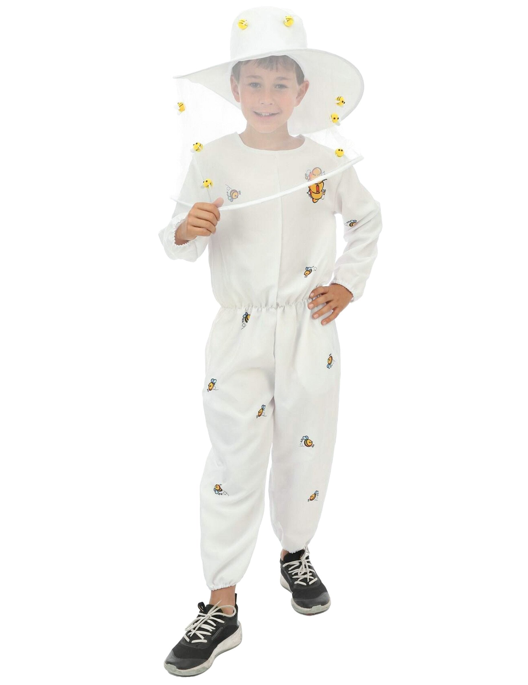 Този пчеларски костюм за дете се състои от шапка с воал и бял гащеризон в същия стил за визия, вярна на истинските пазители на кошерите.