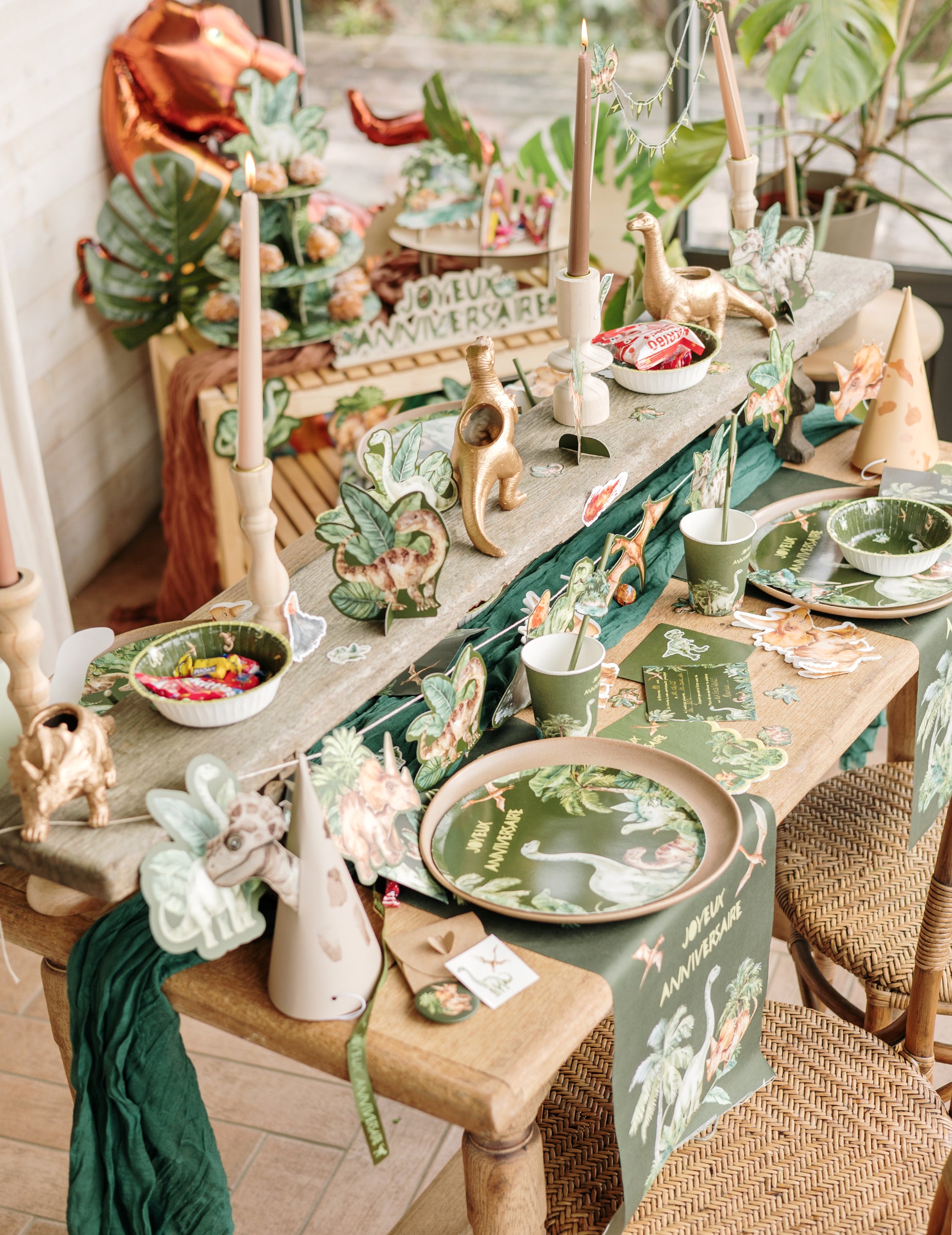 Потопете гостите си в един праисторически свят с това комплект от 6 хартиени чинии за рожден ден илюстрирано с динозаври Цветна. Тази тропическа сцена на зелен фон представя известни екземпляри като стегозавъра и бронтозавъра сред буйна растителност. Диаметърът ѝ е 23 см. cm, тези чинии от 23 cm Тези здрави парчета са идеални за наслаждаване на торта или лакомства. Този забавен и стилен комплект ще се хареса на млади любители на палеонтологията, като същевременно ще допълни вашата... украса за маса С елегантност. Това е основният аксесоар за рожден ден успешен по темата динозаври.
