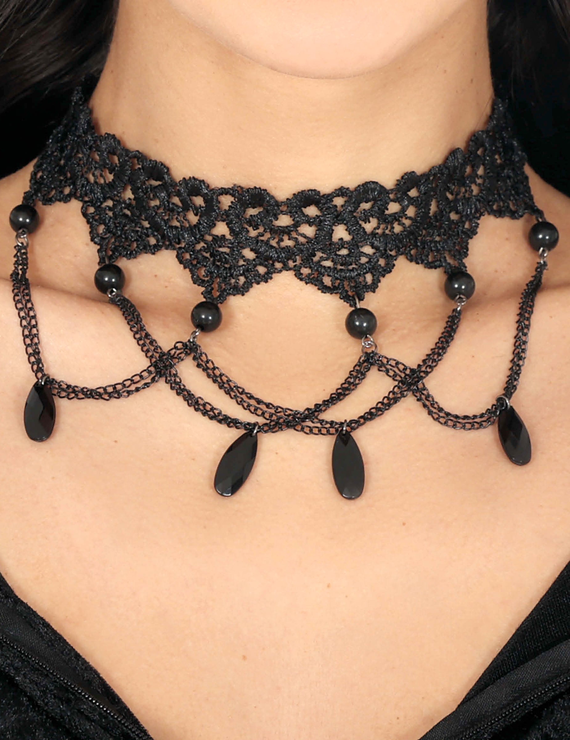 Ce collier ras-du-cou se compose d’une large dentelle noire aux motifs travaillés, rehaussée de chaînettes pendantes et de perles sombres qui tombent en cascade. L’ensemble dessine une silhouette dramatique et séduisante. Parfait pour compléter un déguisement de sorcière, de marquise gothique ou de vampire, ce bijou mettra en valeur le cou avec subtilité lors d’une soirée déguisée ou votre soirée d'Halloween.