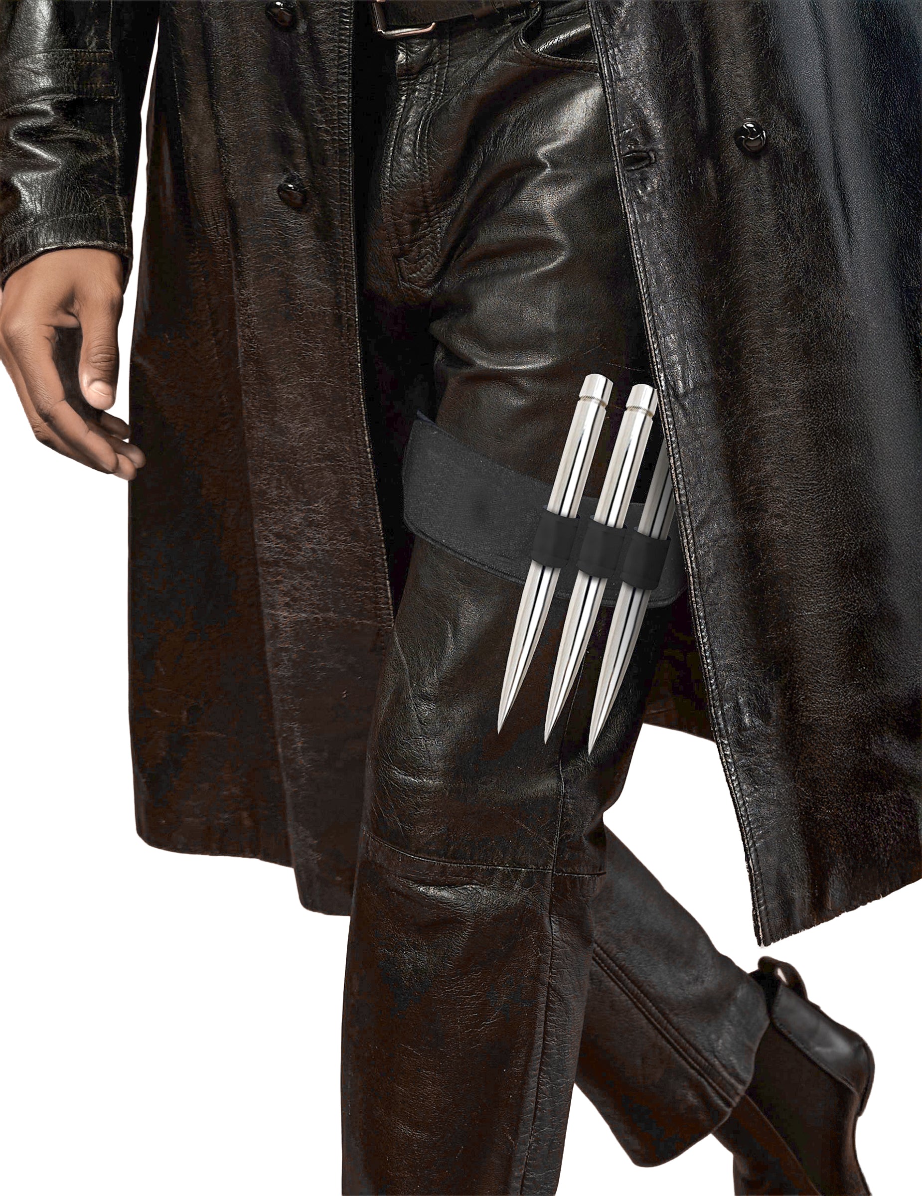 Тази бедрена лента е оборудвана с три сребристи фалшиви кола, закрепени върху черна каишка, която се прикрепя около крака. Лесна за поставяне, тя добавя реалистичен и стилен акцент към костюм на ловец или тъмен воин. Перфектен аксесоар за допълване на дегизировка за Хелоуин, този аксесоар носи силен визуален ефект, сякаш е готов да бъде използван по всяко време срещу нощни създания.