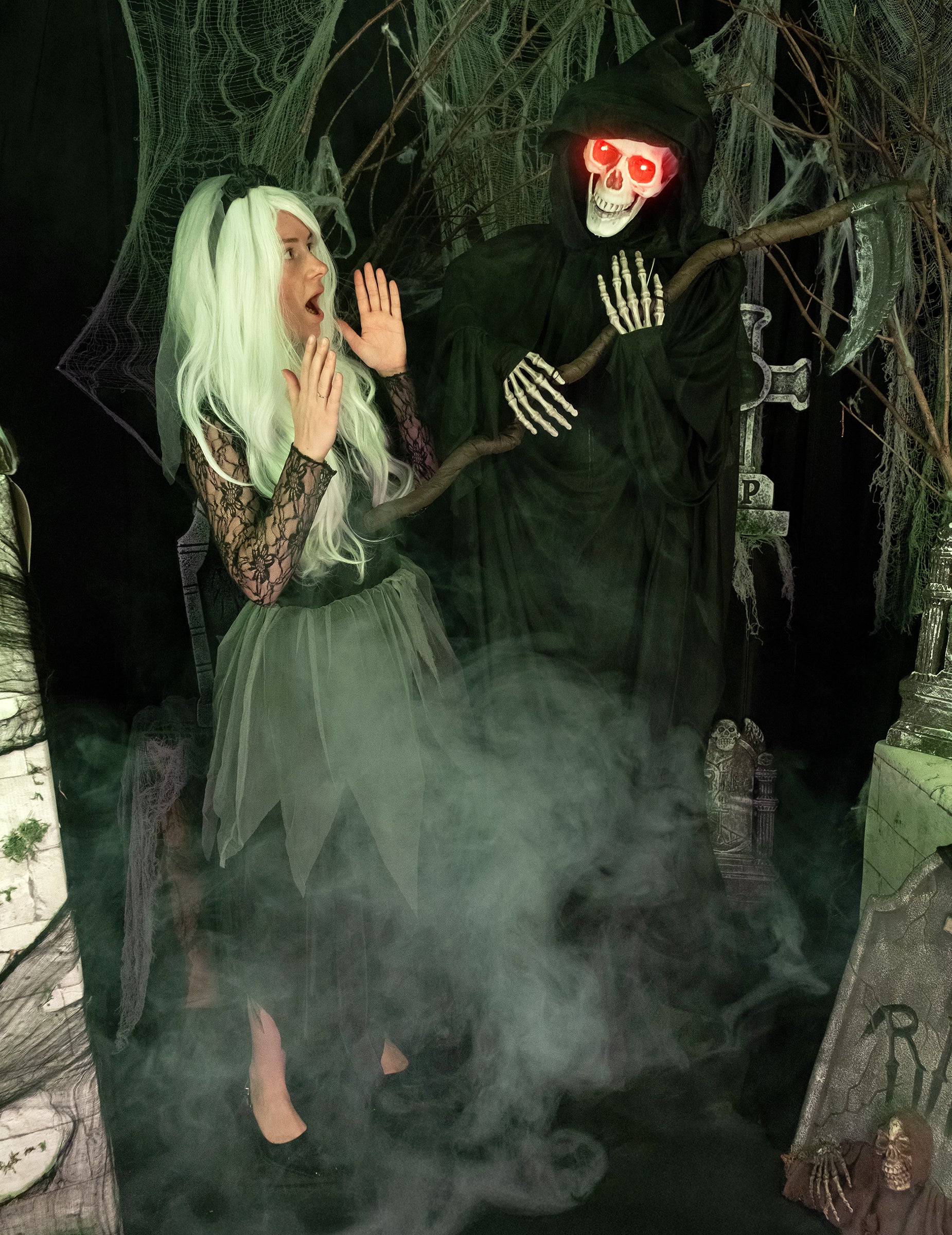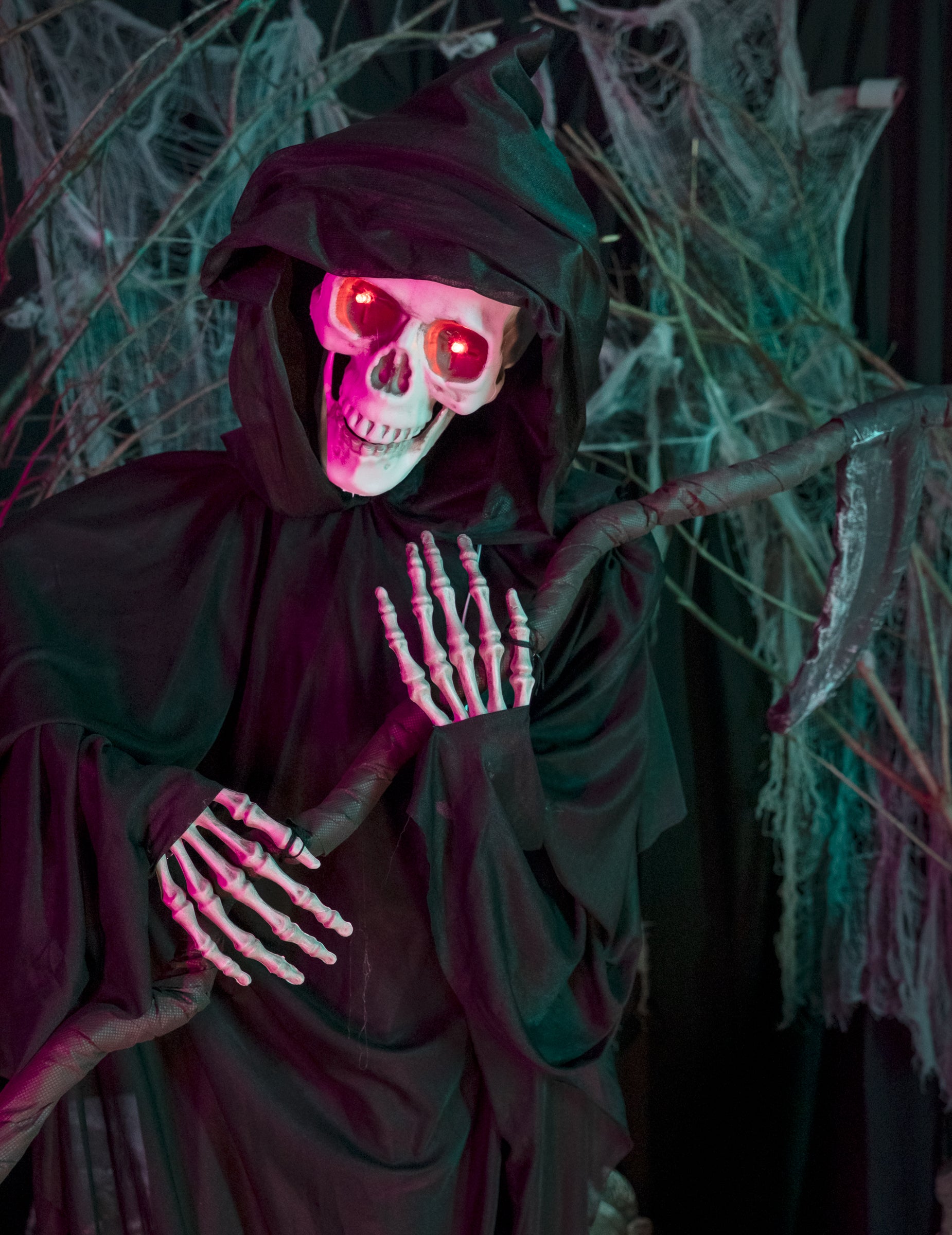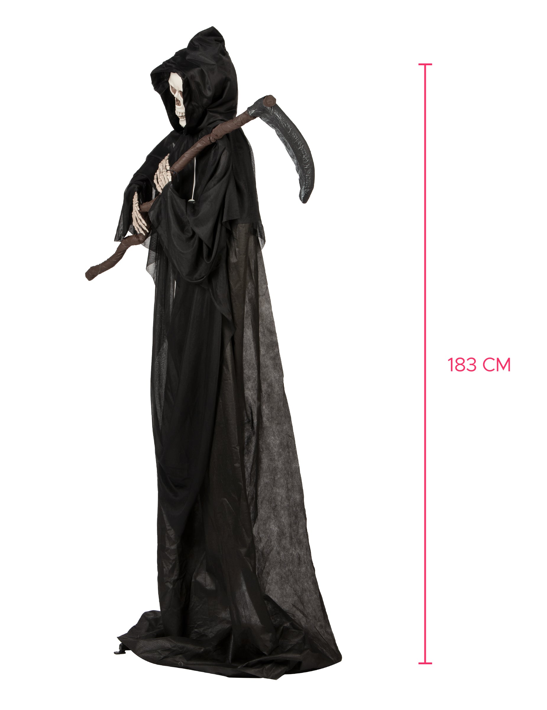 Сейте ужас с този 183-сантиметров ходещ жътвар cm Мрачна фигура, обвита в дълга черна мантия, е готова да се появи от сенките. Внушителният ѝ силует, светещите червени очи и зловещите стонове създават наистина поразителен ефект. Оборудвана със звуков сензор, тя се активира при най-малкото присъствие; заплашителни движения, пронизваща светлина и смразяващи звуци се задействат, за да потопят пространството в погребална атмосфера. Работи с 3 батерии тип AA (не са включени) и комбинира звук, анимация и осветление за обезпокоителен реализъм. Идеална за вход за Хелоуин, тъмен коридор, обитавана от духове сцена на открито или зловеща витрина, тази гигантска Мрачна жътварка се превръща в зловещ пазител на вашата витрина.
