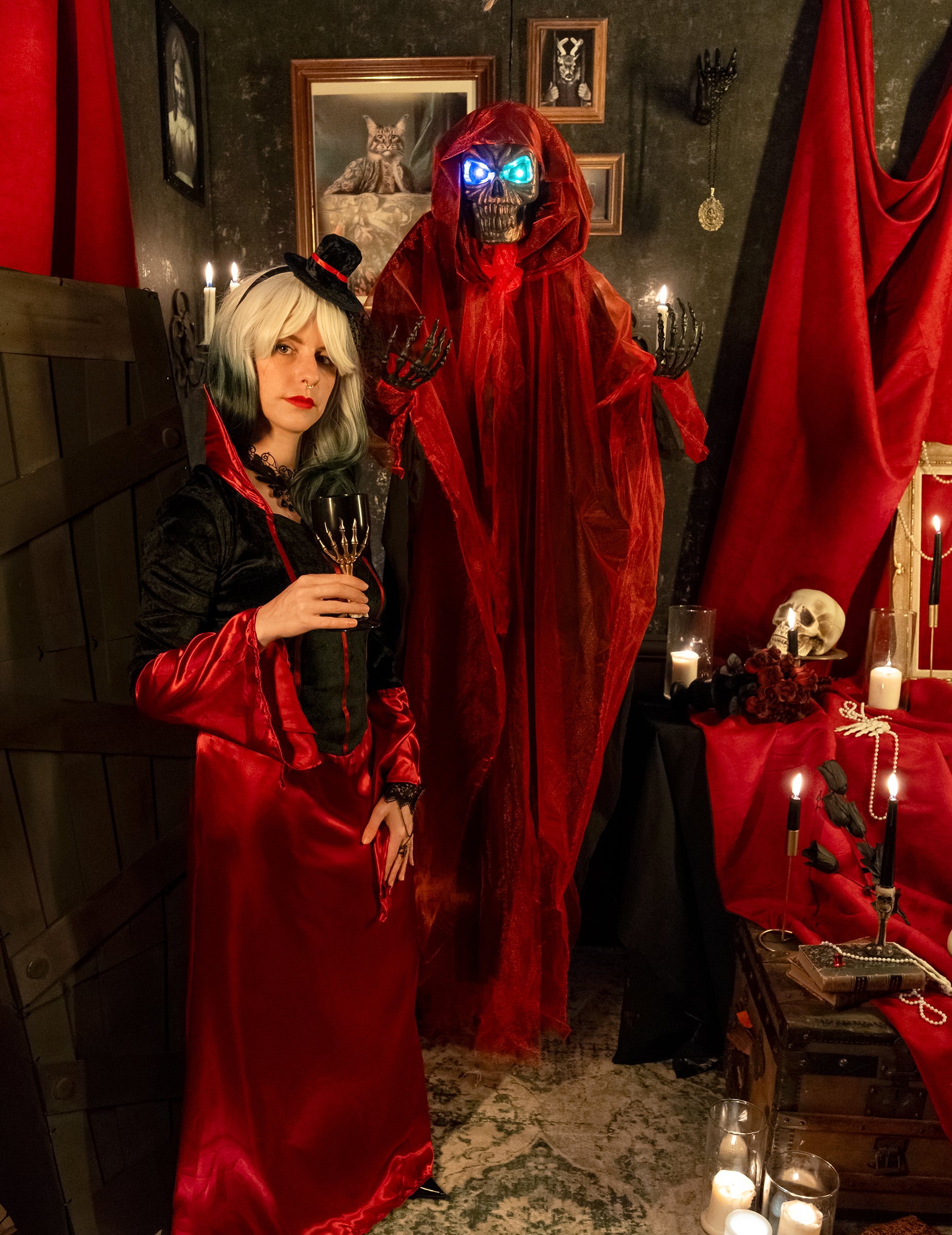 Направете грандиозен вход в ужас с този 180 червен висящ демон cm Приблизително, инфернална фигура, обвита в черни и алени воали. Неговата гриматово лице, протегнатите нокътни ръце и светещите червени и зелени очи придават поразителен вид, сякаш е избягал от дълбините. Тази голяма декорация е готова за използване. Лесен за окачване благодарение на интегрираната си кука, тя идва с батериите си, които вече са включени за незабавна анимация при инсталирането. Идеален за парти за Хелоуин, ужасяващ вход на къщата, пространство с демонична тематика или призрачен дисплей на прозореца, този висящ демон ще създаде спектрална и потапяща атмосфера от първата светлина на здрача.