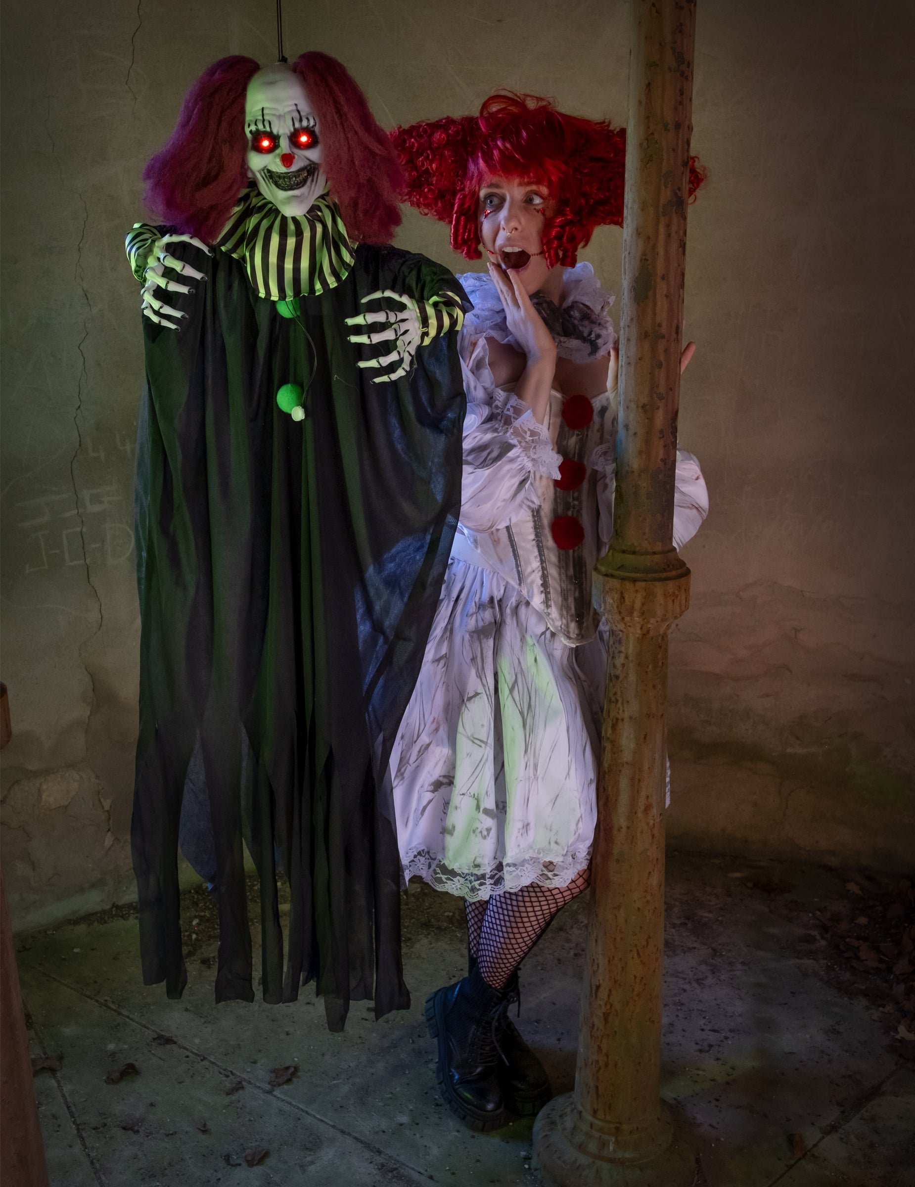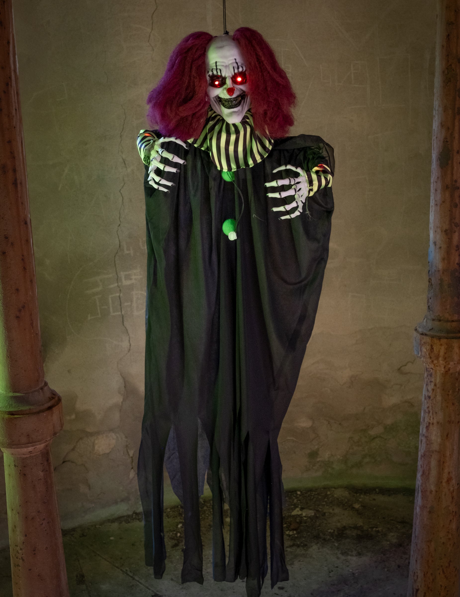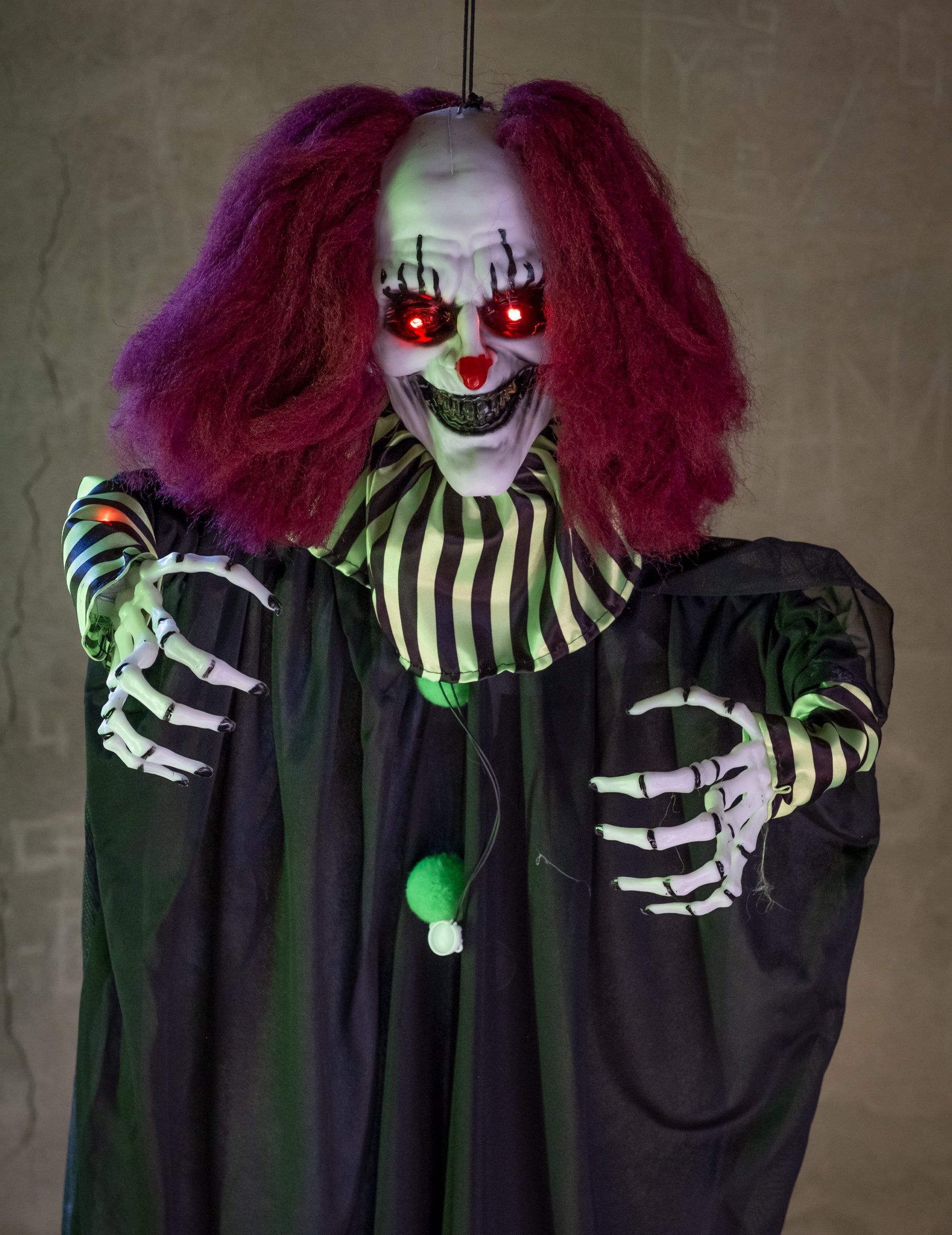 Донесете страх от тавана с този 130-инчов анимационен висящ клоун cm Приблизително, ярко оцветен мрачен характер, който изобщо не е забавен. Със изтръпналата си червена коса, неоновото му зелено и черно костюм и костето му лице замръзнала в смущаваща гримаса, той привлича всички очи. Щом се чуе шум, неговият звуков сензор задейства ужаса. Очите му светят, пронизителните звуци звънят и паник настъпва. Леки и лесни за окачване, той работи с 3 батерии AAA (не са включени), предлагайки поразителен комбиниран ефект на светлината и звука. Идеален за декор за Хелоуин, стая с болезнена атмосфера, натоварен прозорец или някакво ужасяващо пространство, този висящ клоун е готов да направи кръвта ви на студена при най -малката тръпка.