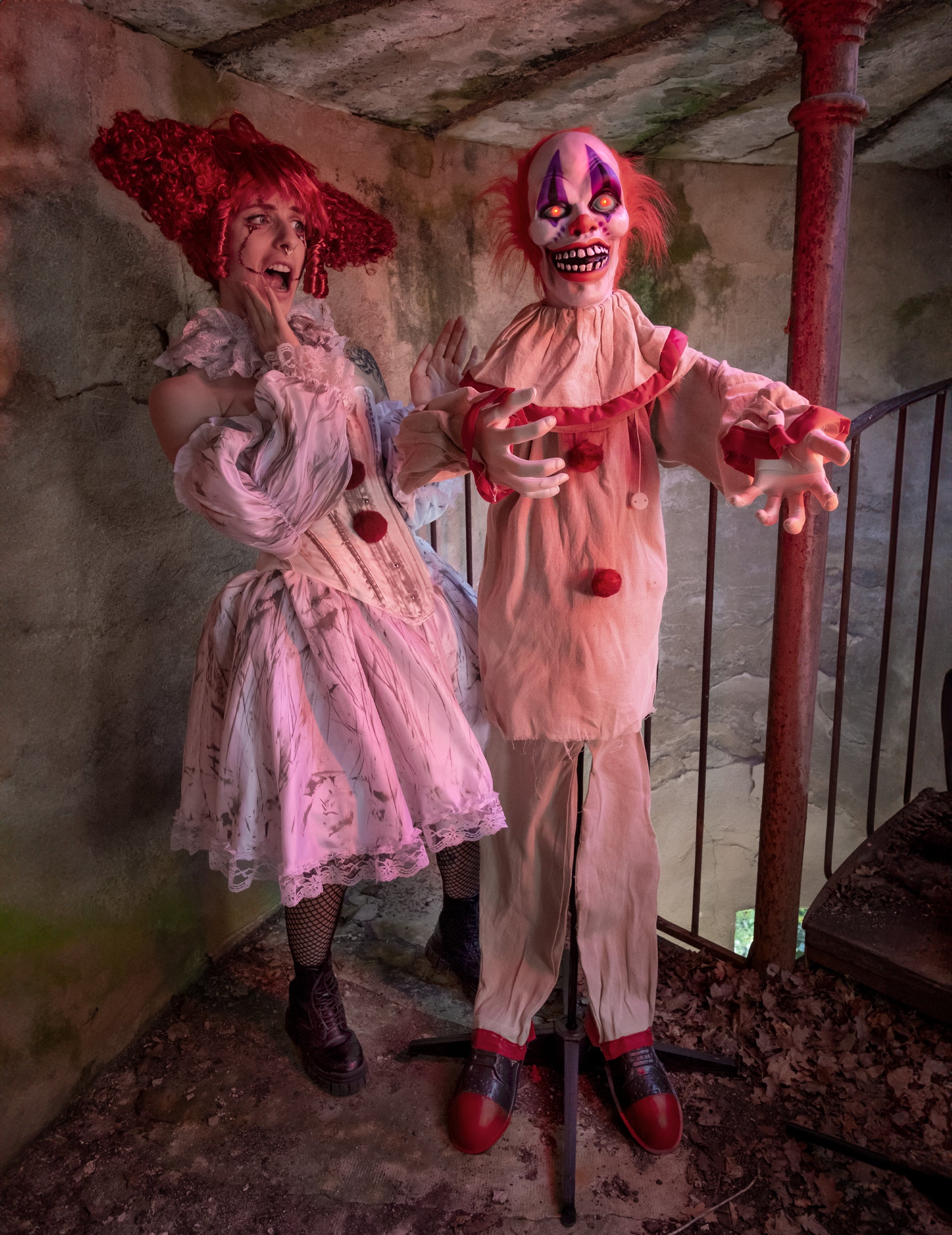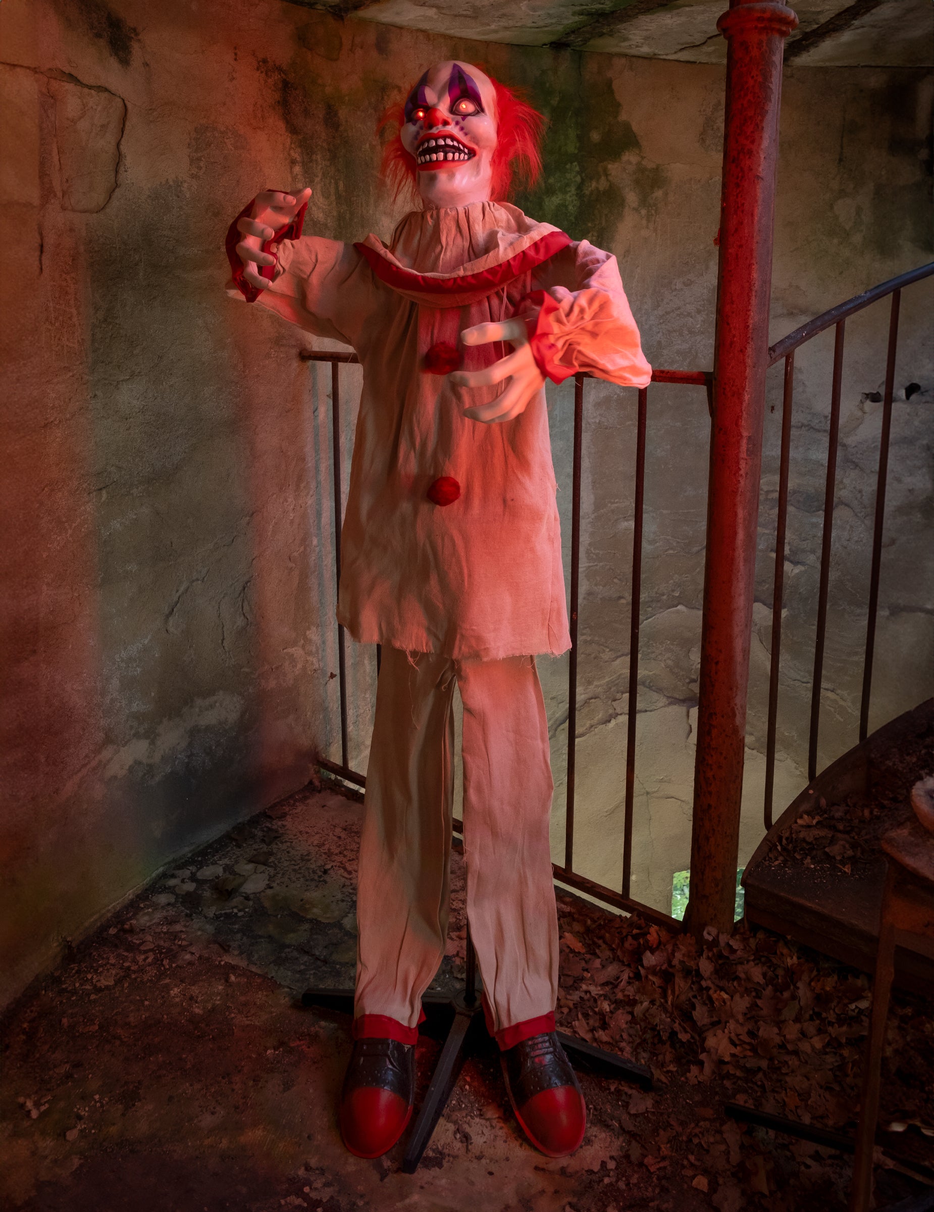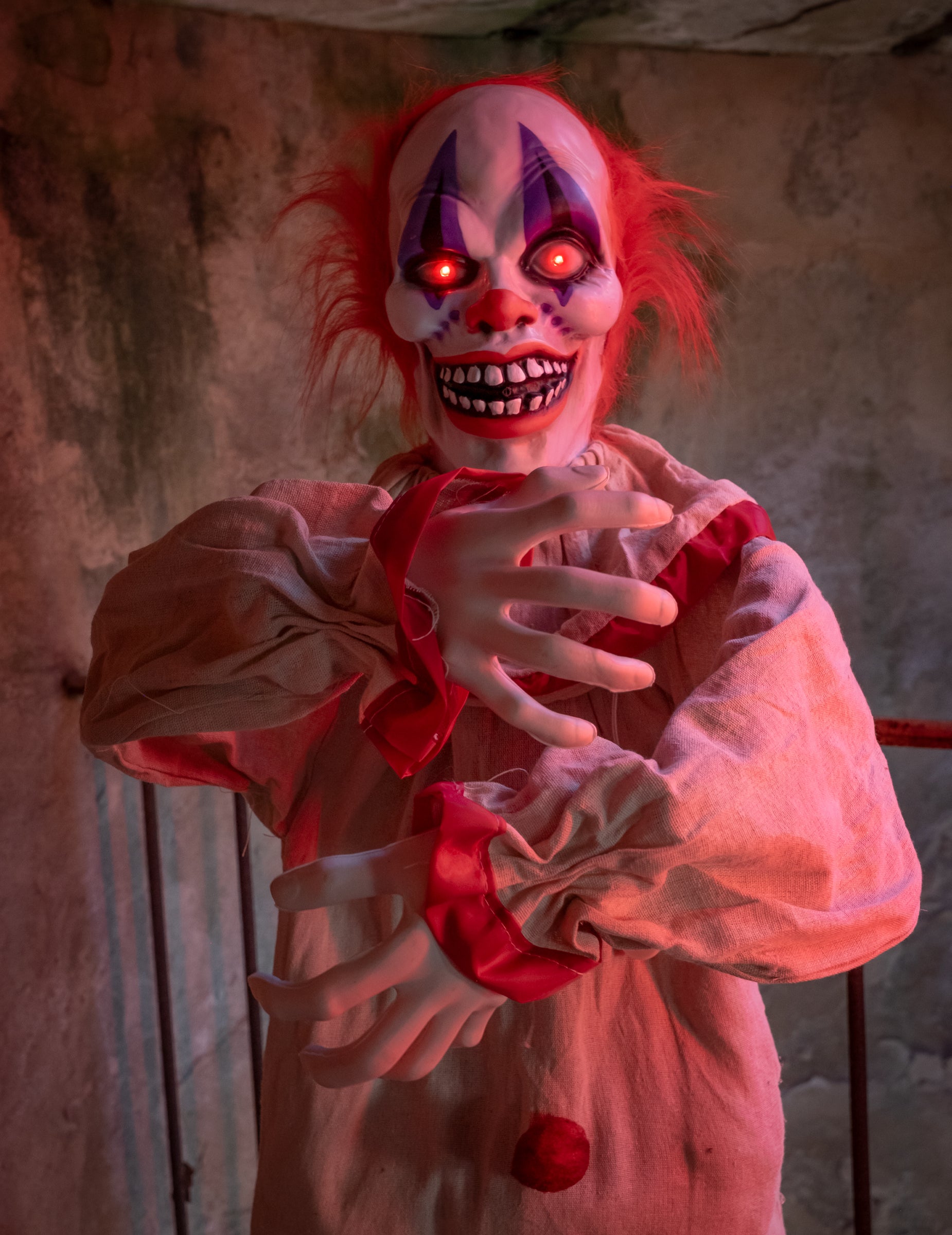 Добавете нотка чист ужас към вашия сценограф с този 153-сантиметров анимиран клоун cm С неподвижна и обезпокоителна усмивка, този герой, облечен в бежов костюм на червени райета, с бледо лице, гримирано по зловещ начин, и притежаващ зловещо присъствие, е достатъчен, за да ви побият тръпки. Благодарение на своите звукови и сензори за движение, той се активира веднага щом посетител се приближи. Очите му светят с интензивна светлина, движи се обезпокоително и издава ужасяващи звуци. Декорацията изисква 3 батерии AAA (не са включени) за наистина поразителен комбиниран светлинен, звуков и анимационен ефект. Идеален за обитавана от духове къща, Хелоуин парти, зловеща витрина или зловеща клоунска тема, този герой бързо се превръща в най-страховитата атракция в обстановката.