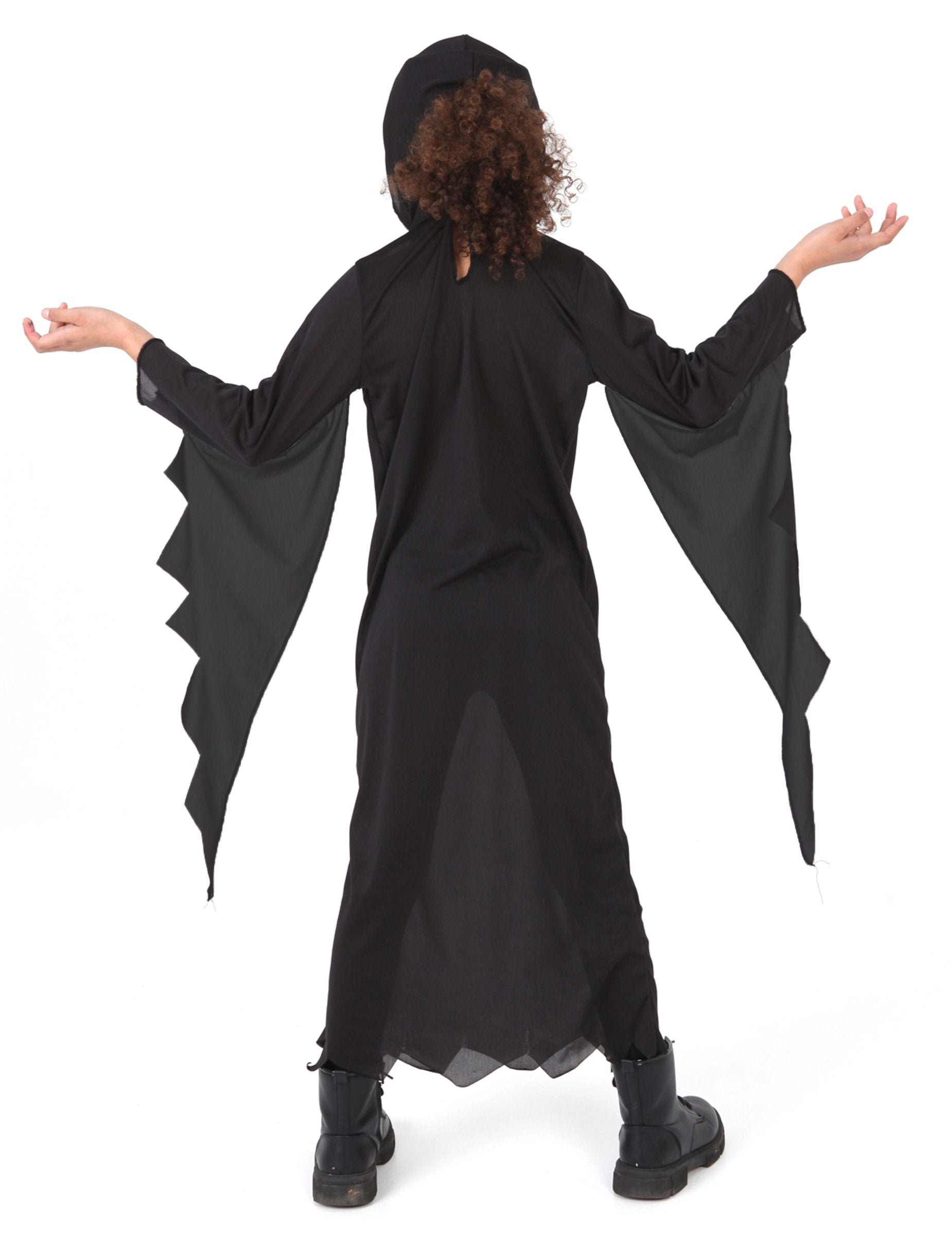 Ce déguisement de serial killer pour enfant se compose d’une robe longue noire à capuche, au style minimaliste et inquiétant. Les manches longues se prolongent en pointes dentelées, apportant une touche sinistre à la silhouette. La capuche ample dissimule partiellement le visage pour un effet mystérieux, tandis que la coupe fluide permet de se mouvoir en toute liberté. Une tenue parfaite pour incarner un personnage silencieux et effrayant, lors des festivités. Idéal pour créer un impact glaçant le soir d’Halloween.
