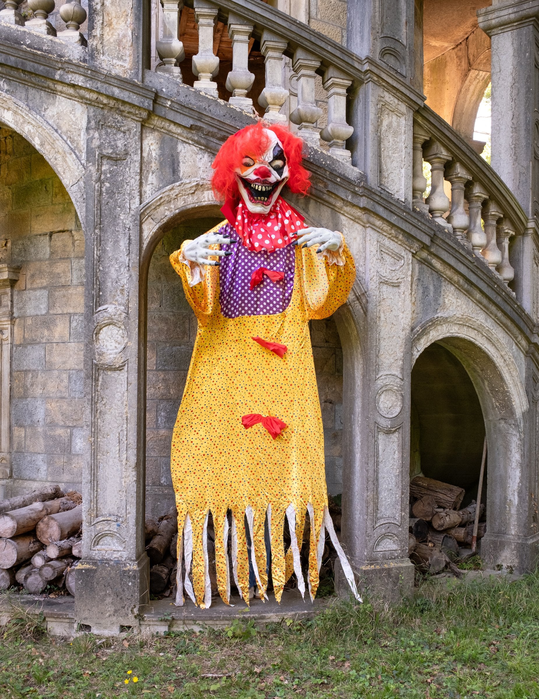Създайте кошмарна атмосфера с това гигантски клоун, окачен на земята Висок 3,5 метра, с поглед, едновременно необикновен и ужасяващ! С голямата си крещяща уста, широко отворените си очи, разрошената си червена коса и жълтия си костюм с многоцветни точки, той няма да пропусне да изненада всички ваши гости.