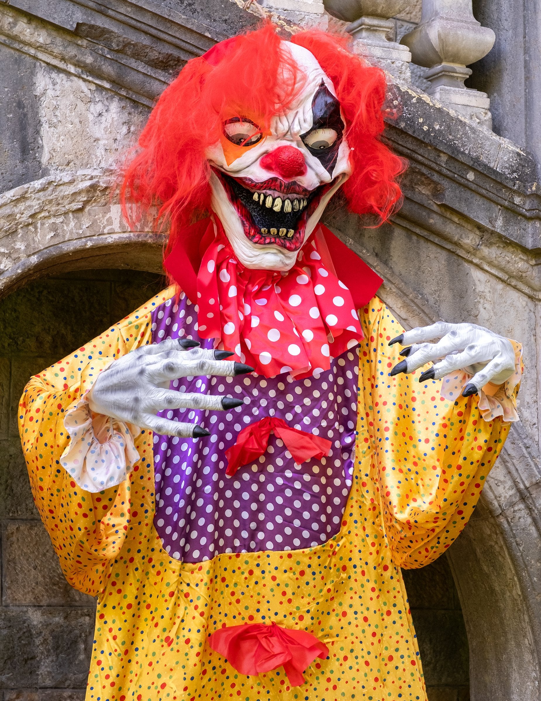 Лек и преносим, този зъл клоун Люлее се на вятъра, засилвайки зловещия му ефект. Плашещото му пластмасово лице, крещящите червени панделки и цветният му тоалет с широка яка и ръкави създават поразителен контраст между карнавала и ужаса. Има дискретно закрепване, което позволява лесното му окачване от дърво, таван или в тъмен ъгъл.
