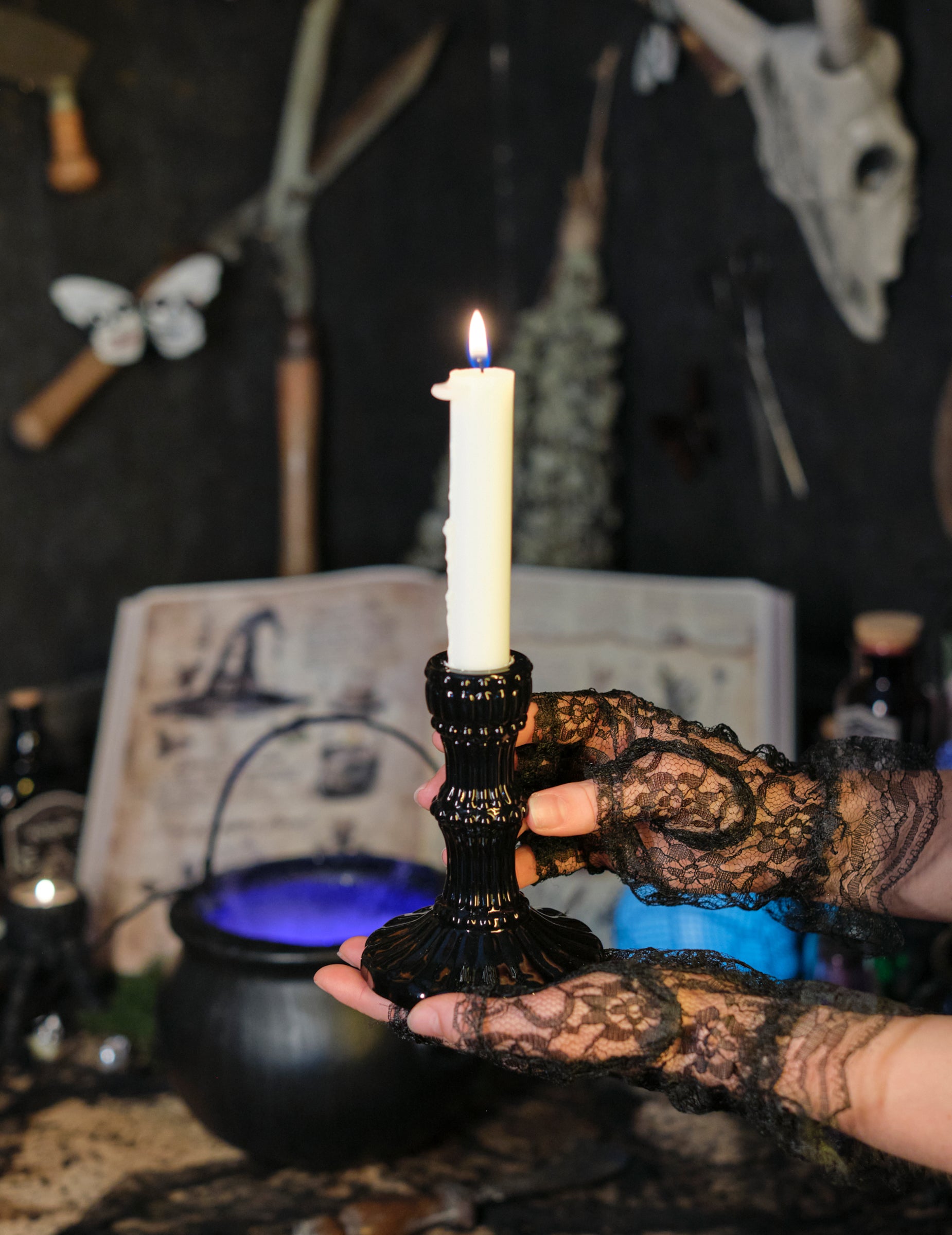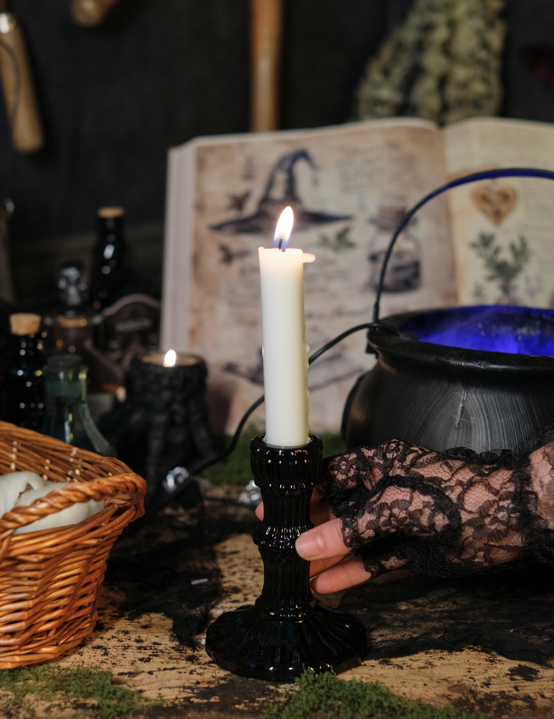 Този притежател на свещи от черно стъкло измерва 12 cm и лесно се настанява свещ за факла. Неговата сложна форма, подчертана от дълбоко тонирано стъкло, я прави декоративен предмет с характер, идеален за вашите дисплеи на Хелоуин. Инсталиран на маса, рафт или мебел, той разпръсква тъмна и изискана атмосфера.