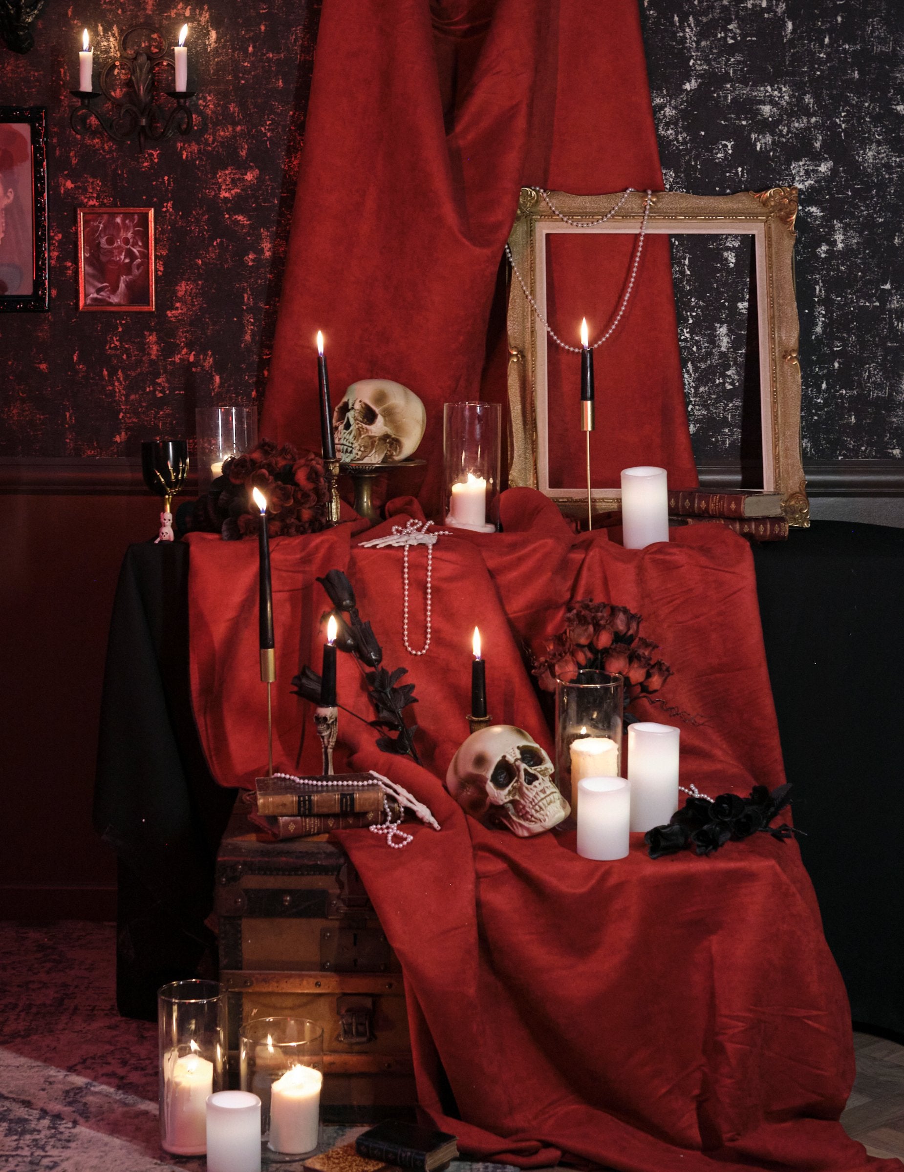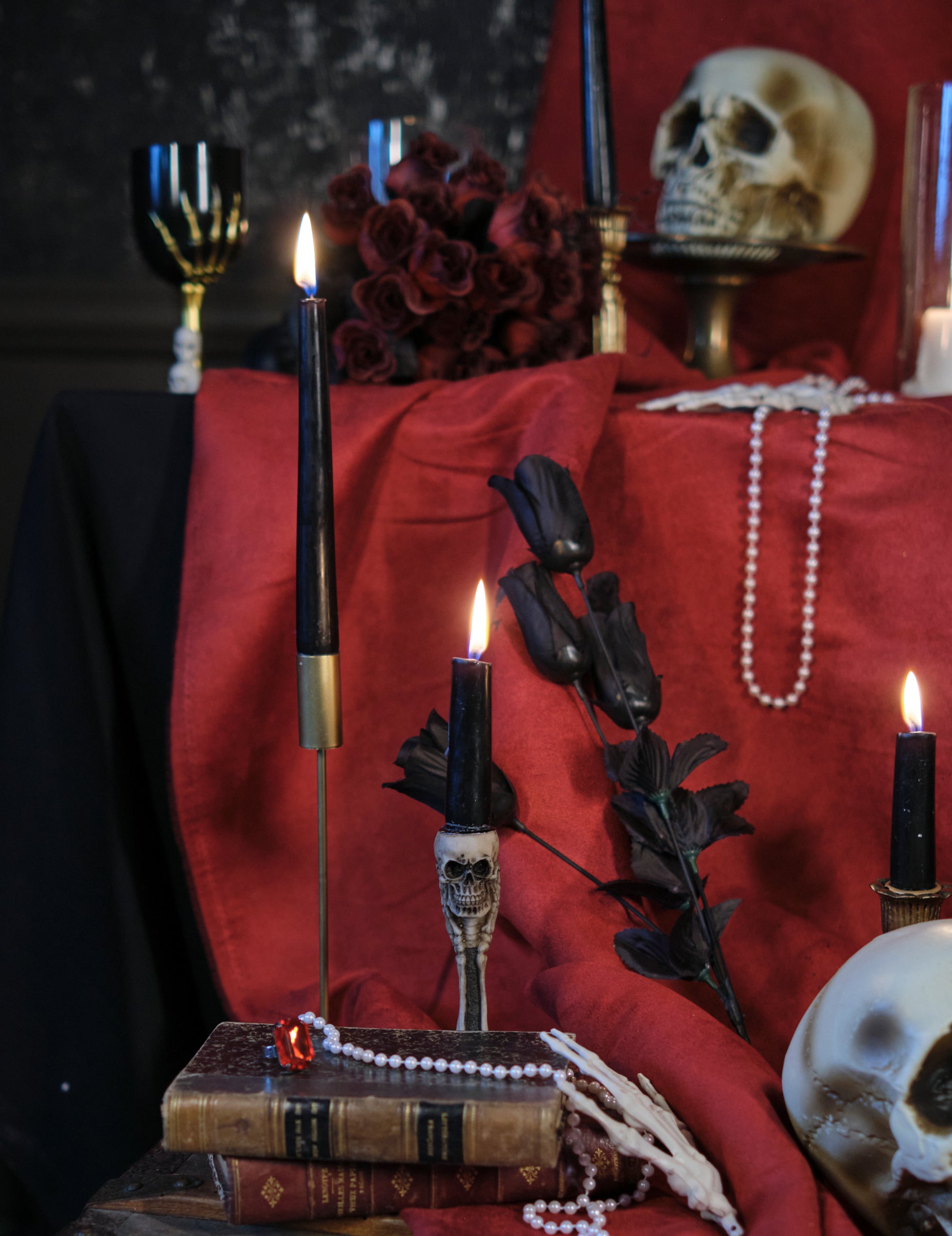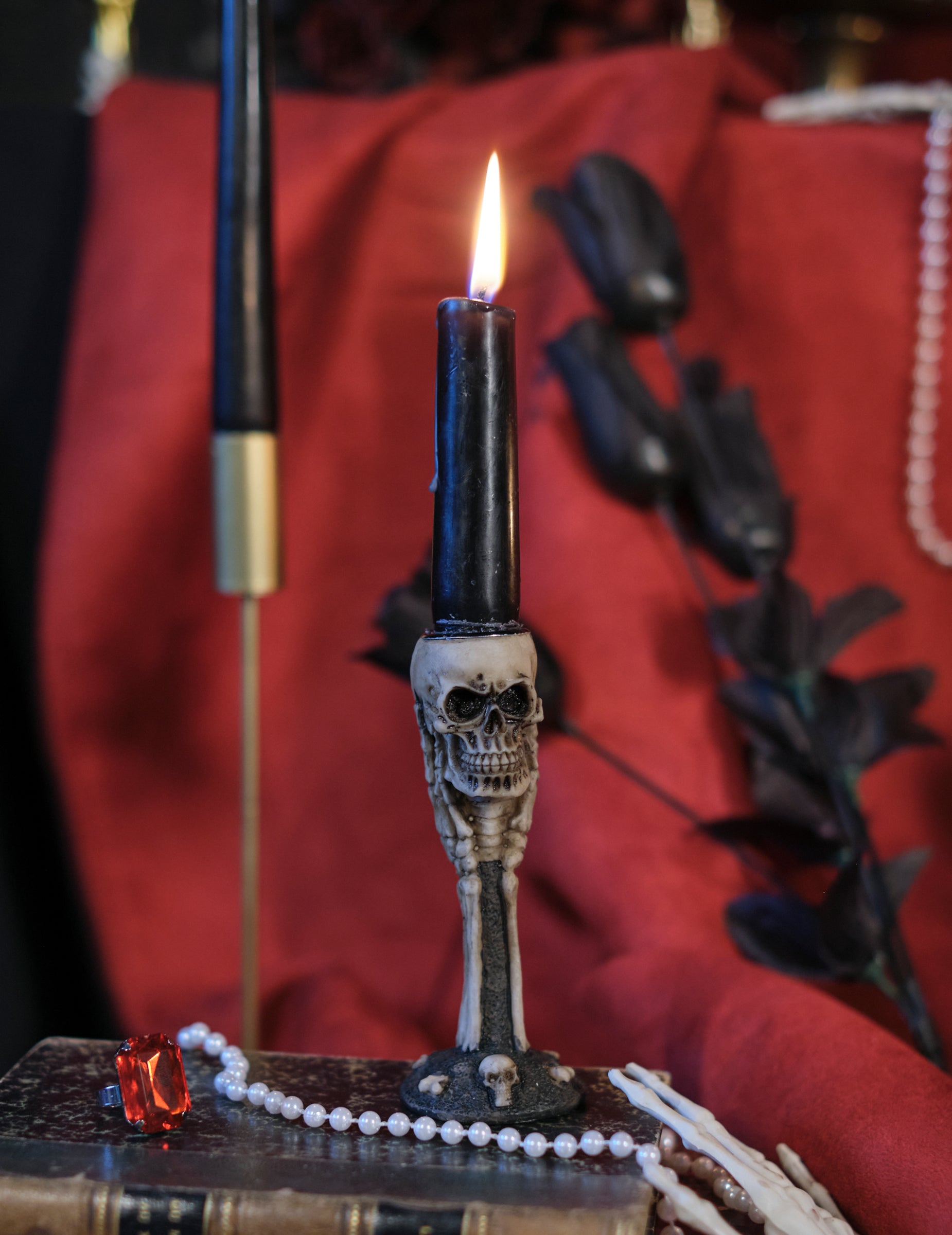 Този държач за свещи във формата на череп и кости от 12.5 cm носи тъмно и оригинално докосване на вашия декор, идеален за подсилване на мрачна или готическа атмосфера по време на вашите събития. Изработена от твърда смола, тя е с размери 5 х 12,5 cm и разполага с реалистична костна структура, с изваяна череп в горната част и няколко малки кости в подножието на основата. Подробните облицовки и състареното покритие придават му вид, който е едновременно призрачен и декоративен. Перфектен за призрачен Хелоуин, призрачна банкетна маса или декор за обитаване на призраци.