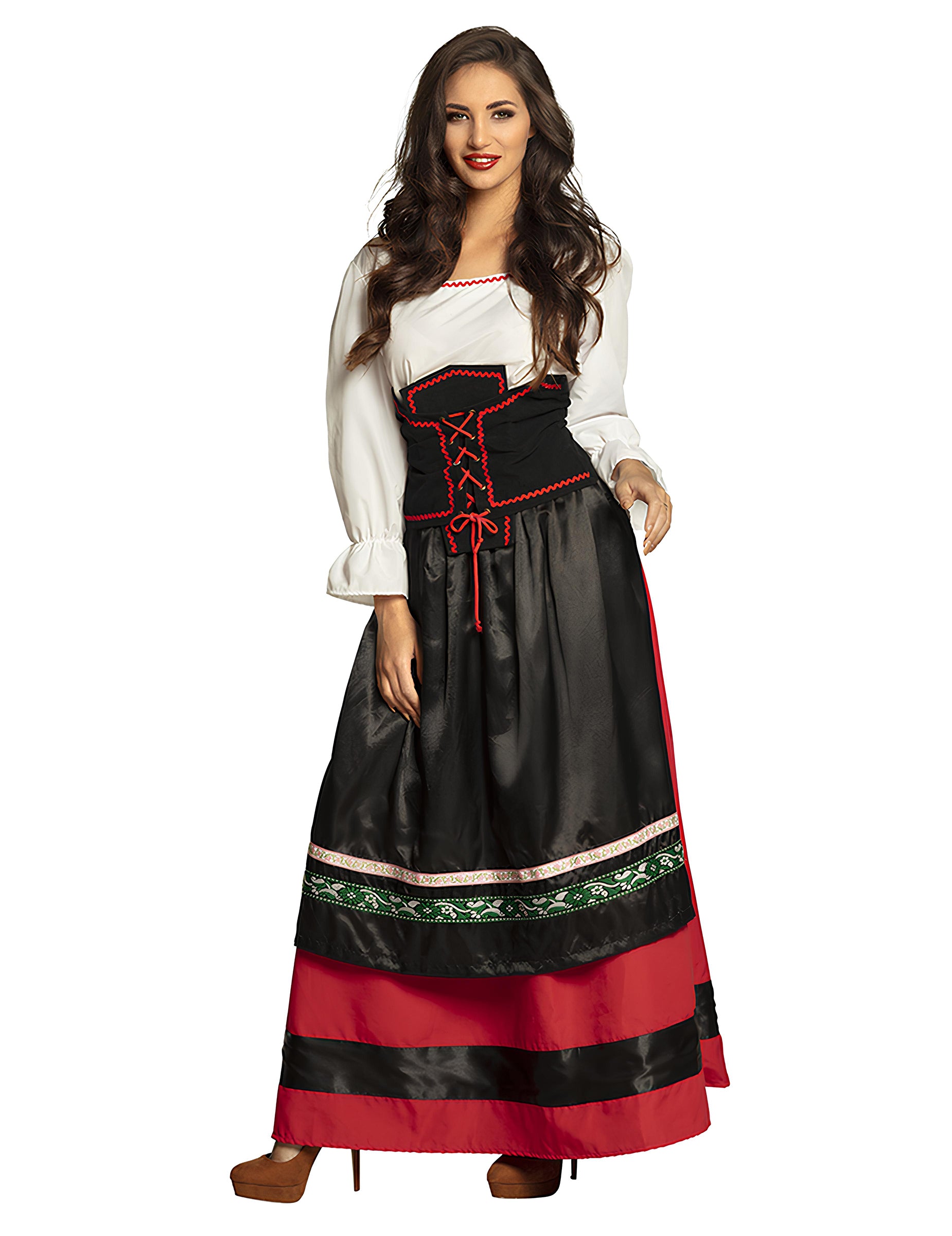 Ce déguisement de Bavaroise longue pour femme s’inspire des costumes traditionnels avec une coupe ample et distinguée. Le haut blanc à manches bouffantes s’associe à un corset noir orné d’un lacet rouge central, soulignant joliment la taille. La jupe, longue et fluide, alterne bandes rouges intenses et noirs profonds, avec une frise décorative verte pour accentuer le styletraditionnel. Un ensemble parfait pour incarner une serveuseen vue de la fête de la bière dans une ambiance conviviale et colorée.
