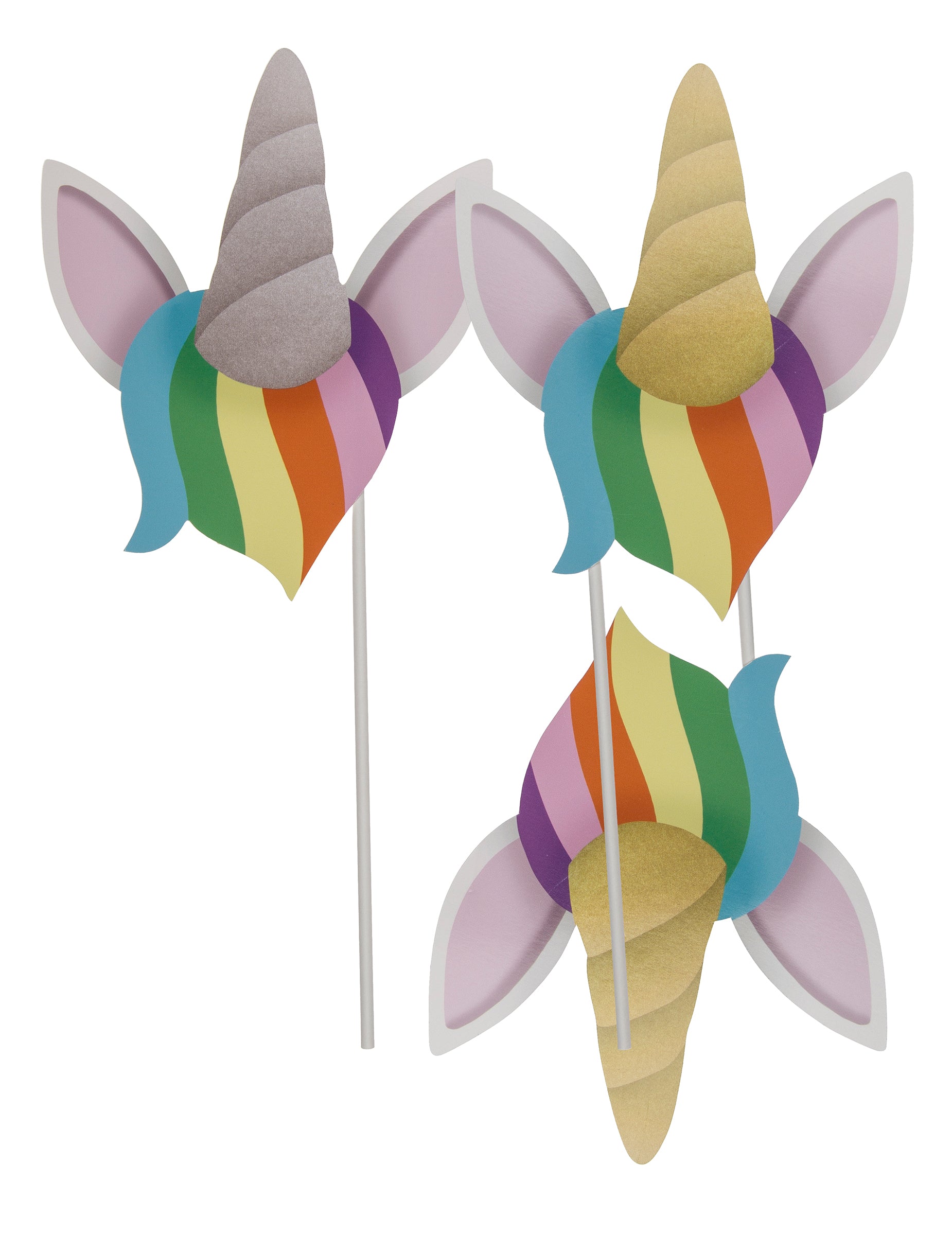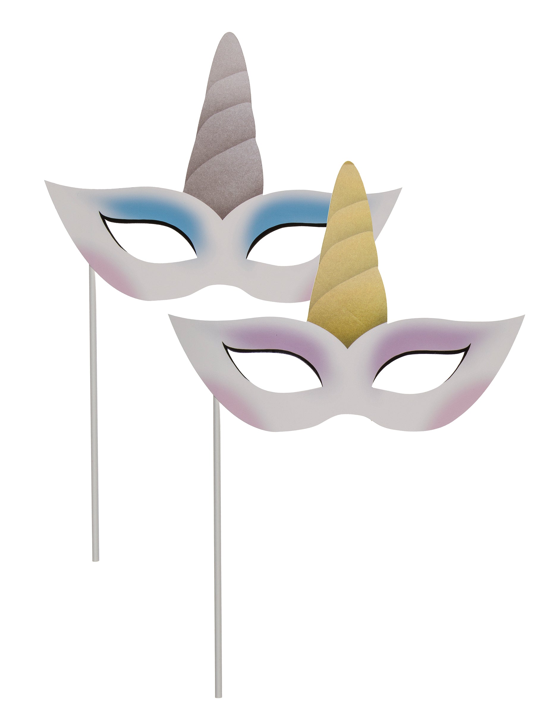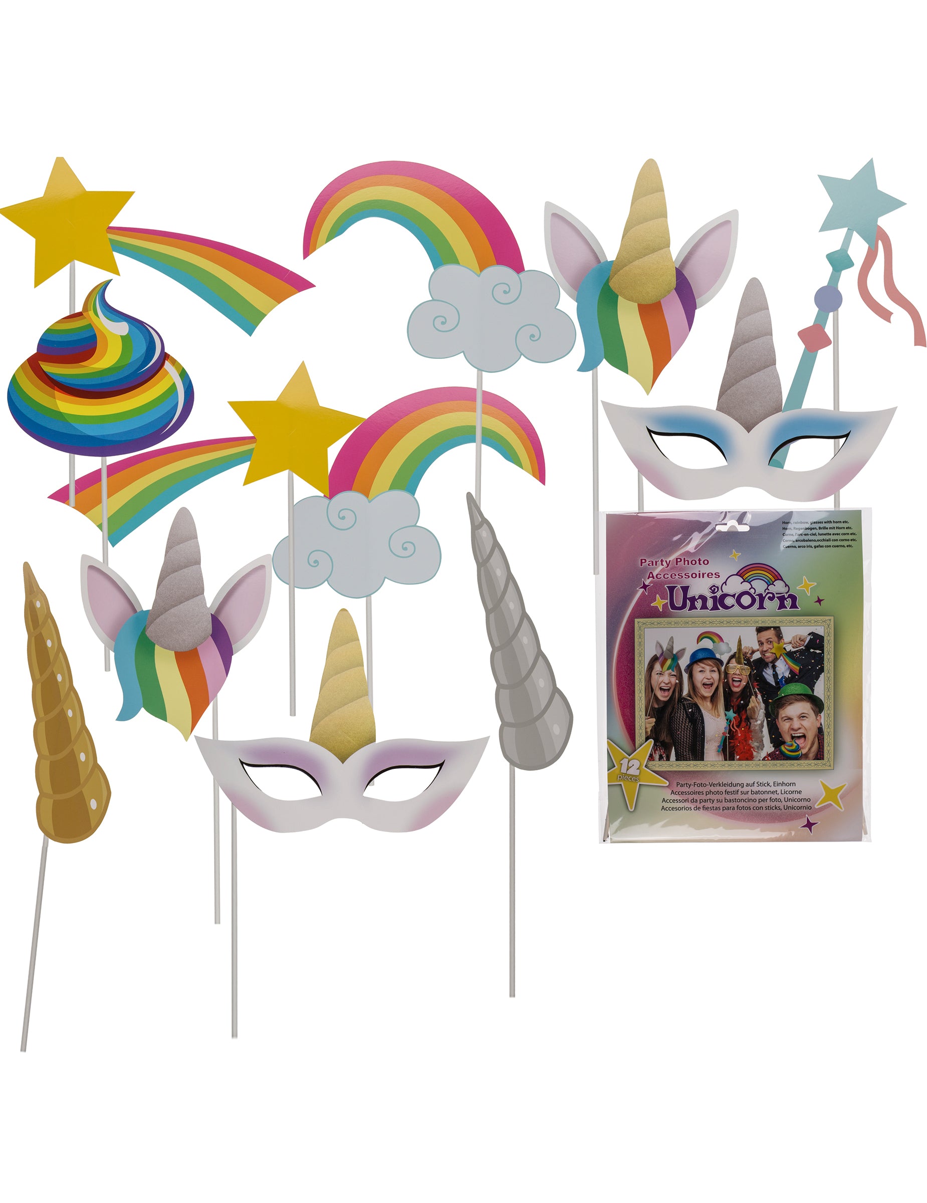Състои се от 12 празнични предмета за носене, този комплект за фотокабина с еднорог превръща всеки кадър в омайващ момент. Златни рога, маски, наподобяващи приказни същества, цветни панделки и блестящи звезди се съчетават, за да създадат серия от аксесоари с приказен чар.