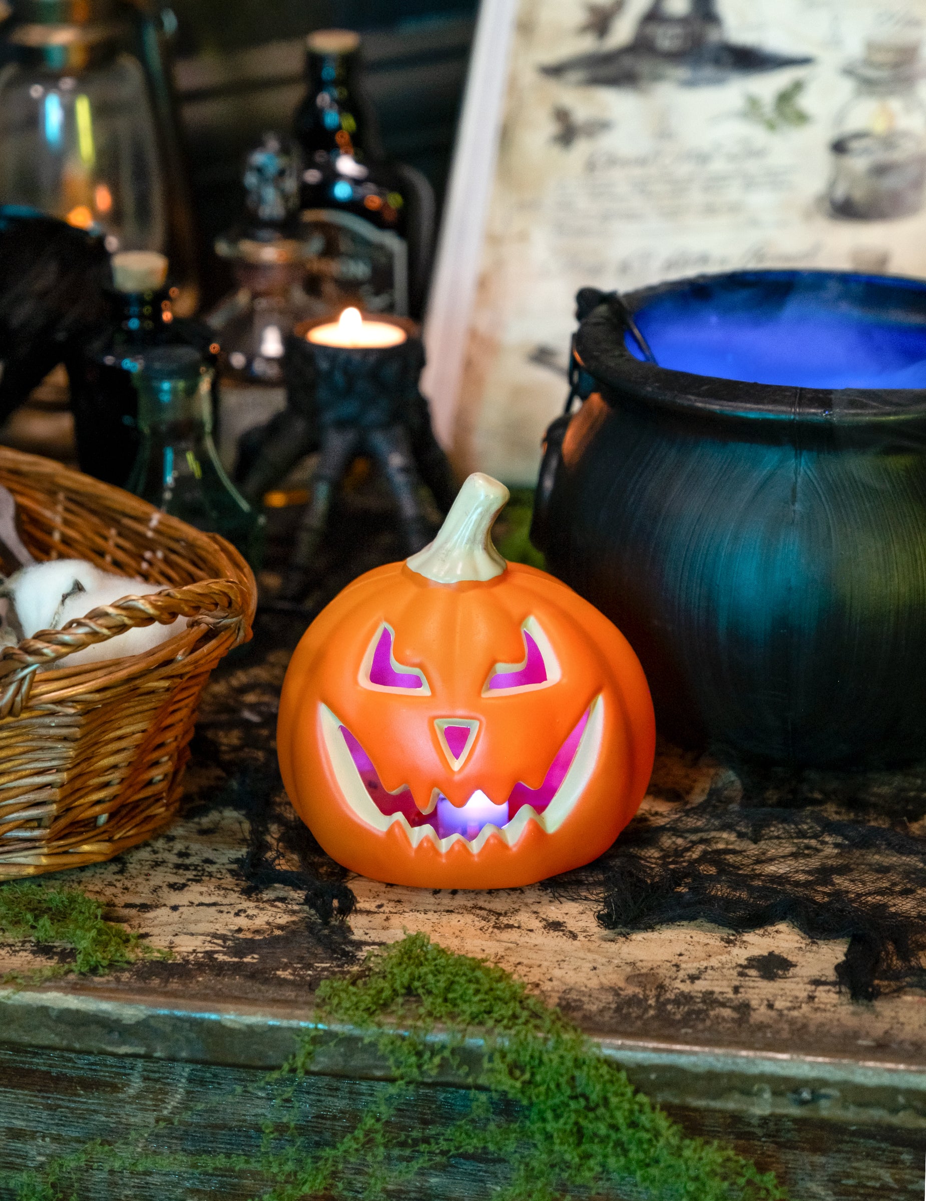Добавете нотка мистерия към вашия декор с тази светеща оранжева тиква (13 см) cm. Захранван от 3 включени батерии LR44, той излъчва зловеща светлина, която засилва атмосферата на Хелоуин. Идеален за парти, той се слива безпроблемно както с декорацията на вашия интериор, така и с открити пространства.