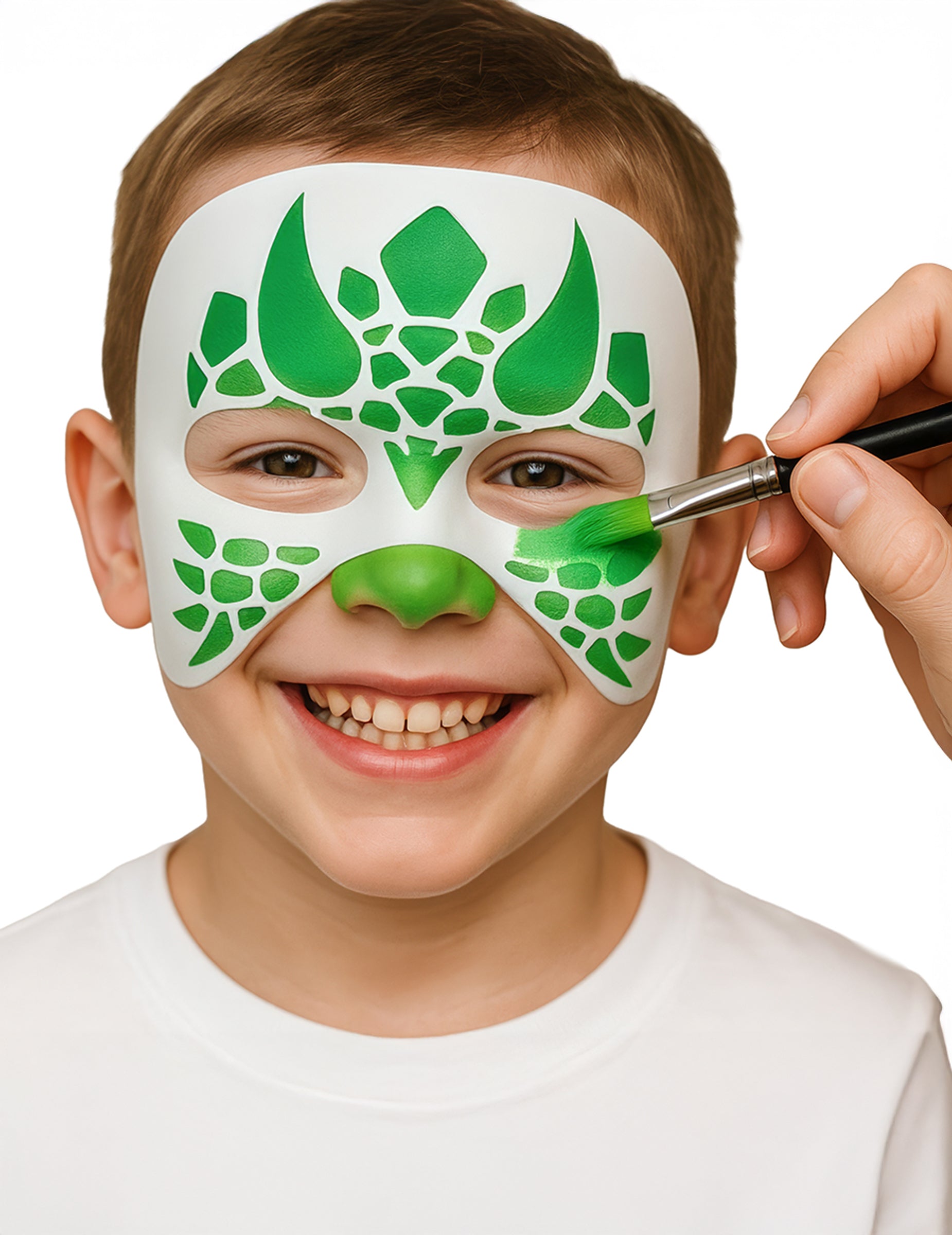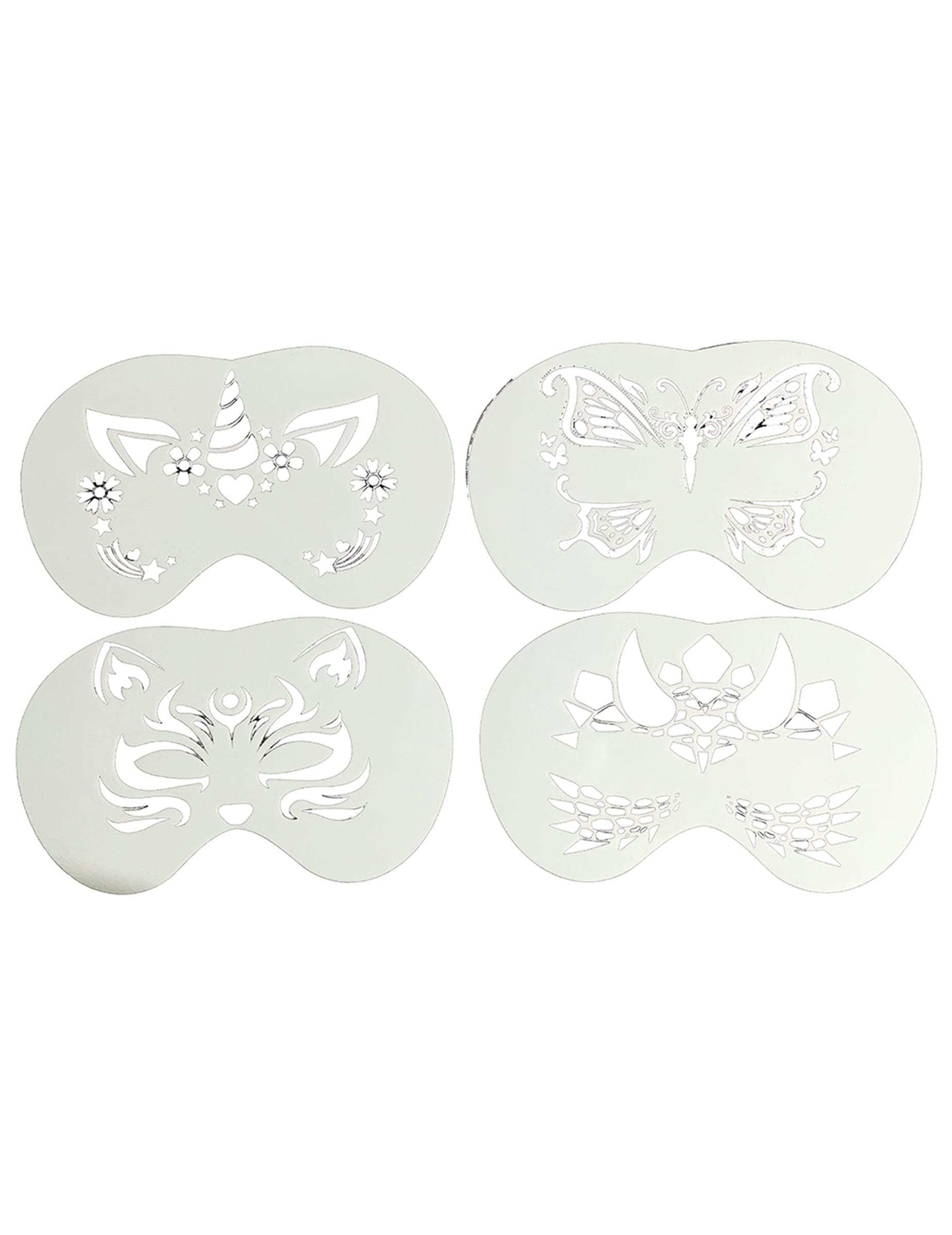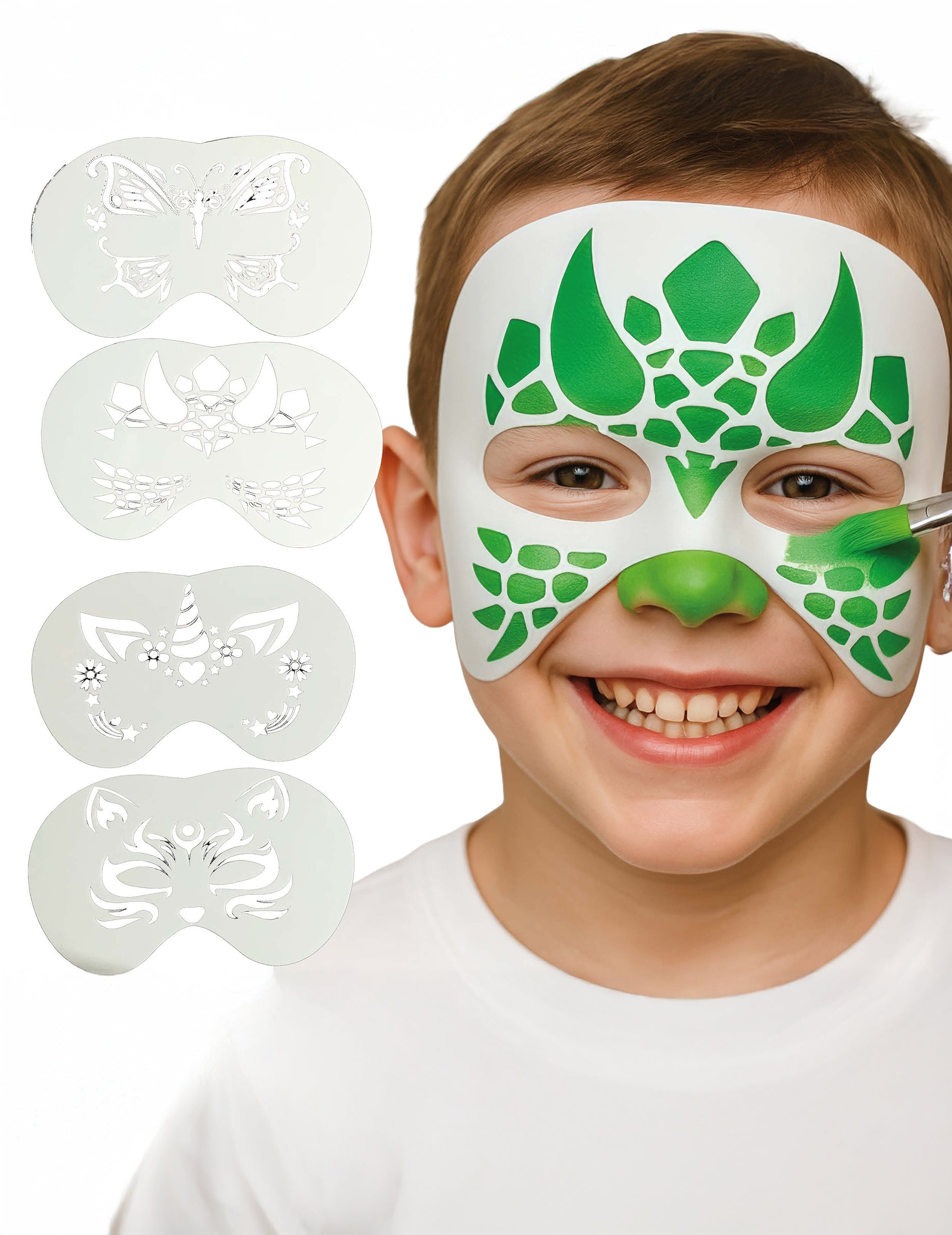 Този комплект включва четири шаблона за многократна употреба, специално разработени за деца. Те ви позволяват бързо да създавате оригинални дизайни за рисуване на лице във формата на дракон/динозавър, пеперуда, еднорог и котка. Благодарение на прецизния си крой, те са лесни за нанасяне върху лицето и гарантират чист резултат, дори за начинаещи. Идеални за рождени дни, карнавали, училищни партита или Хелоуин, тези шаблони гарантират забавно, бързо и креативно рисуване на лице.