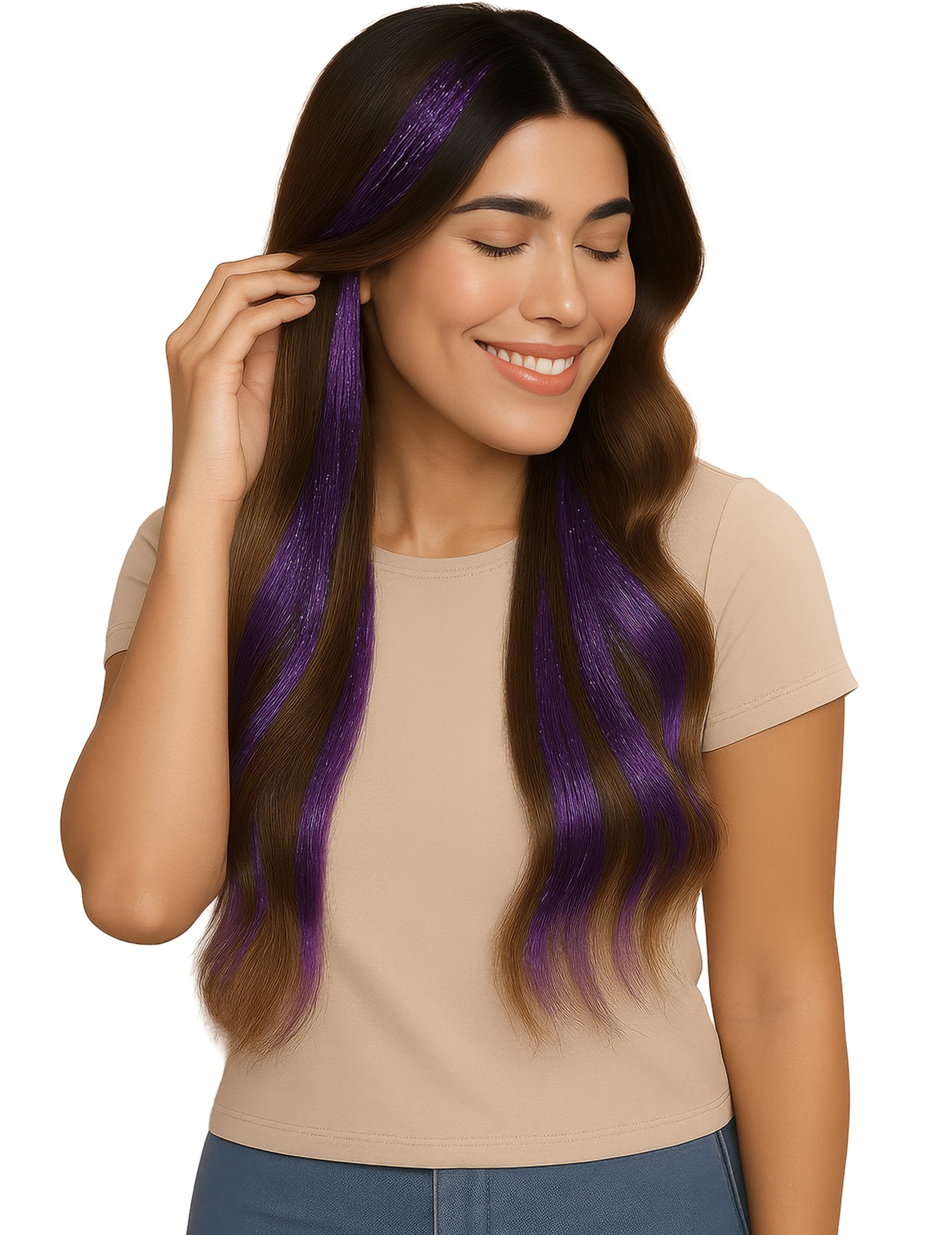 Ajoutez une touche de couleur vibrante à vos cheveux grâce à ces 3 mèches brillantes violettes de 50 cm. Simples à clipser, elles se posent en quelques instants pour transformer votre look en un style original et éclatant. Parfaites pour les fêtes, festivals, soirées costumées ou déguisements, ces mèches scintillantes apporteront une touche glamour et fantaisie à votre coiffure. Un accessoire idéal pour se démarquer et briller en toute occasion.
