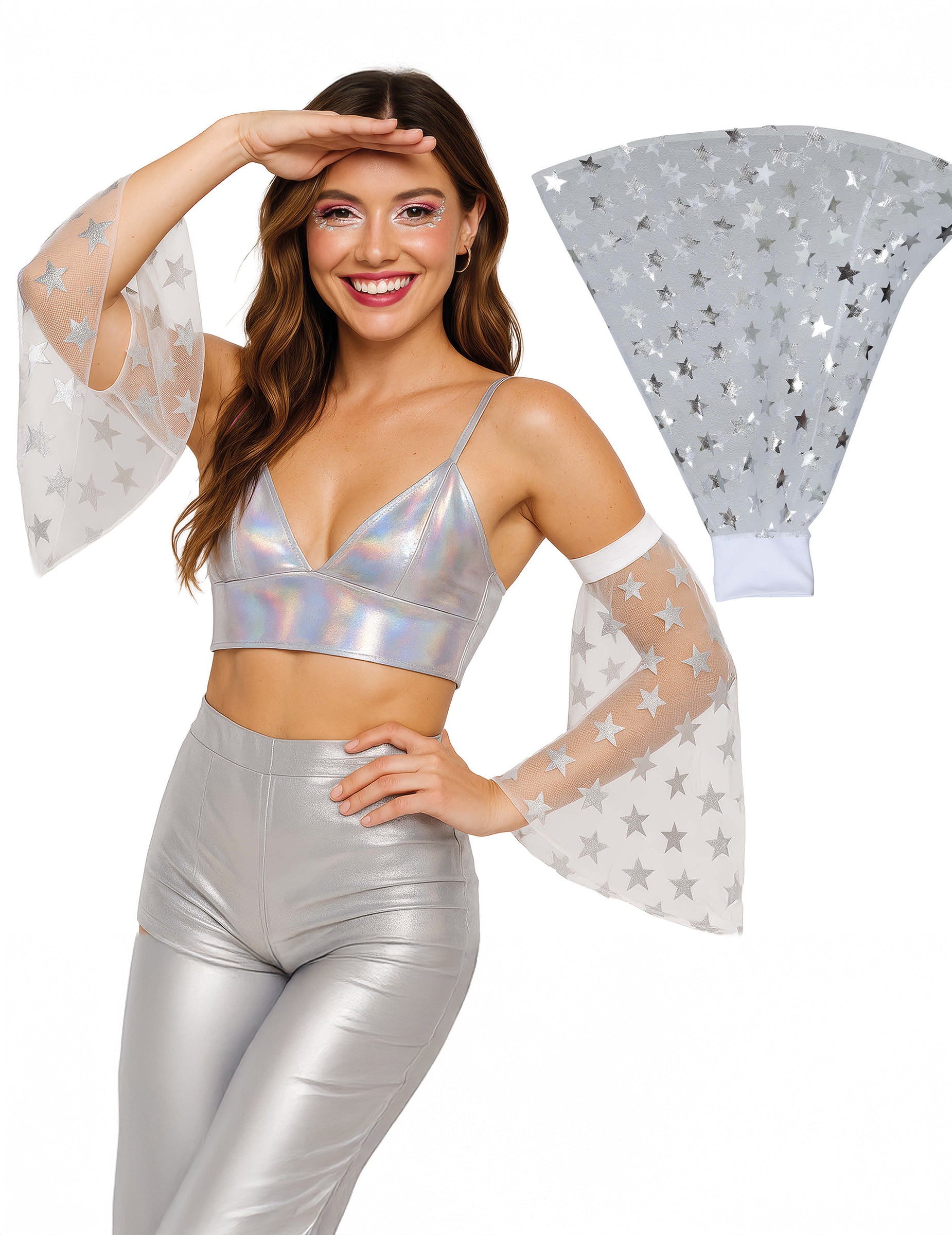 Добавете блестящ акцент към вашия костюм с тези сребристи диско маншети, украсени с блестящи звезди. Изработени от лека прозрачна материя, те се носят лесно благодарение на еластичната китка, което осигурява комфорт и стабилност през цялата вечер. Идеални за диско визия, фестивал, парти с костюми или карнавал, те ще озарят движенията ви и ще подчертаят танцовите ви жестове.