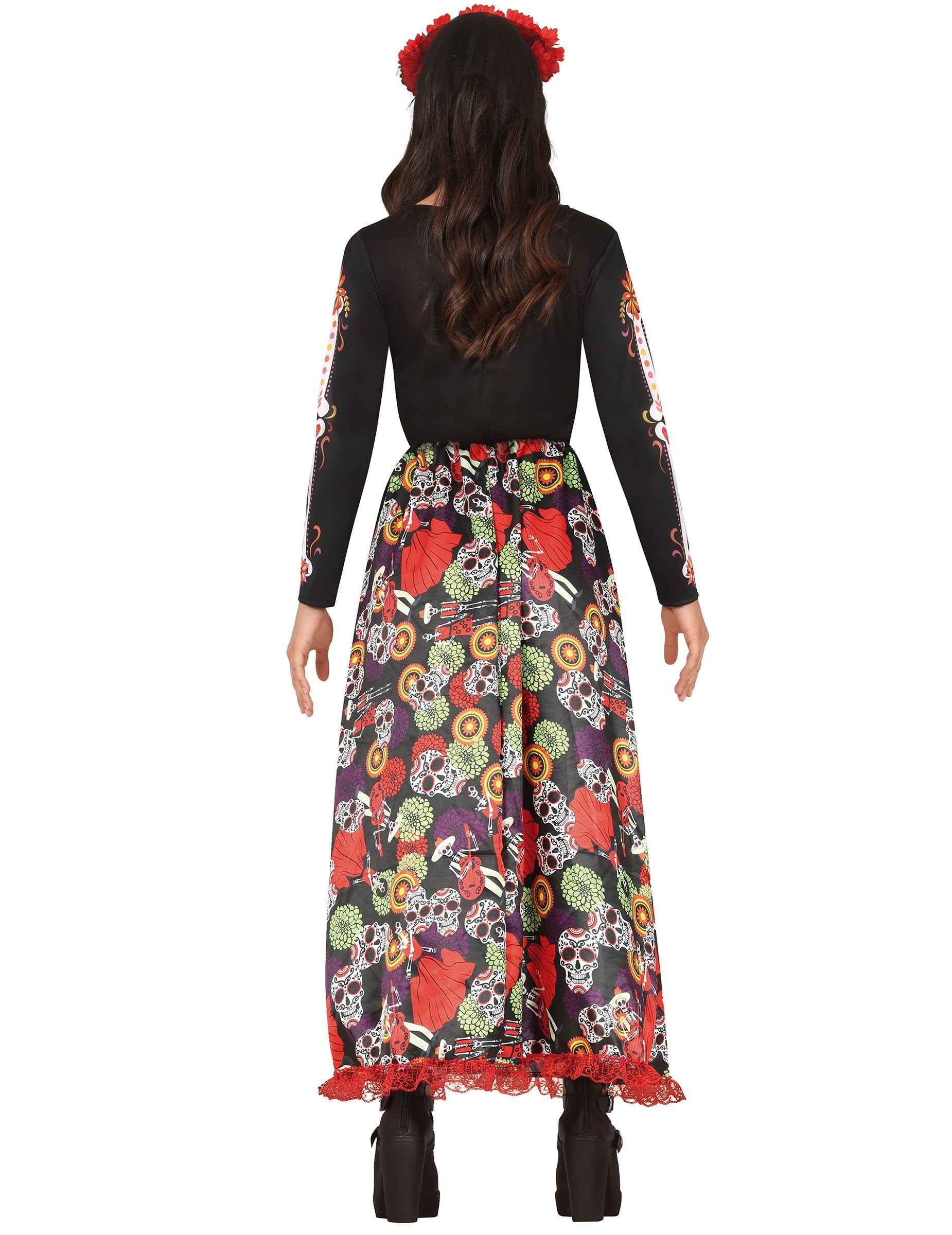 Plongez dans l’univers du Dia de los Muertos avec ce somptueux déguisement féminin aux couleurs éclatantes. La robe longue est ornée de motifs de crânes, de fleurs et de détails festifs, accompagnée d’un haut décoré façon squelette pour un contraste saisissant. La ceinture de fleurs colorées apporte une touche élégante et traditionnelle. Le serre-tête à fleurs rouges complète parfaitement la tenue, rendant ce costume idéal pour une soirée d’Halloween, un carnaval ou une fête à thème mexicain.