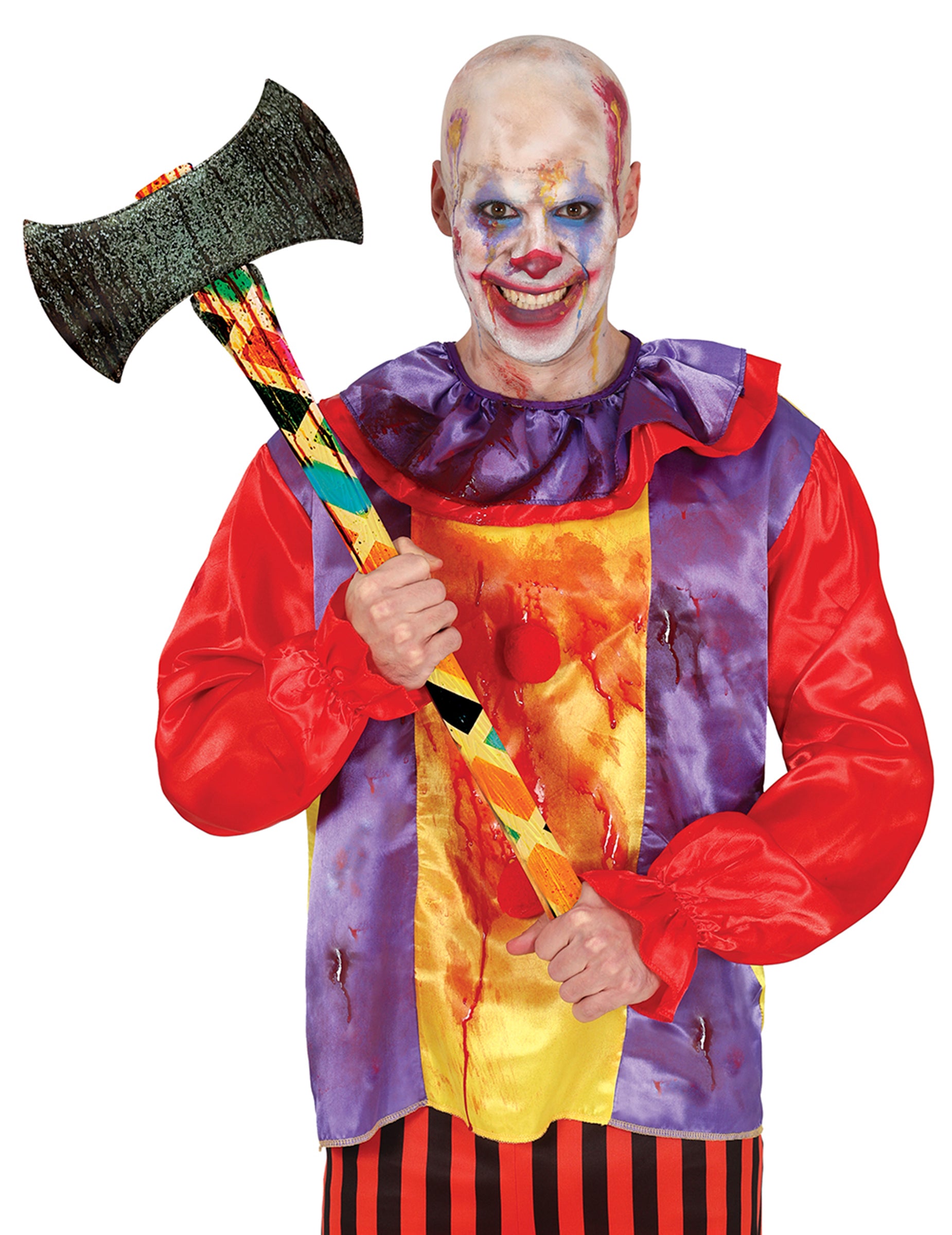 Този клоунски брадва с дължина около 73 cm е перфектното оръжие за всяване на страх. С дръжка, украсена в циркови цветове, и черно острие с ефект на стареене, тя контрастира между детския свят на спектакъла и бруталността на едно зловещо парти аксесоарче.