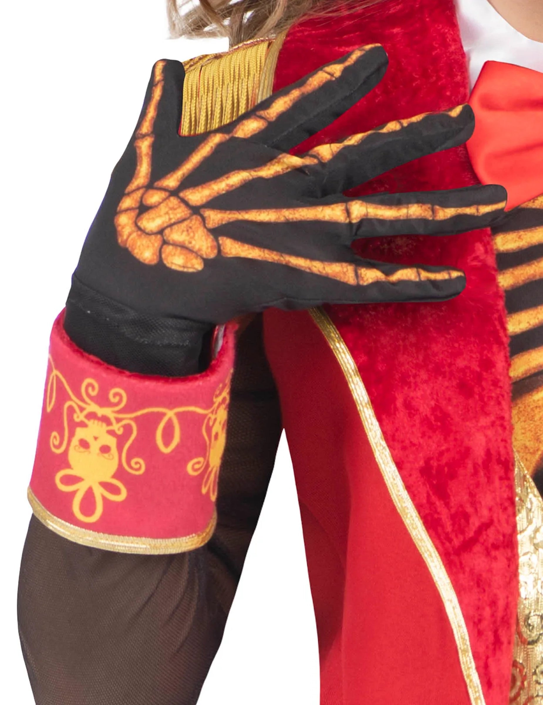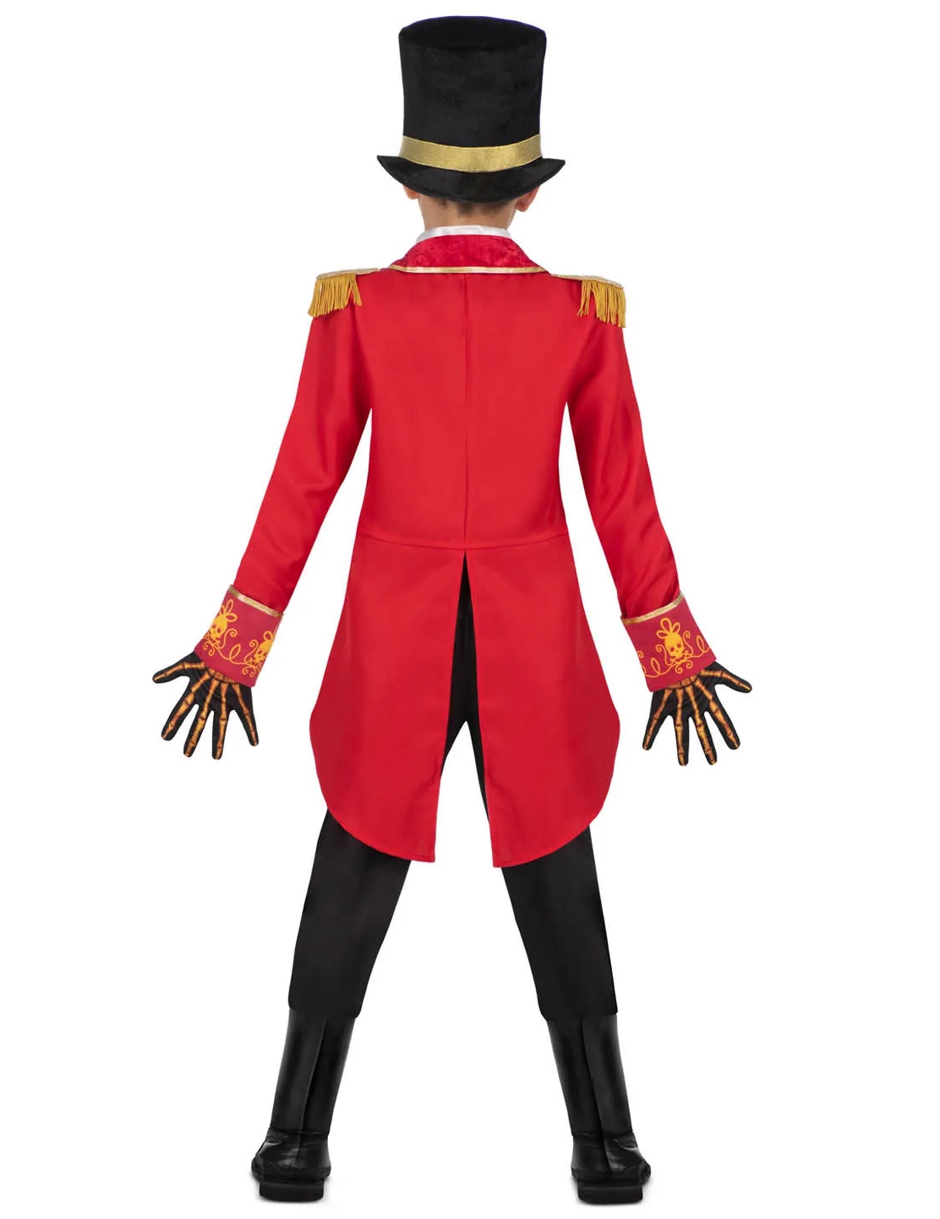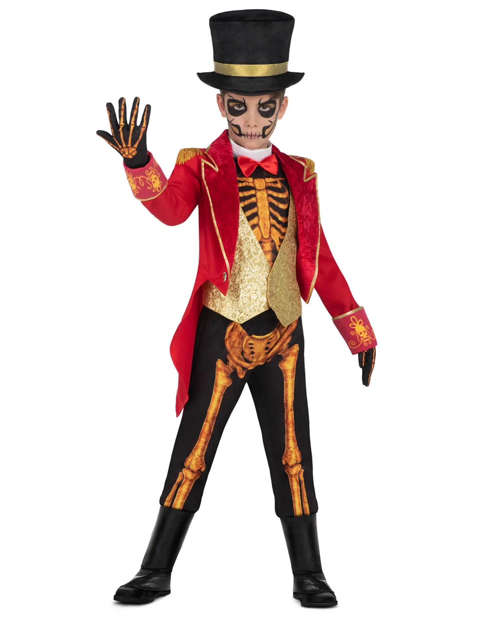 Черният цилиндър със златна лента допълва този впечатляващ силует, докато ръкавиците с видими кости подсилват ефекта на скелет до върха на пръстите. Накрая, черните ботуши завършват тоалета по безупречен начин.