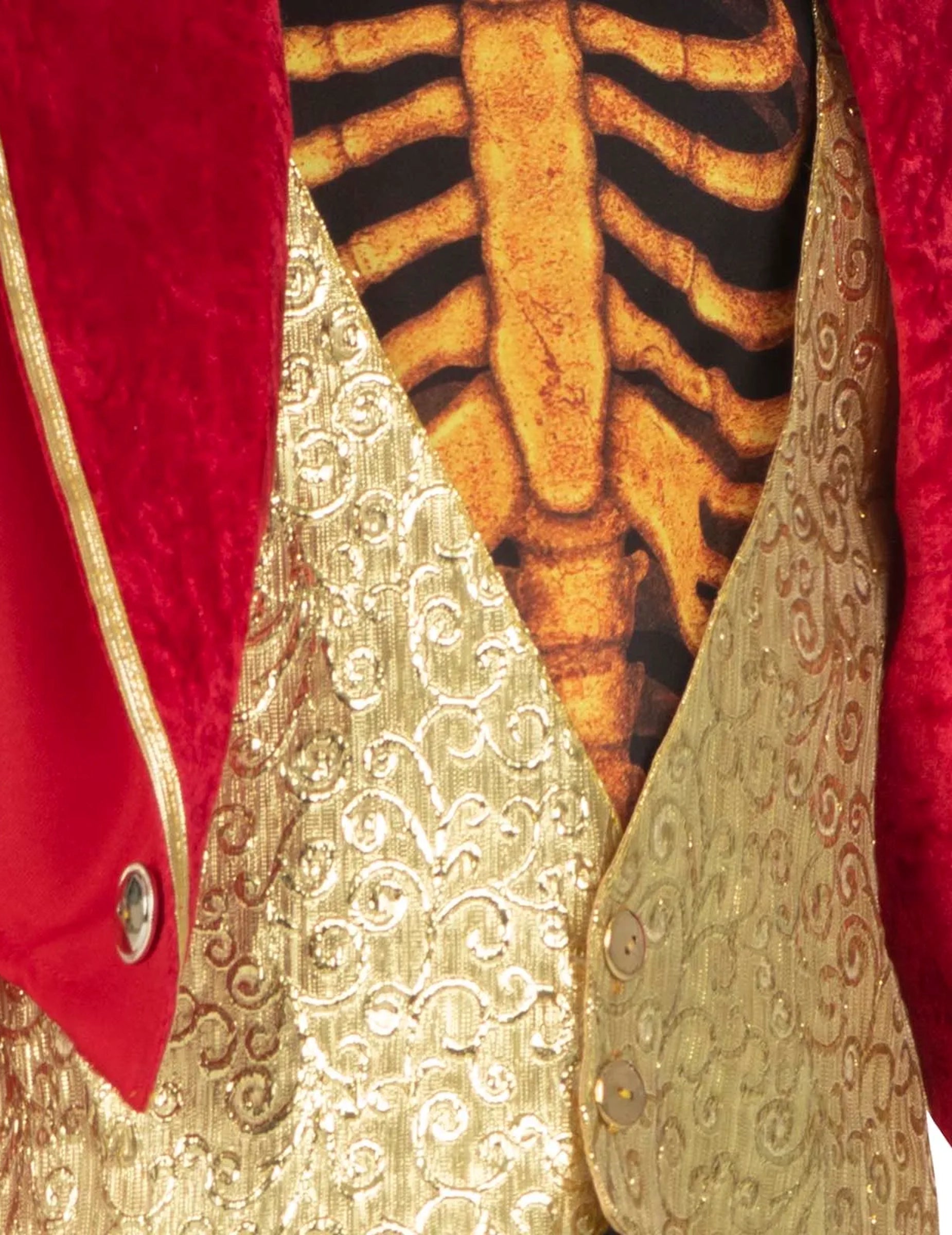 Червената фрак с опашки и златни мотиви по ръкавите и еполетите придава изискан и театрален вид. Тя е пришита към блестящ златен елек, който имитира черна риза и червена вратовръзка. Черният панталон е отпечатан с скелет в меден цвят, ясно видим както на торса, така и по краката.