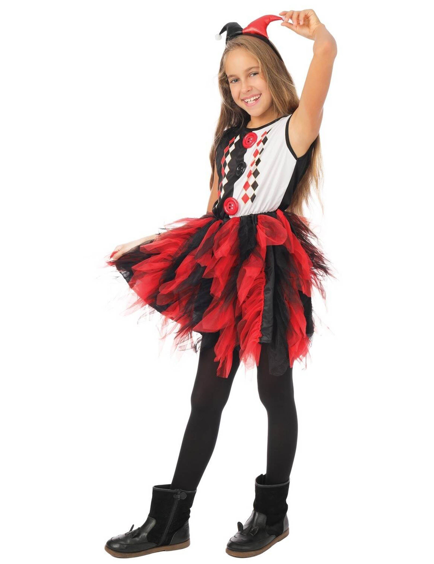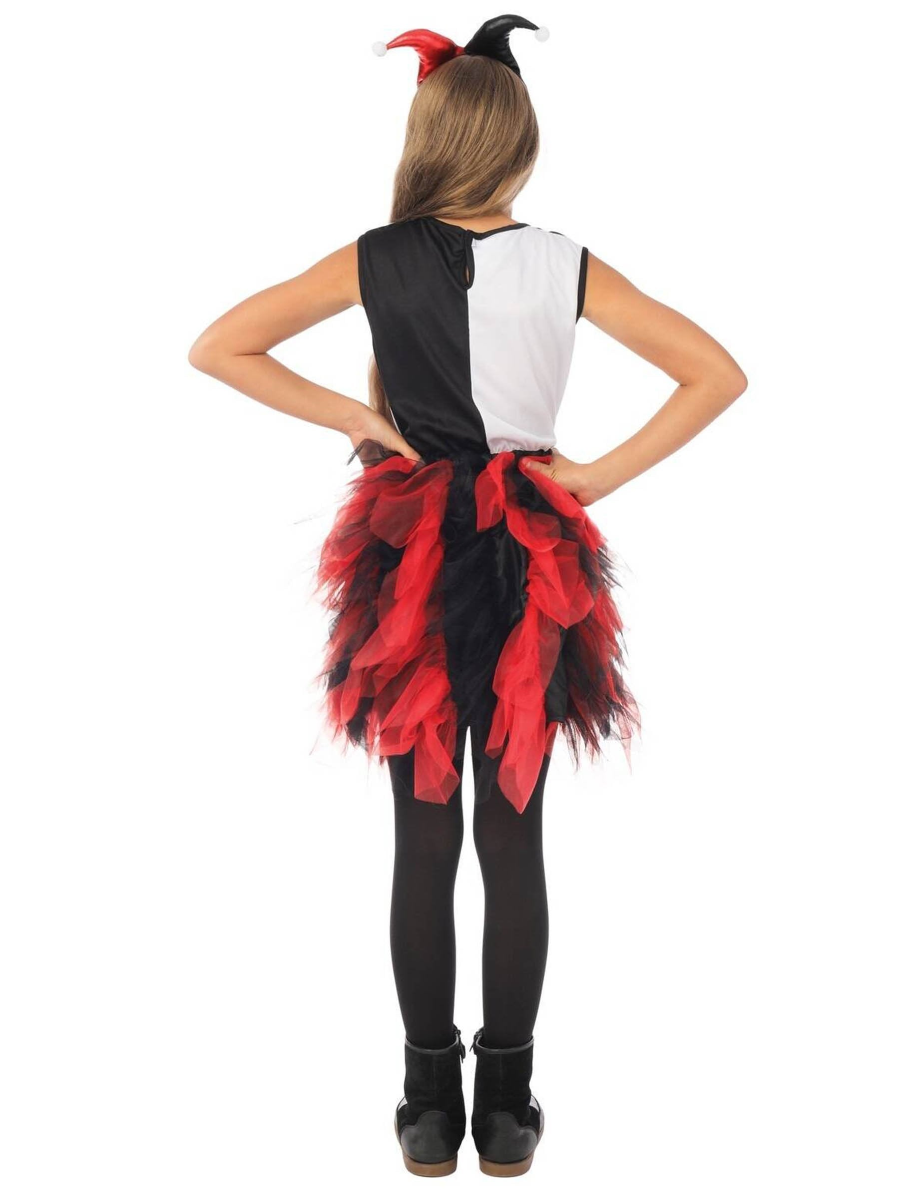 Този карнавален костюм на арлекин за момиче се състои от двуцветна рокля в черно, бяло и червено, украсена с черен и червен тюлен фустан за обем и празничен ефект.