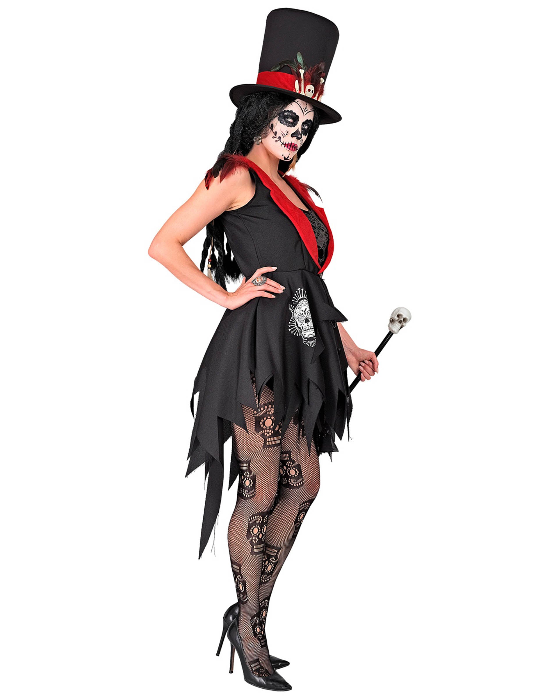 С този вуду господарски костюм се потопете в света на окултните ритуали. Асиметричната черно-червена рокля в комбинация с цилиндър, украсен с пера и черепи, ще ви придаде омагьосваща визия. Идеален за превъплъщение като вуду вещица, изпълнена с харизма и мистерия.