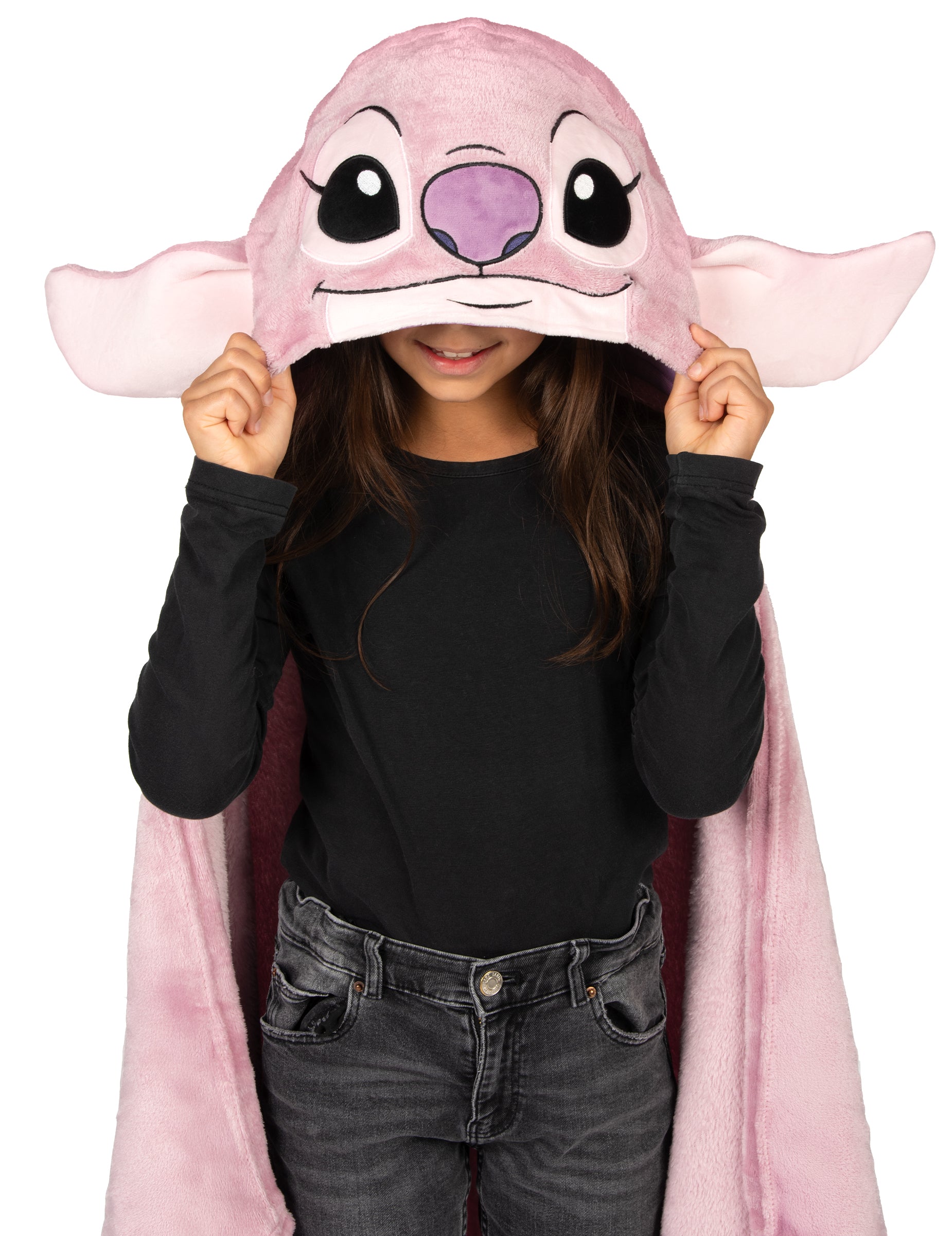 Този костюм Angel поларено одеяло с качулка Lilo & Stitch™ е идеален, за да обгърне децата в балон от комфорт. С качулката, украсена с очарователното лице на Angel и големите меки уши, той добавя нежна и игрива нотка към моментите на уют у дома.