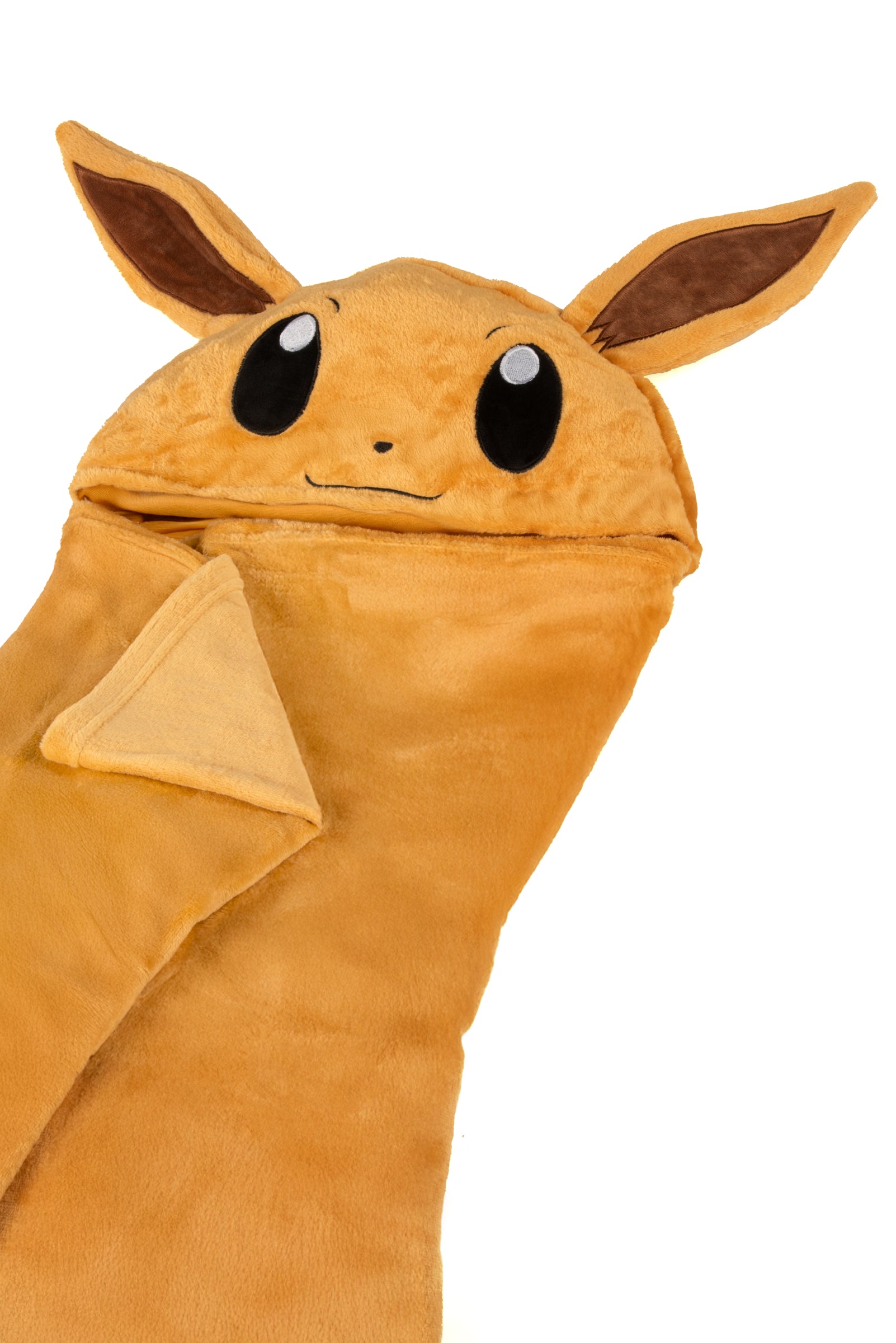 Това Поларено одеяло с качулка за костюм Pokémon™ Eevee Обгръща децата в облак от топлина и мекота. С качулката си, украсена с големи уши и очарователни очи. на ИйвиТова одеяло се превръща в истински спътник за тихи моменти или игри у дома.