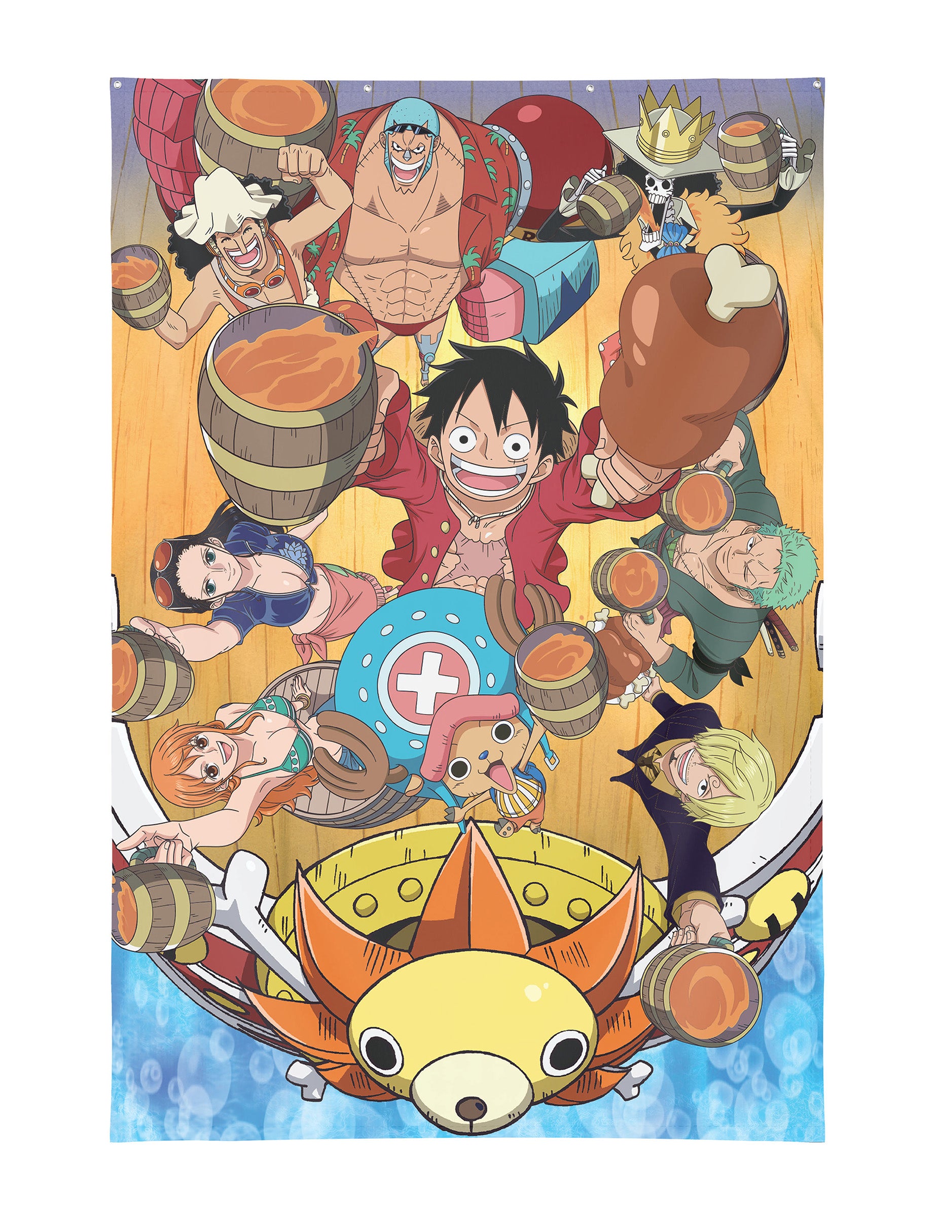 Тази стенна декорация One Piece™ уловява празничния дух на екипажа на Сламената шапка по време на тържество на борда на Thousand Sunny. Лъфи, Зоро, Санджи, Нами, Чопър, Франки, Брук, Робин и Усоп са събрани около бъчви и лакомства, готови да вдигнат чаша в радостна и приятелска атмосфера.