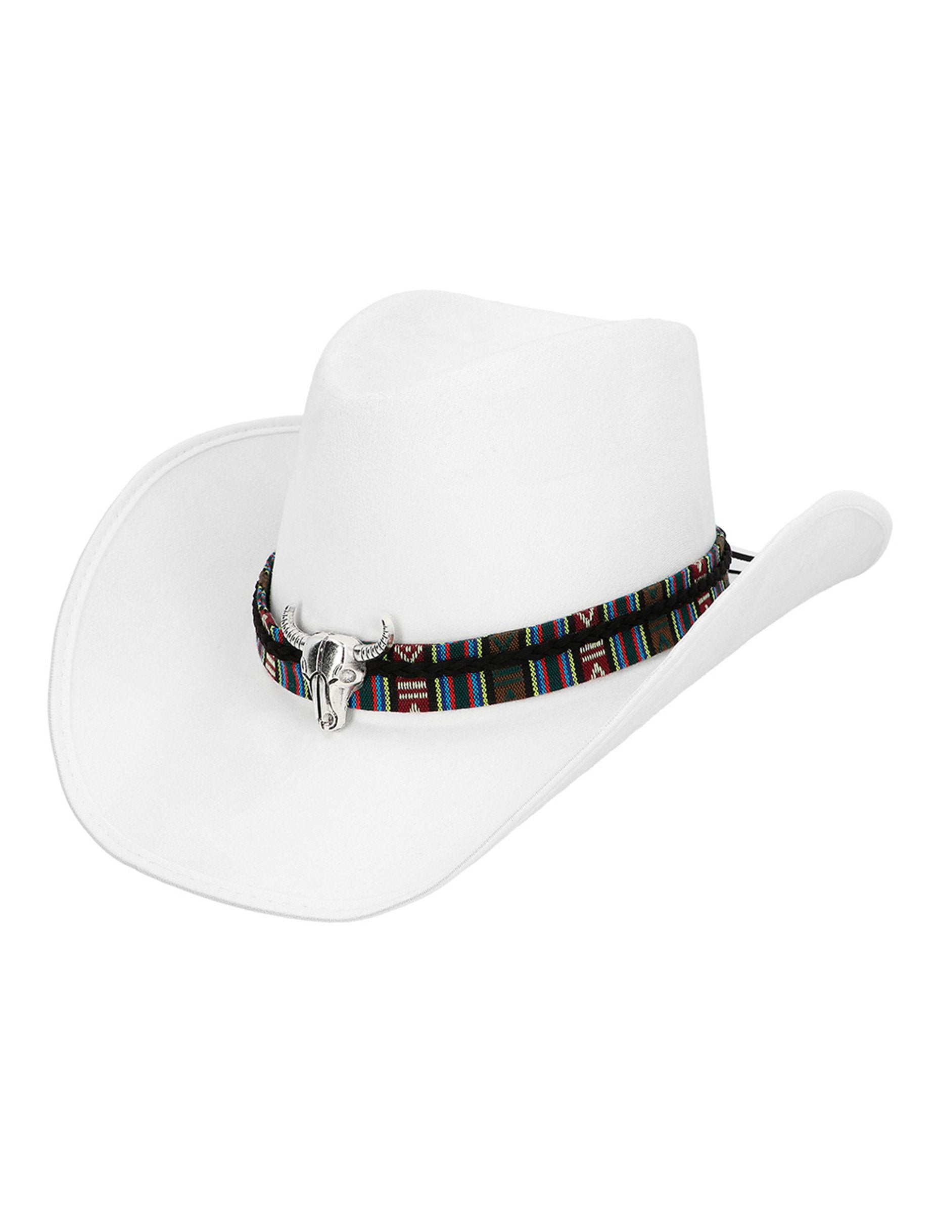 Тази бяла каубойска шапка за възрастни се отличава с отличителна метална бизонска глава, монтирана на декоративна лента с етнически шарки. Светлият ѝ цвят и материалът, наподобяващ велур, ѝ придават ярък и автентичен стил. Идеален аксесоар за завършване на облекло за карнавал, Нова година или събитие с уестърн тематика.
