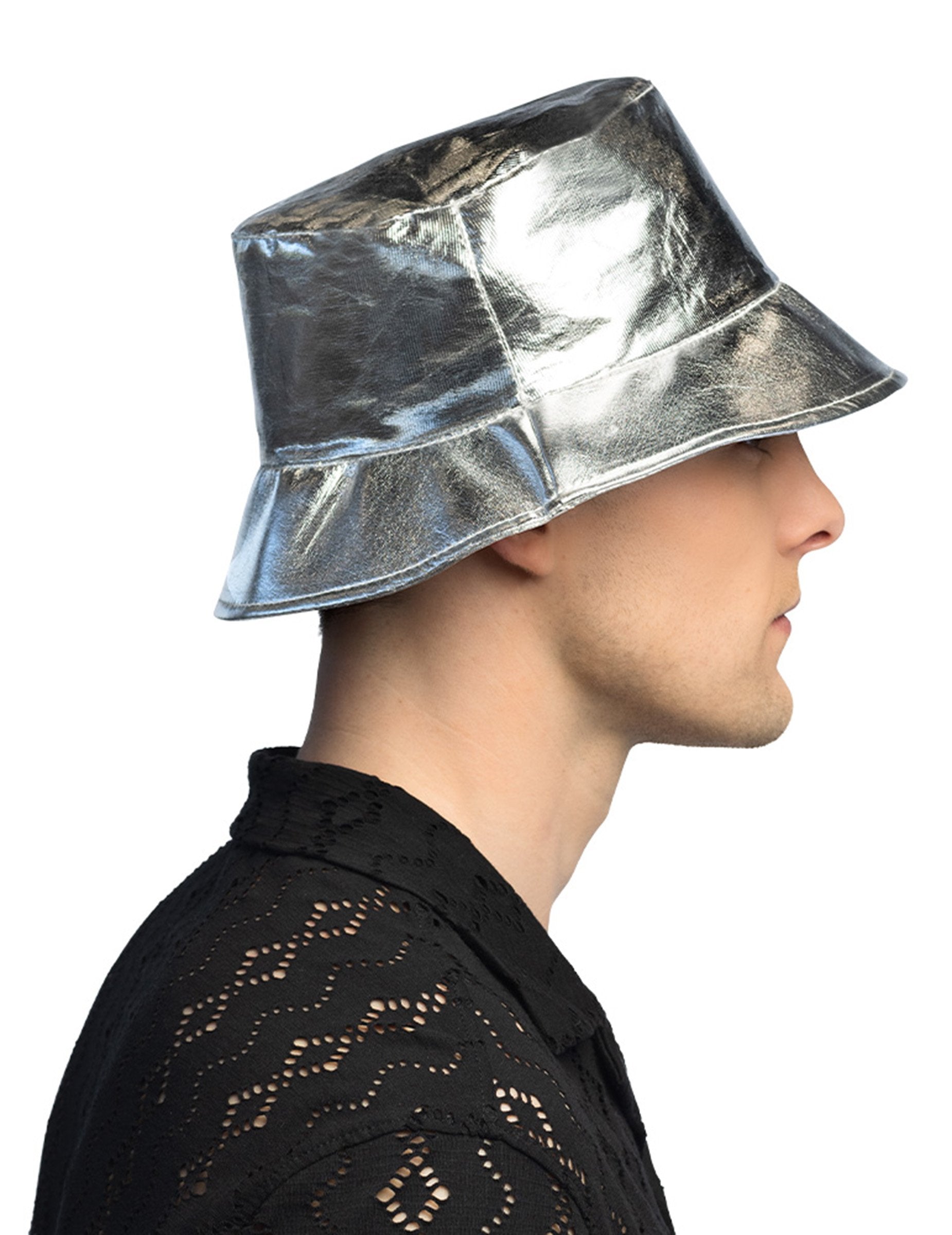 Тази сребриста метална шапка тип „кофа“ е перфектният аксесоар, с който да се откроите. Универсална и оригинална, тя допълва както ретро, така и футуристични костюми, или просто ексцентричен тоалет за Хелоуин, карнавал или фестивал. Уникалният ѝ блясък ще ви направи звездата на вечерта.
