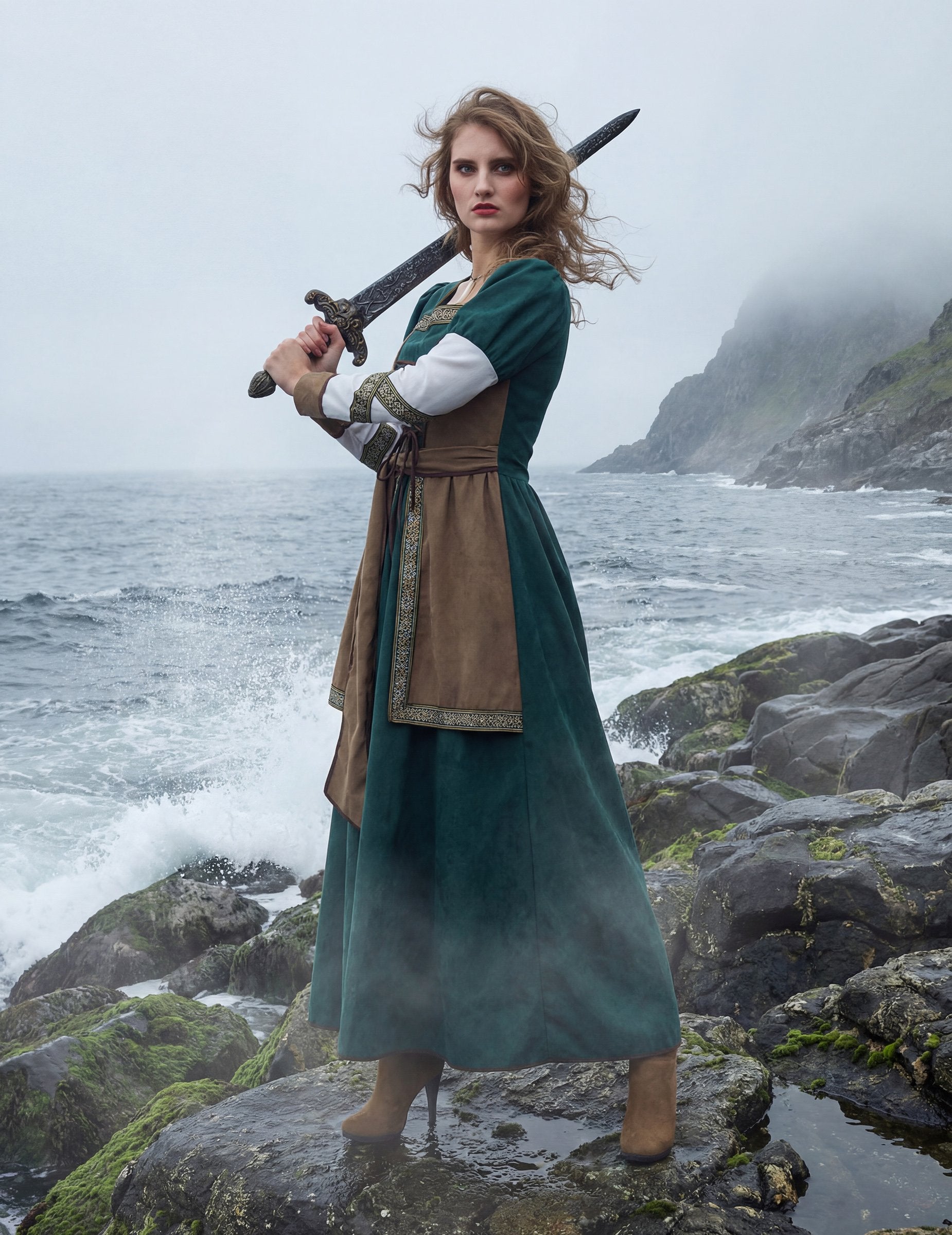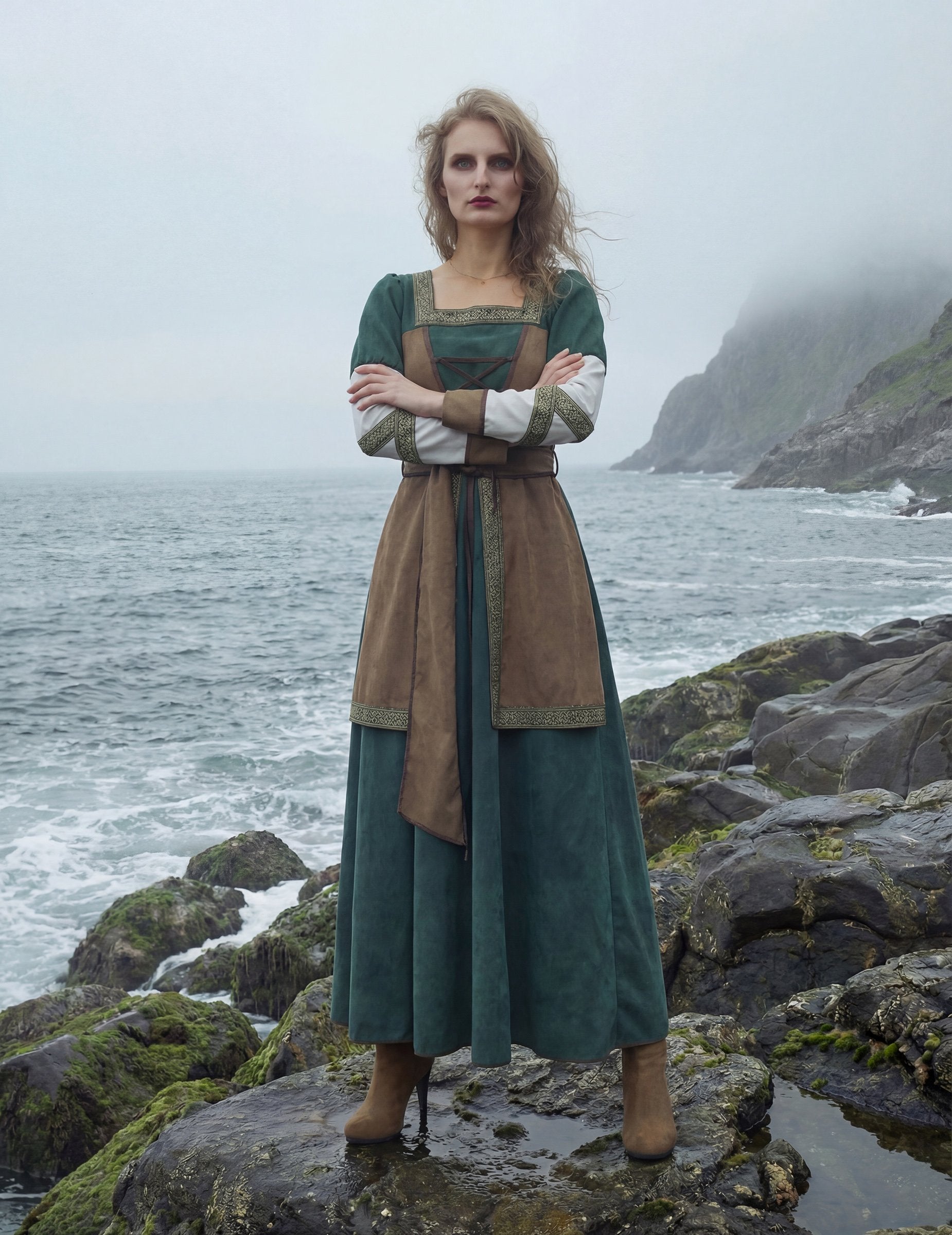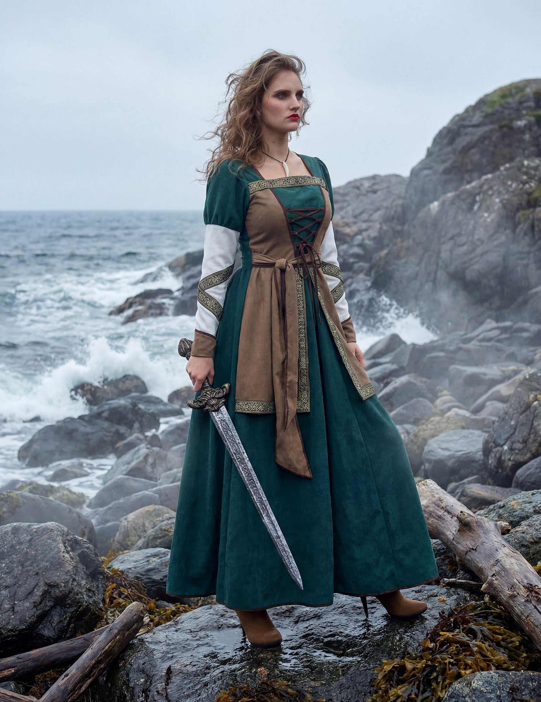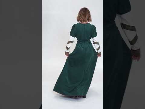 Изработена от висококачествен полиестерен плат, роклята се отличава с наситено зелен цвят, съчетан с кафяви вложки и златисти ширити, които подчертават ръкавите и корсажа. Роклята, пристягаща се с връзки на бюста и подходящ колан, оформя женствена и внушителна силуета – перфектна комбинация от елегантност и сила. Лека и удобна, тя осигурява пълна свобода на движение и впечатляваща автентичност, достойна за истинска викингска воинствена жена.