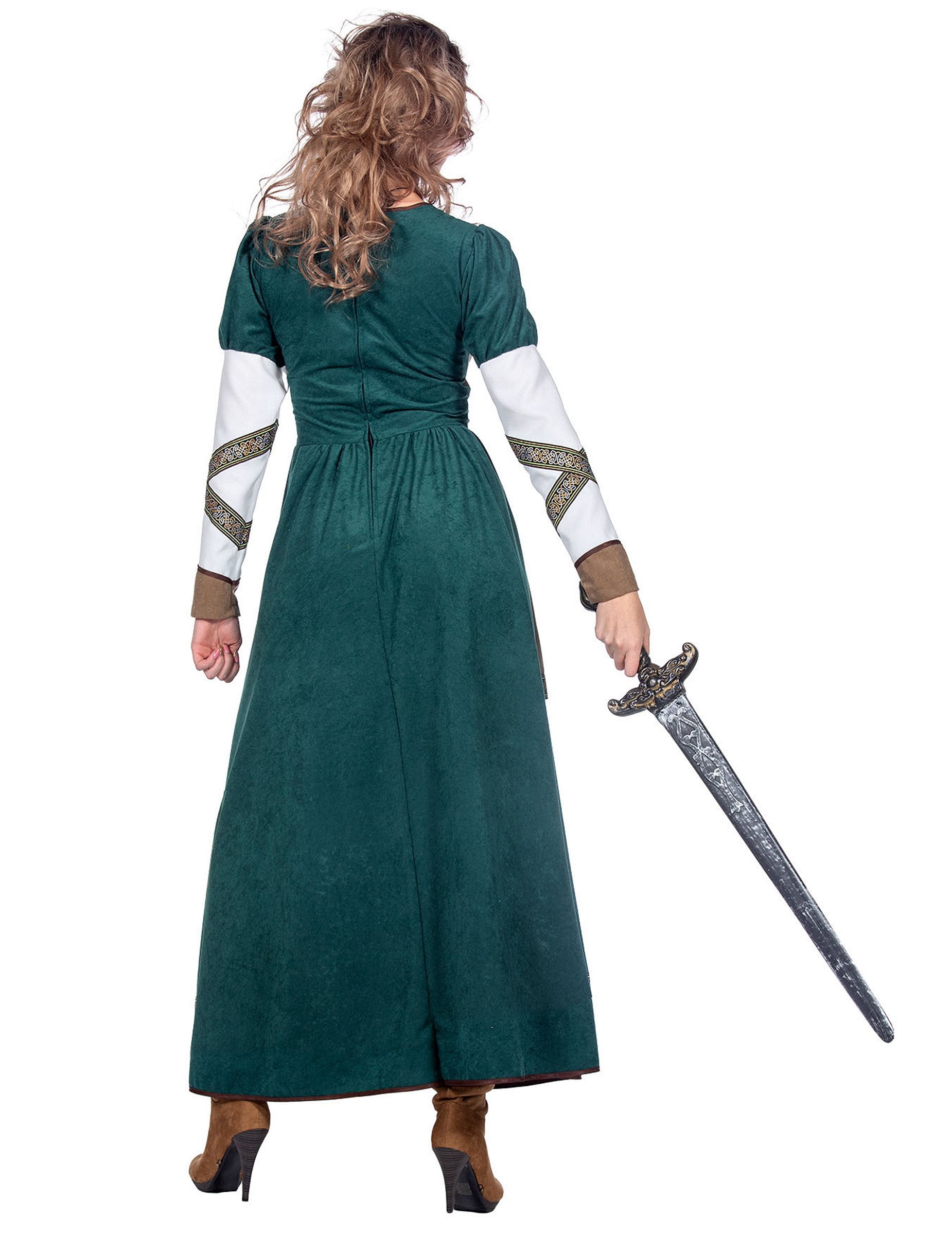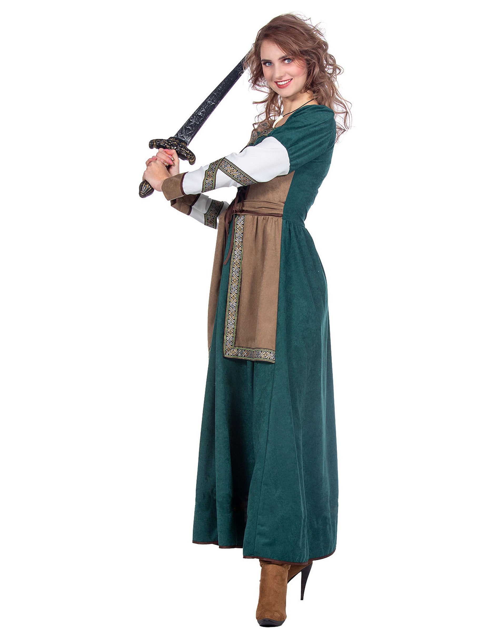 Този луксозен дамски костюм на викингска воинствена жена включва дълга средновековна рокля с прецизни детайли, идеална за превъплъщение в героиня от северните земи.