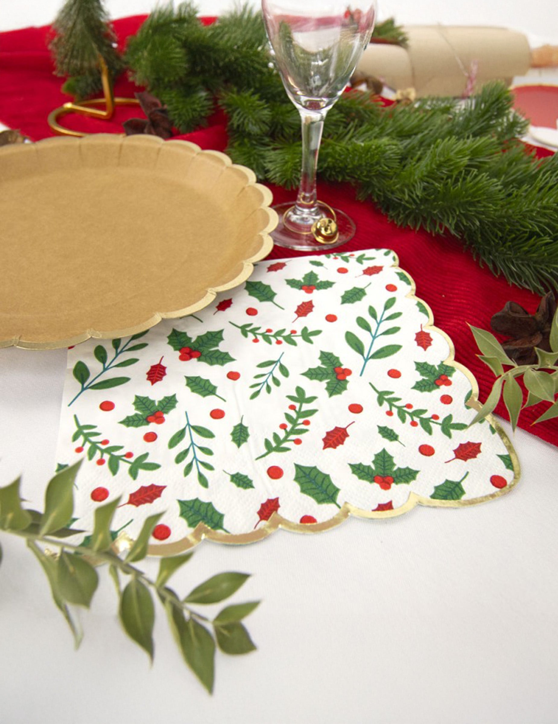 Подобрете сервировката на масата си с този комплект 16 хартиени салфетки с фестончета и коледен дизайн, 33 x 33 см cmИлюстрирани с красиви зелени листа и червени плодове, те внасят традиционен щрих във вашите тържества. Завършекът им с назъбен златист кант придава шикозен и елегантен вид на сервираната маса. Меки и абсорбиращи, те са идеални за вашите вечери. Коледа или вашите семейни събирания. Тези салфетки за еднократна употреба съчетават елегантност и практичност, за да отпразнуват магическите моменти на декември.