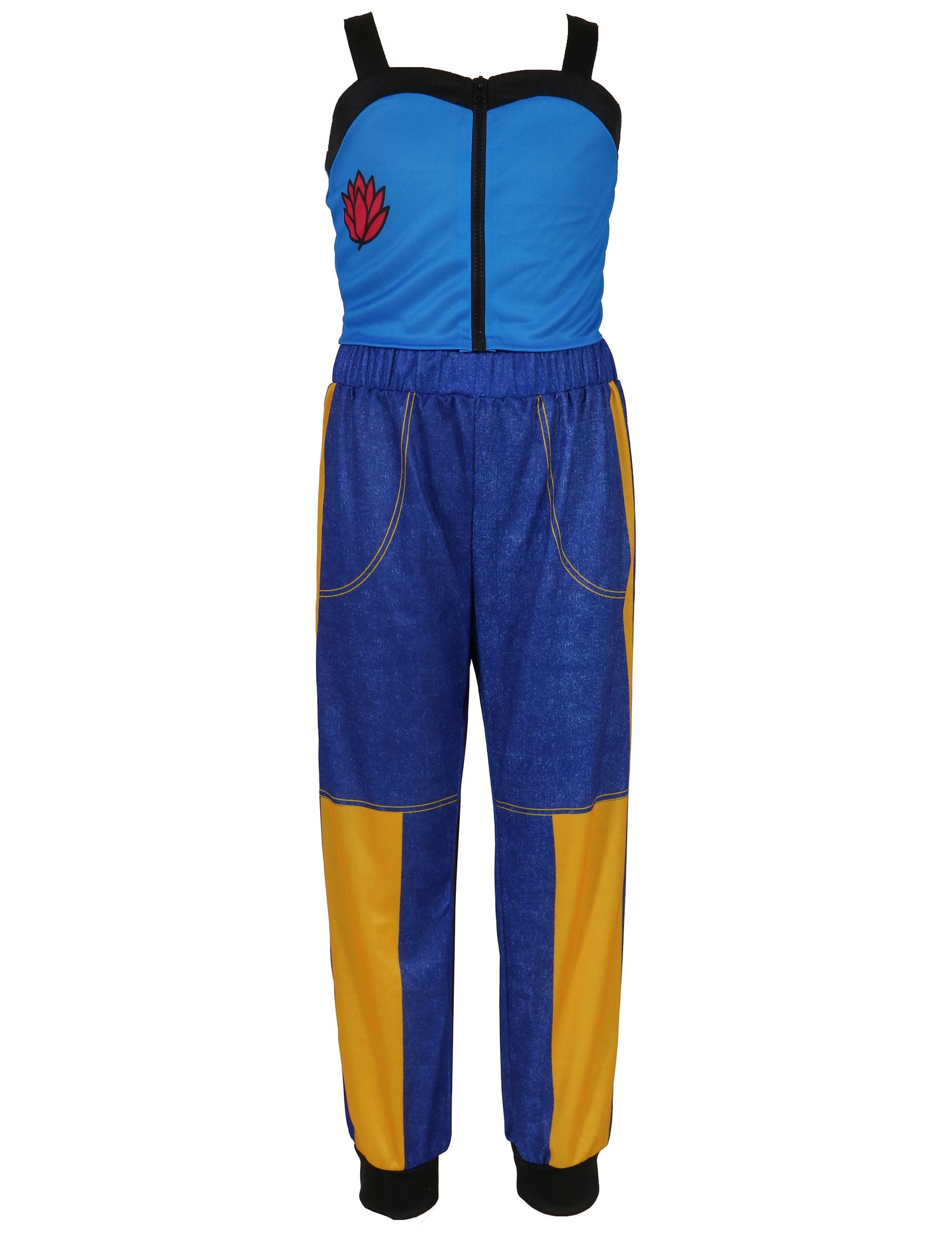 Синьо-черният топ е с цип по цялата дължина отпред, което го прави лесен за обличане. Красив флорален принт отстрани добавя мек и оригинален щрих. Панталонът е с реалистичен деним принт с ярко жълти детайли, които придават на облеклото допълнителен цветен акцент.
