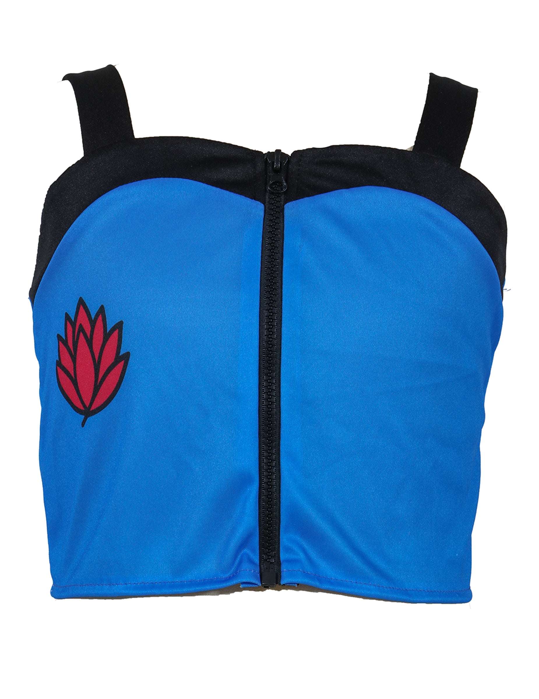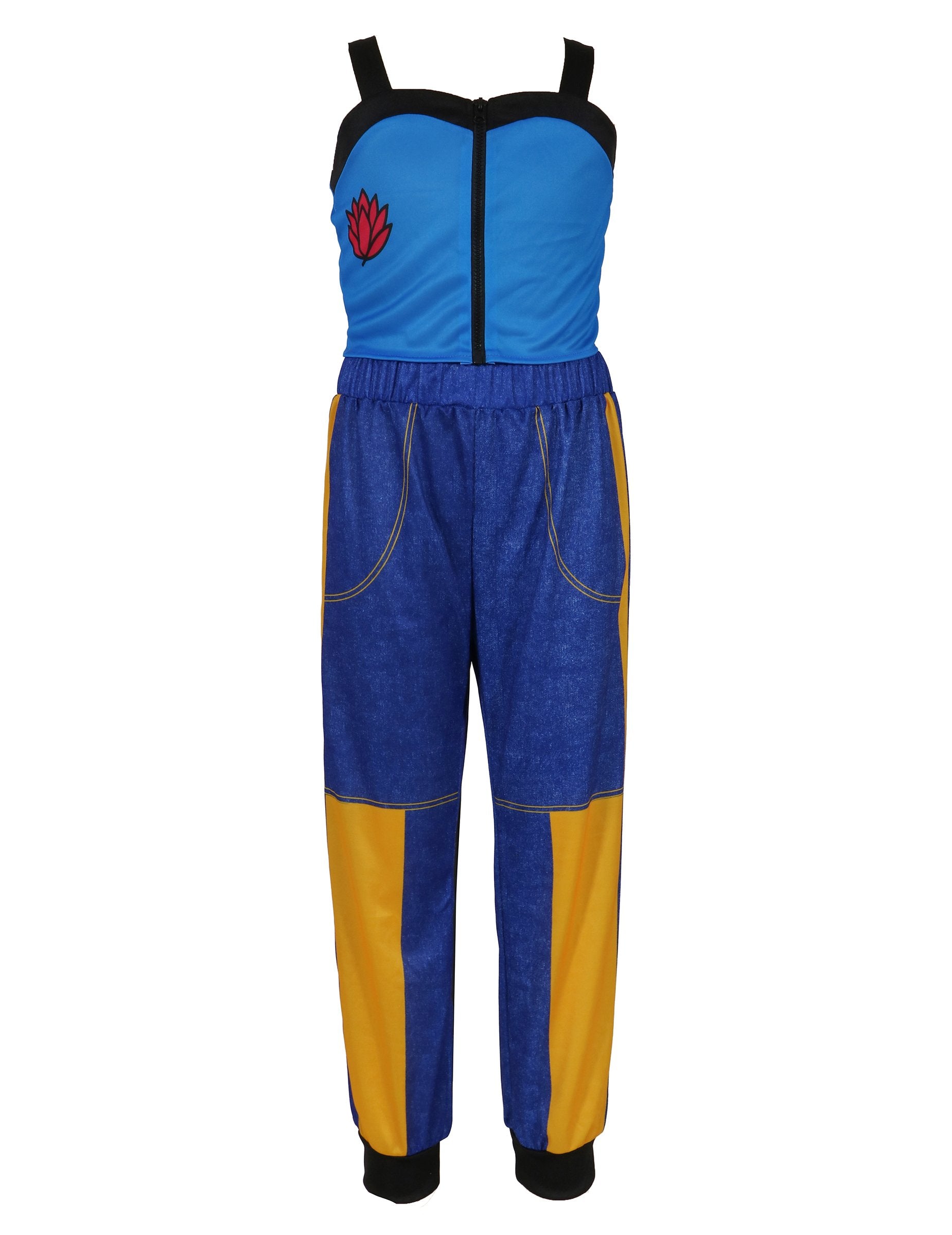 Състои се от къс син топ с цип и контрастни черни презрамки и широк панталон в синьо и жълто с големи джобове, осигуряващи комфорт и свобода на движение. Прецизните детайли и ярките цветове напомнят за бляскавия и стилен свят на най-популярните музикални клипове.