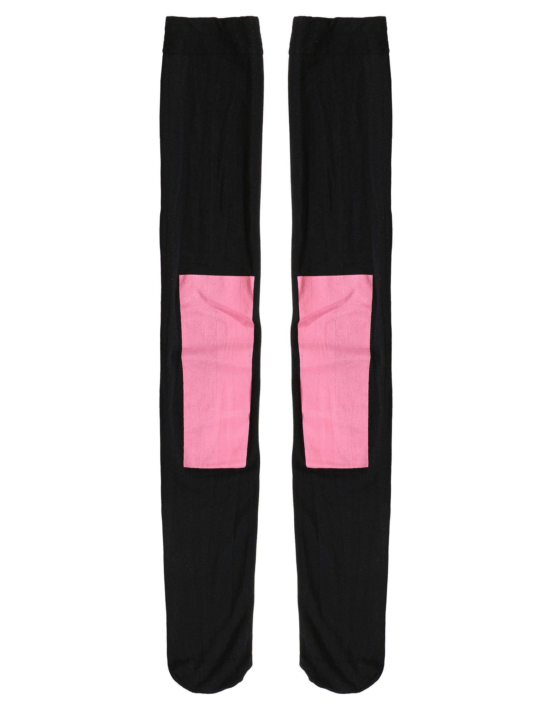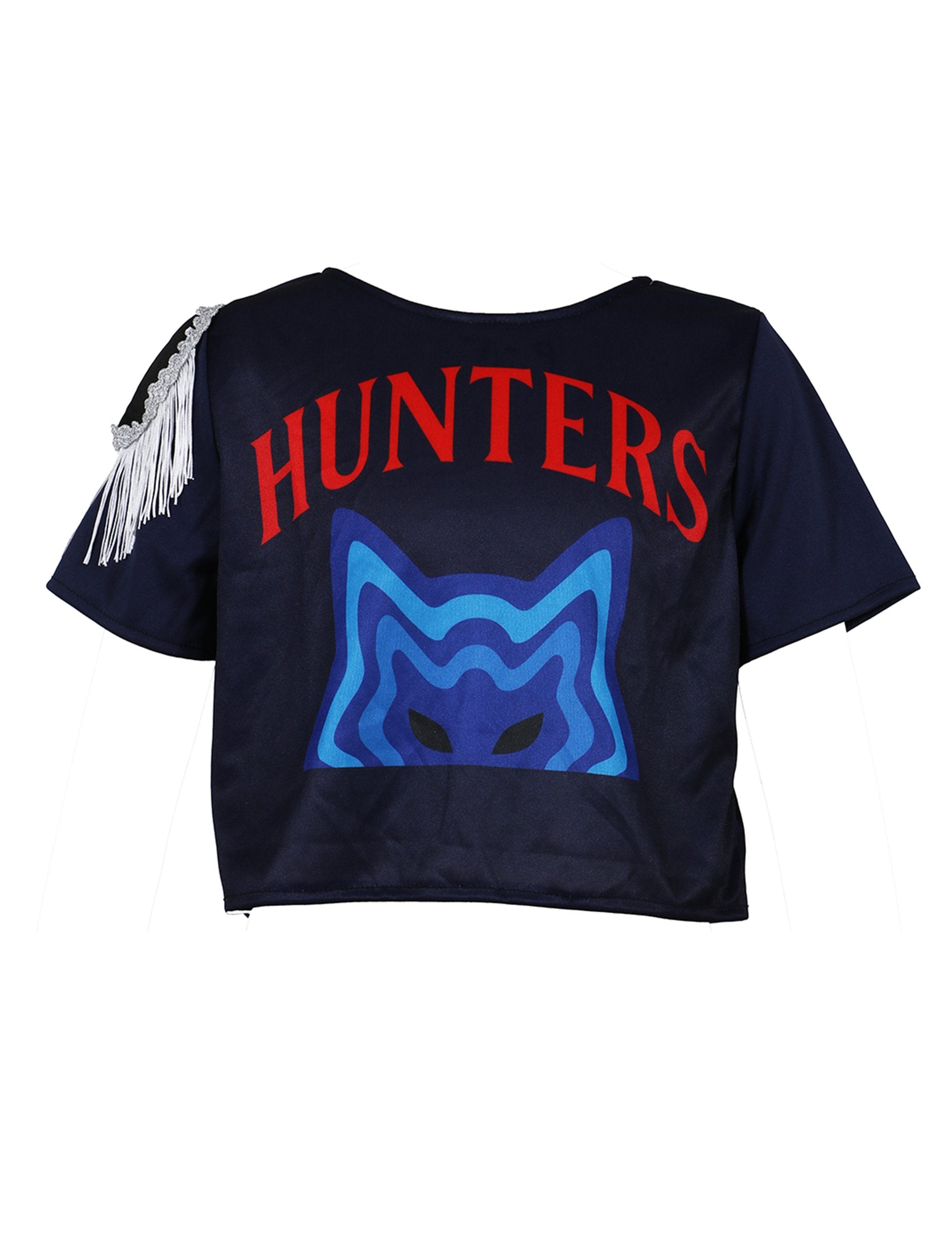 Синият топ е подчертан от великолепни сребърни ресни на раменете, добавяйки нотка блясък и драматичност. Ярката и стилна жълта пола е украсена с изкуствено копче и деликатна верижка, които елегантно допълват облеклото. Накрая, черните чорапи, акцентирани с розови ленти на коленете, добавят модерен и оригинален щрих към ансамбъла.