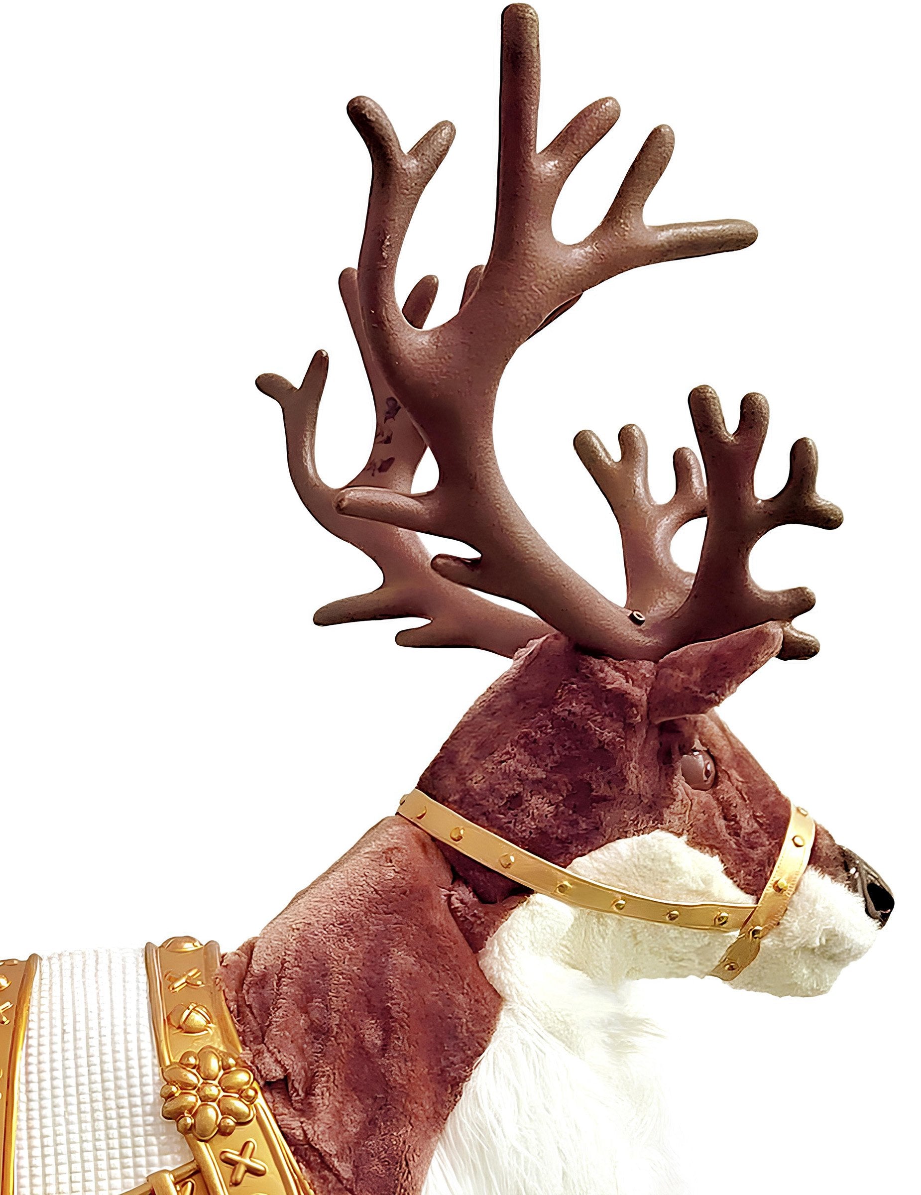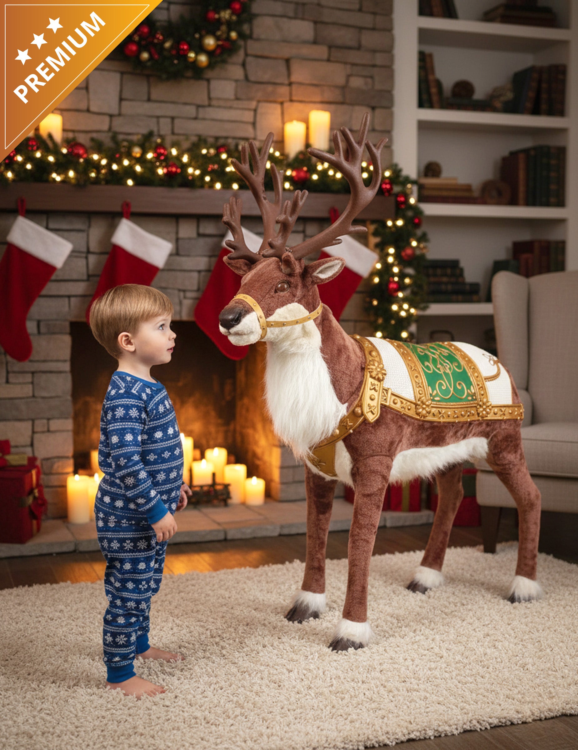 Тази анимирана коледна украса с елени е с размери 143 cm Внесете нотка магия в дома си. С меката си кафява козина, копринено бяла грива и златни и зелени орнаменти, този голям елен изглежда сякаш е излязъл директно от работилницата на Дядо Коледа. Реалистичните му движения на главата и коледните мелодии създават магическа атмосфера, идеална за зарадване на деца и възрастни край коледната елха или камината. Този модел работи с променливотоково захранване 220-240 волта, за лесна и непрекъсната употреба през целия празничен сезон. Идеален за подобряване на празничната ви украса, този величествен елен ще оживи вечерите ви и ще допълни красиво топла и светла коледна обстановка.