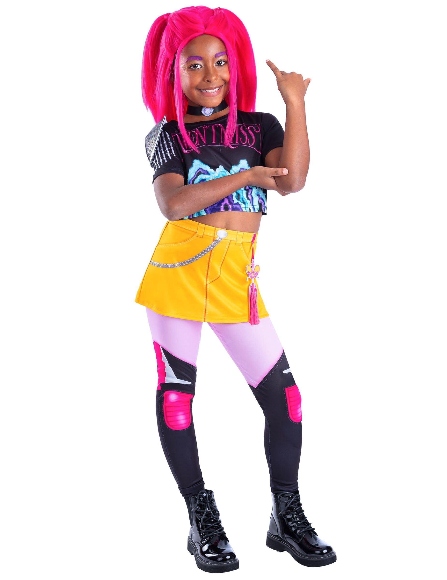 Костюмът Mira Kpop Demon Hunter™ за момиче включва черен топ с принт в сценичен стил, ярко жълта пола, украсена с фантастичен колан, многоцветен клин с графични ефекти и подходящо чокър колие, за да пресъздаде автентично емблематичния стил на героя.