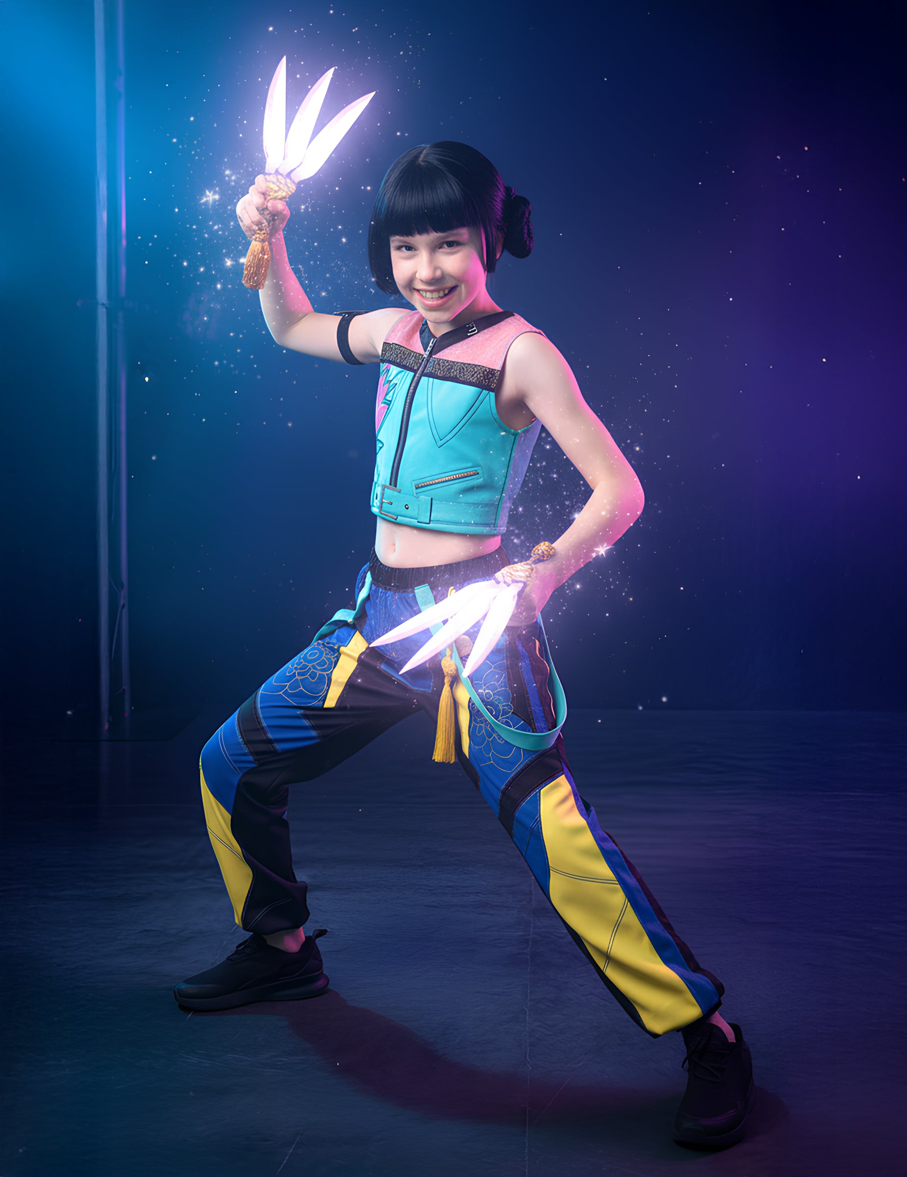 Карнавалният костюм Zoey Kpop Demon Hunter™ за момиче се състои от къс тюркоазен топ, украсен с графични мотиви, и широки пъстри панталони, напомнящи на уличния стил на героинята.