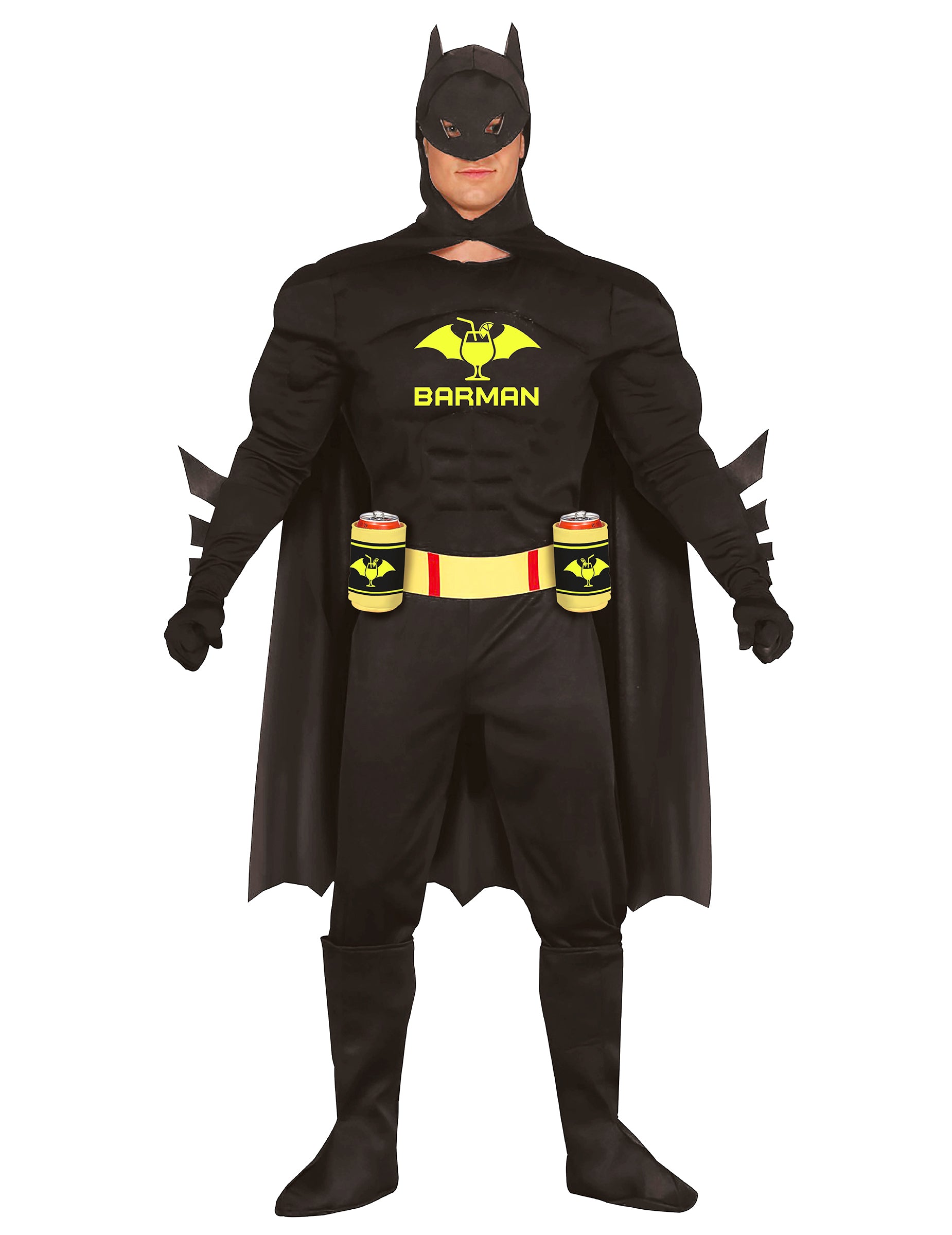 Този костюм за възрастни на барман превръща маскирания герой в краля на партито. Черният гащеризон с мускулест ефект е украсен с жълтото лого на бармана, странен препратка към хумористичния му аналог. Развяващата се пелерина, коланът с поставки за чаши и съответстващата маска допълват оригиналната и празнична визия. Удобен и лесен за носене, той съчетава стил и хумор, за да ви направи звездата на момента. Перфектен костюм за маскирано парти, карнавал или ергенско парти.