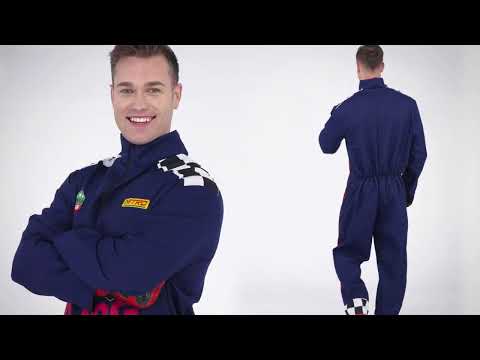 Този костюм на автомобилен състезател за възрастни ще ви превърне в истински шампион на пистите. Тъмносиният цялостен гащеризон е украсен с принтирани детайли в стил спонсори, лого Racing и каре мотиви на раменете и глезените, напомнящи финалните знамена на състезанията.