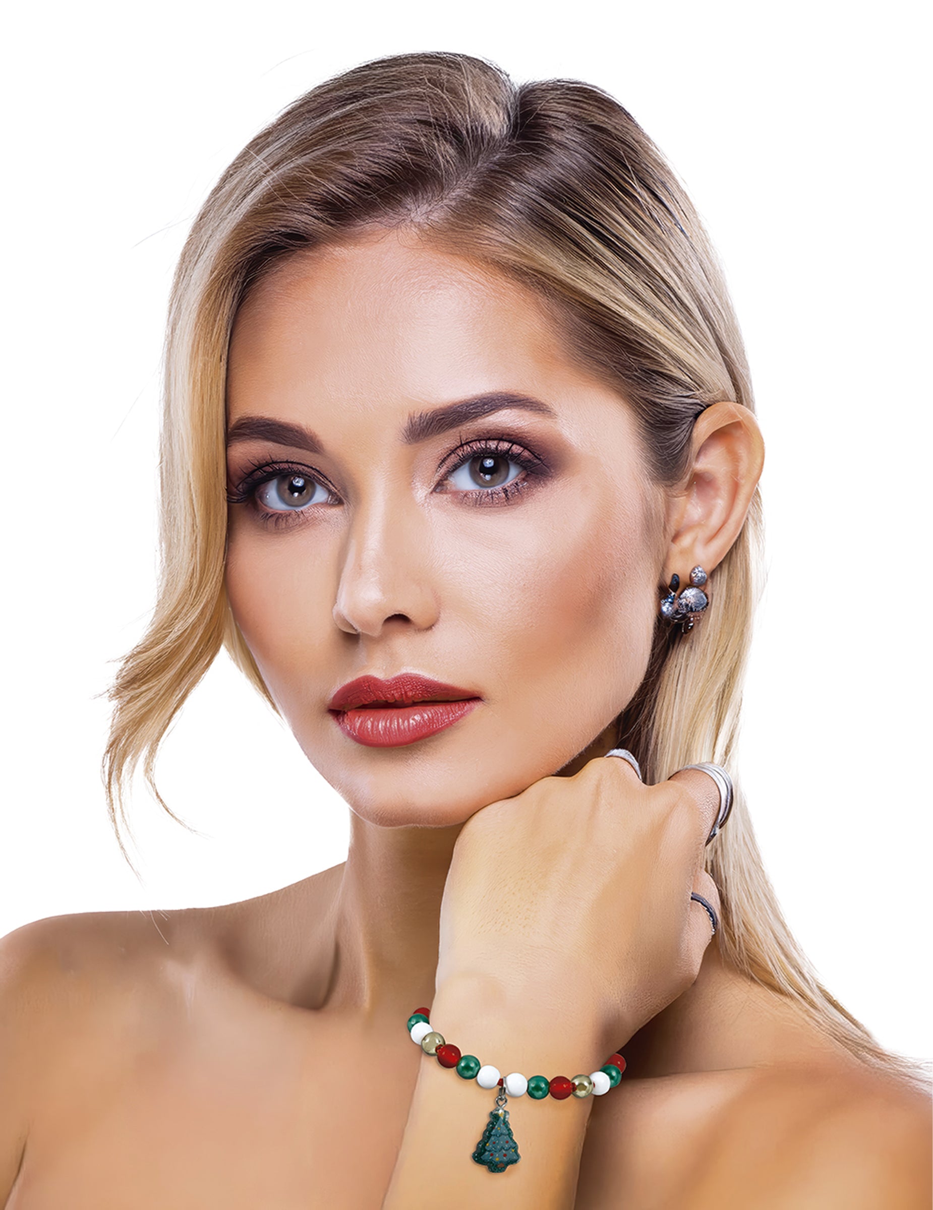 Тази гривна във формата на коледна елха е перфектният аксесоар, който да завърши празничния ви тоалет. Изработена от червени, зелени, бели и златни мъниста, тя е с малка украсена висулка във формата на елха за весел и цветен щрих. Монтирана на регулируем червен шнур, тя лесно пасва на всички размери китки. Идеална е за добавяне на ярък и забавен щрих към вашите коледни тържества, независимо дали сте у дома, в офиса или по време на празнична вечеря.