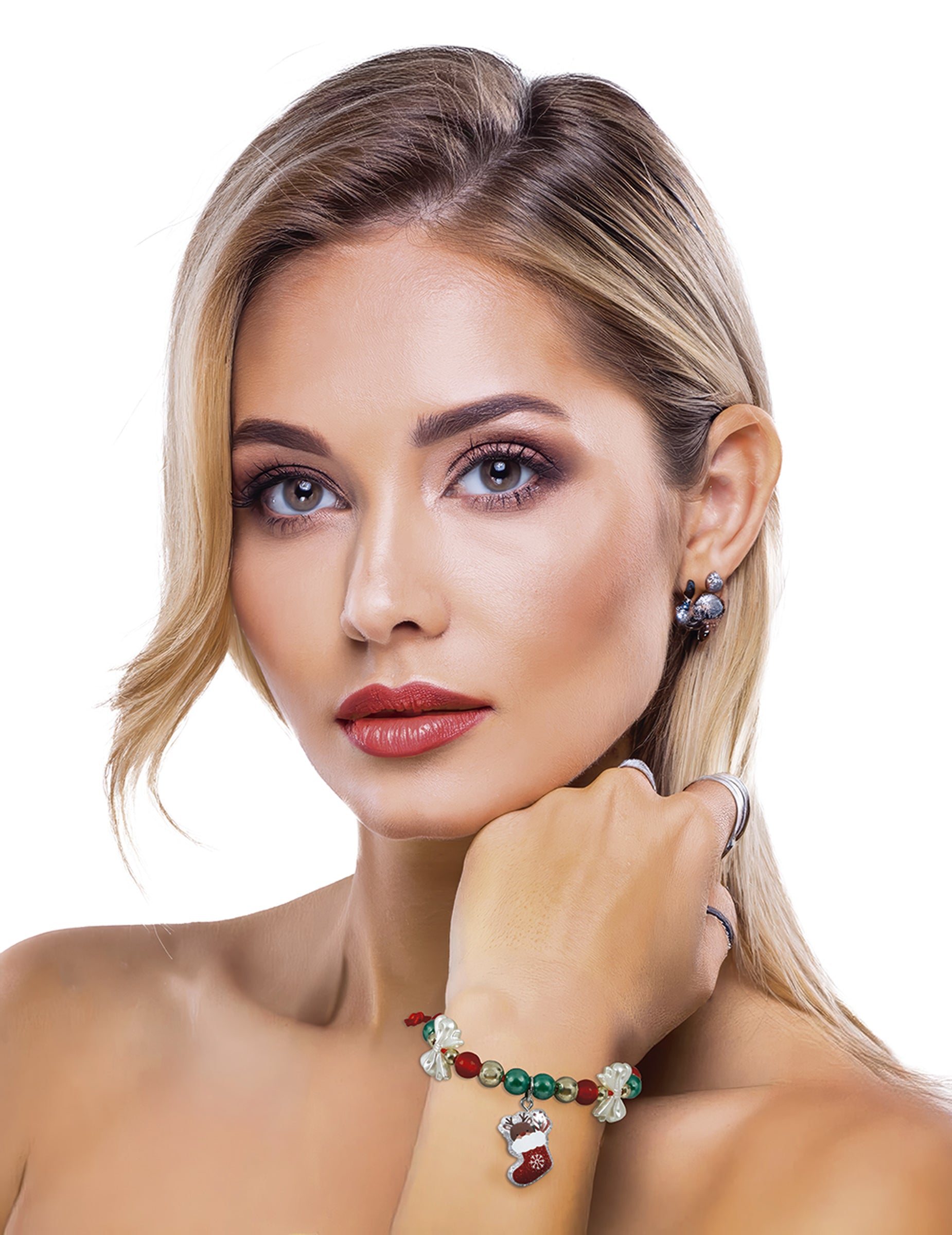 Тази коледна гривна във формата на чорап добавя весел и цветен щрих към вашия празничен тоалет. Изработена от червени, зелени, златни и бели мъниста, тя е украсена с две перлени панделки и коледна висулка във формата на чорап, декорирана с мотив на снежинка. Регулируемата червена връзка осигурява удобно прилягане и се адаптира към всички размери на китката. Идеална е за аксесоариране на вашите коледни партита, празнични ястия или за подаряване на малък подарък, изпълнен с празнично настроение.