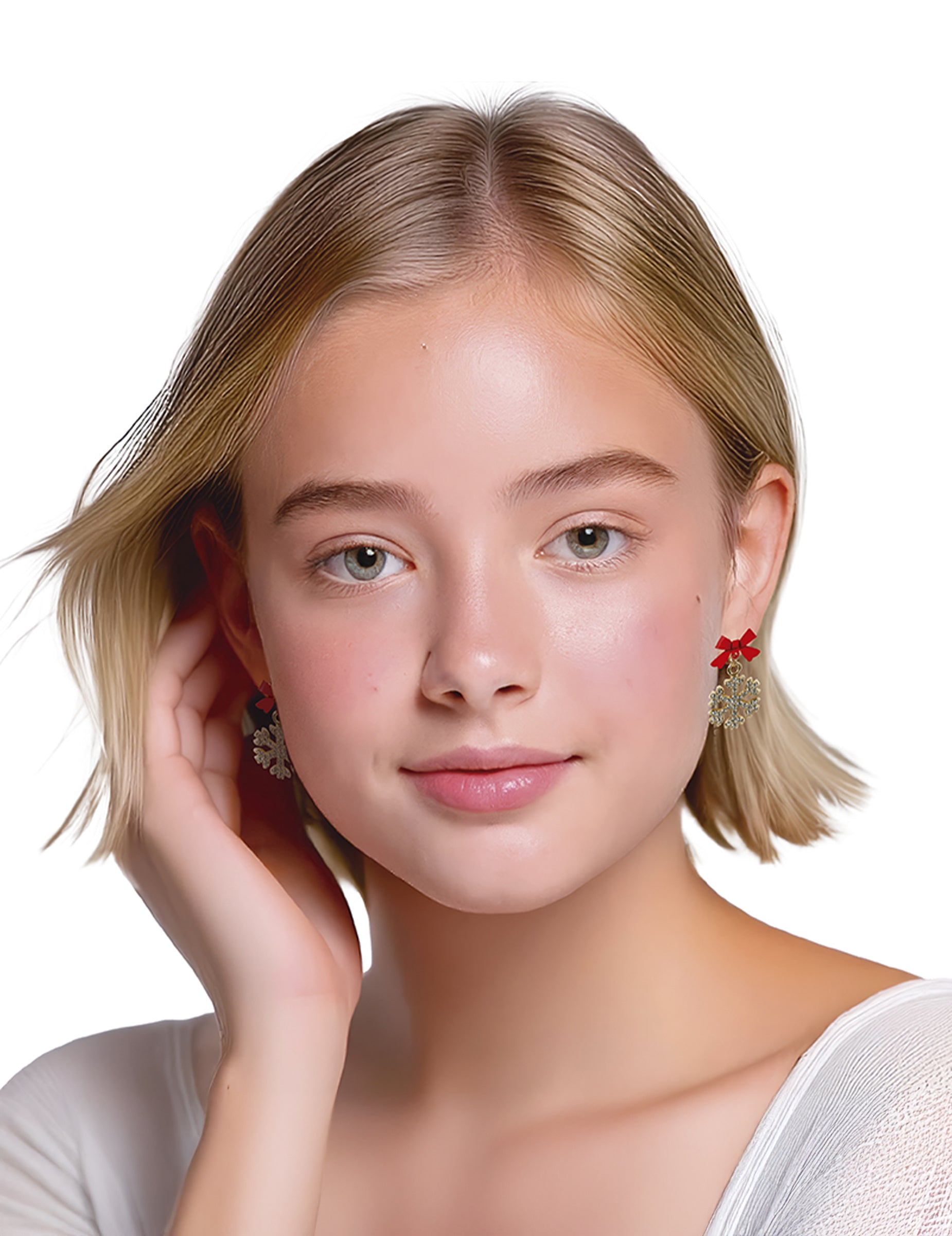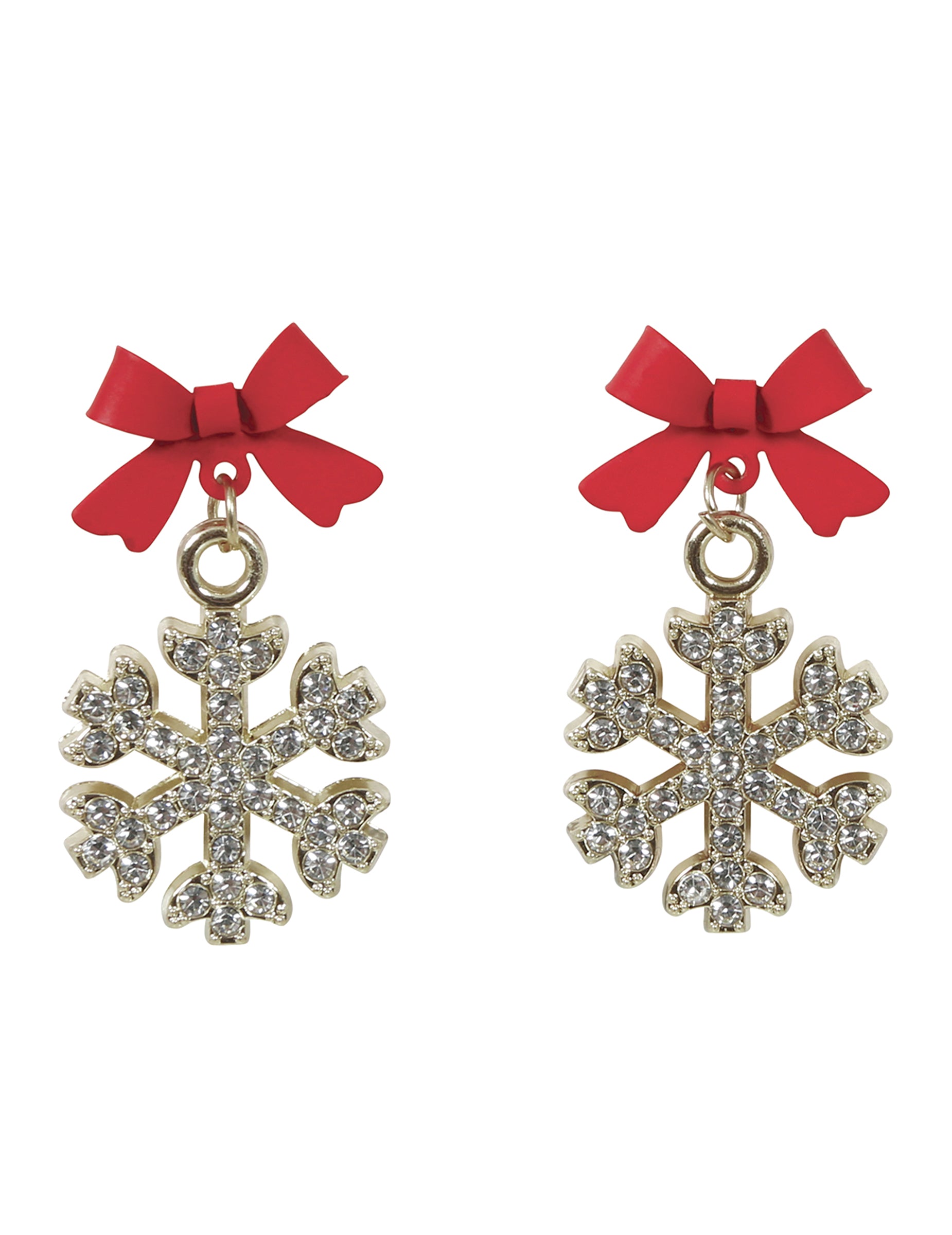 Тези блестящи метални обеци във формата на снежинка добавят елегантен и искрящ щрих към вашите празнични тоалети. Всяка златна снежинка е украсена с червена панделка, която напомня за магията на Коледа и деликатно осветява лицето ви. Леки и удобни, те могат да се носят лесно през целия ден или за празнична вечер. Перфектно бижу, което да завърши вашия коледен стил с изтънченост и оригиналност.